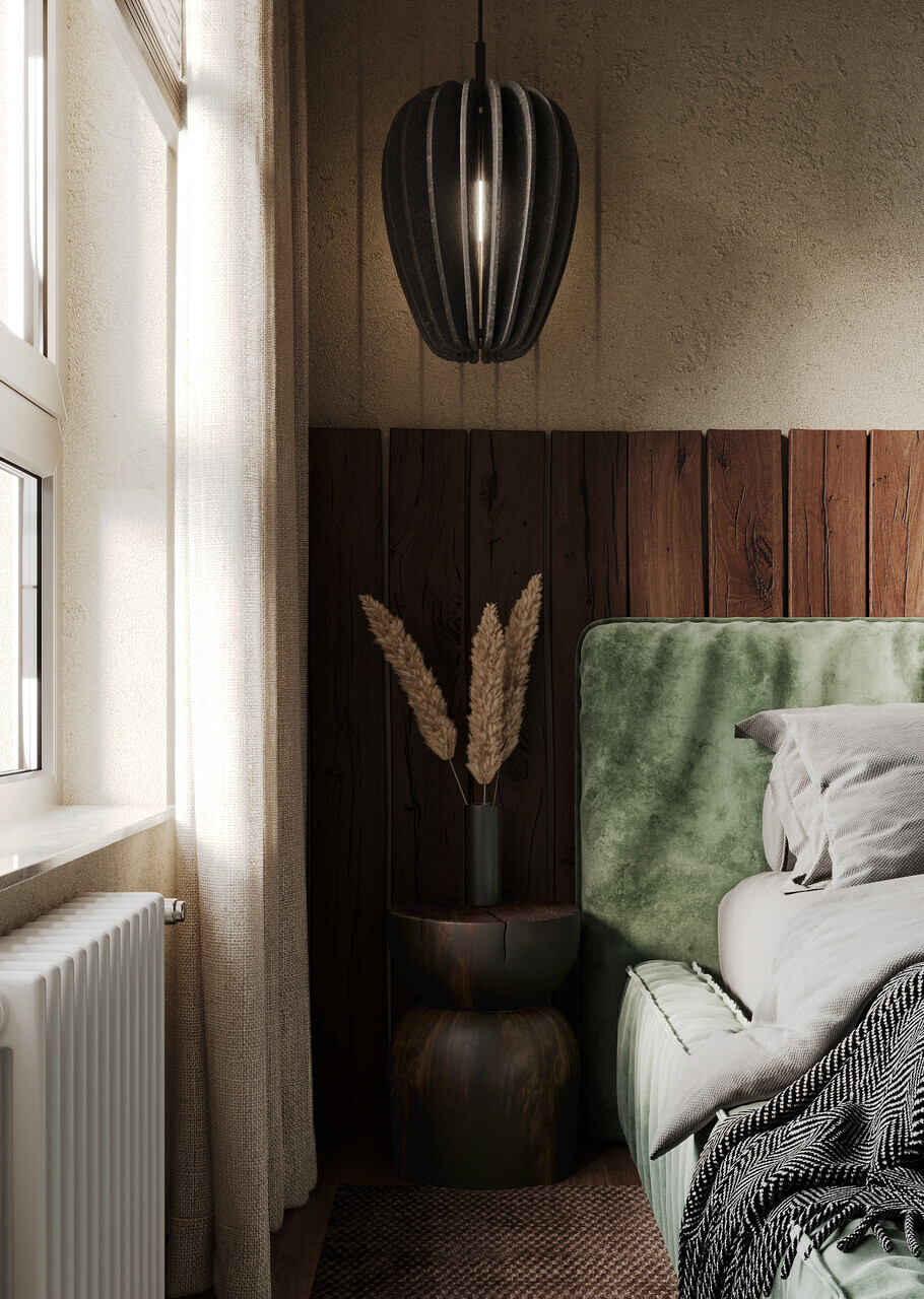 Концепция: Основная концепция заключалась в трансформации вытянутого помещения в гармоничное и функциональное пространство. Особое внимание уделено сохранению естественного освещения через витражи и эффективному зонированию с помощью перегородок. Использование простых, но высококачественных материалов, в сочетании с уникальными предметами ручной работы – от мебели до освещения с элементами макраме и 'люстр-гнезд' – сформировало исключительный авторский дизайн, недоступный в массовом производстве.