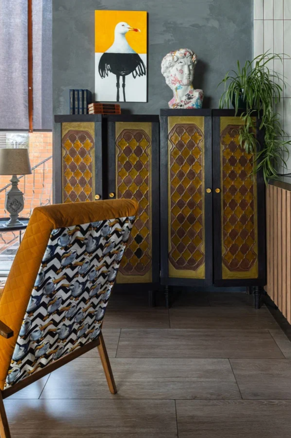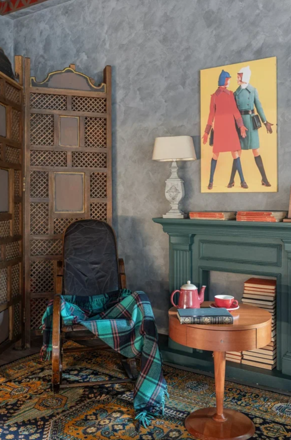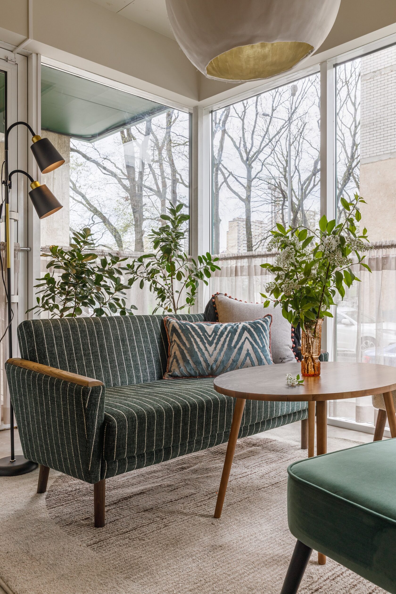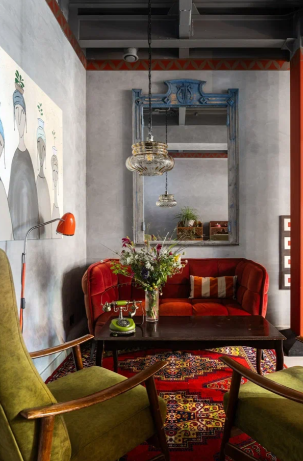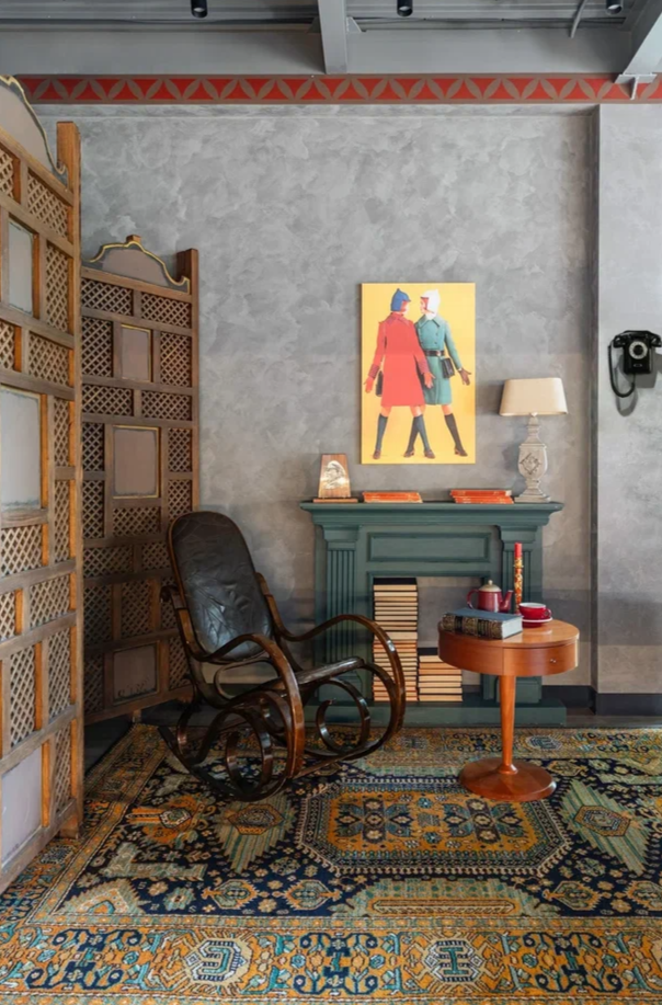 Мебель и декор собирали по крупицам со всей страны — винтажные стулья, советские ковры, резные деревянные элементы. Всё это создаёт атмосферу «как у бабушки», но с современным twist. Даже кирпичные стены и зелёные акценты отсылают к виду из окна, связывая интерьер с окружающим пространством.