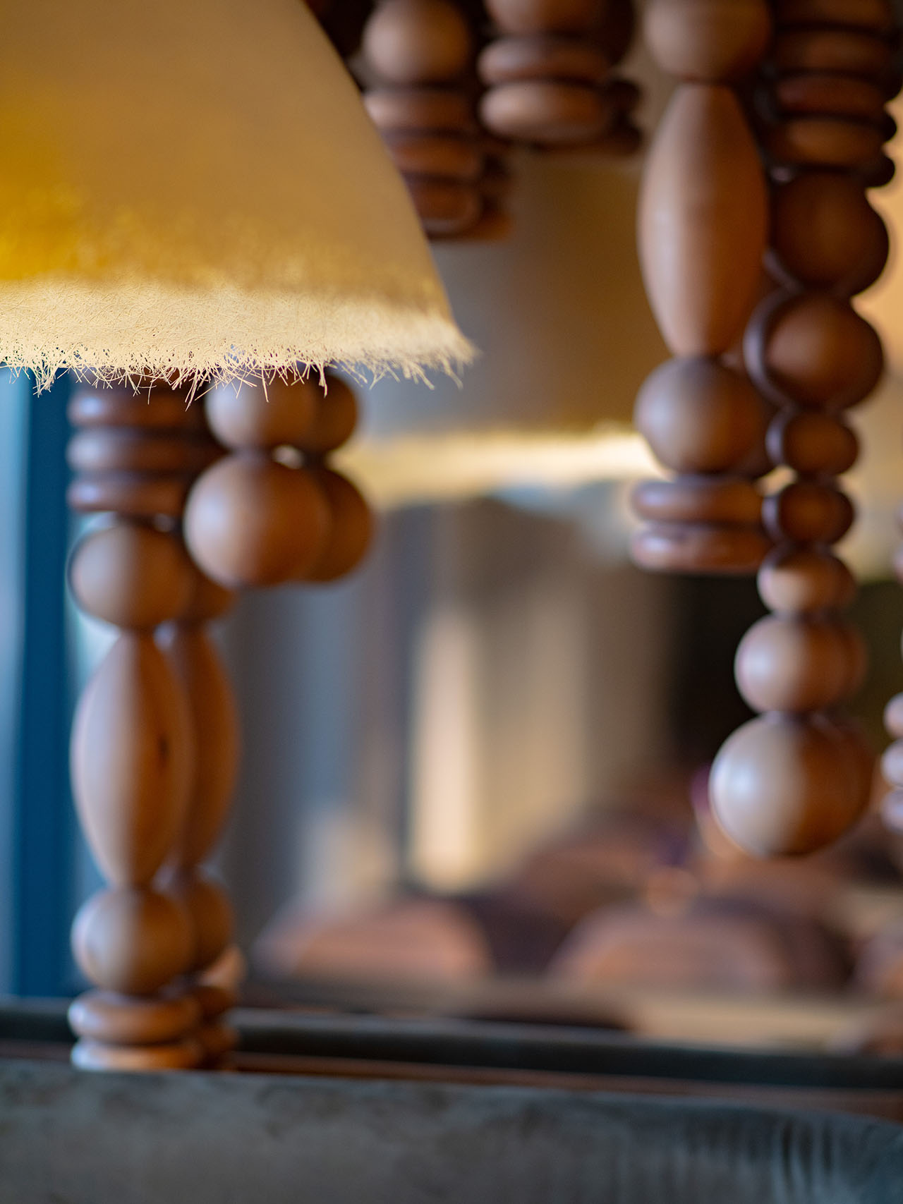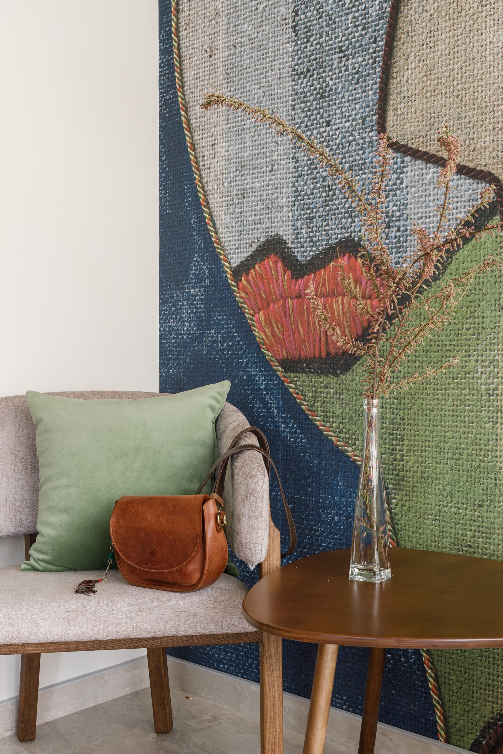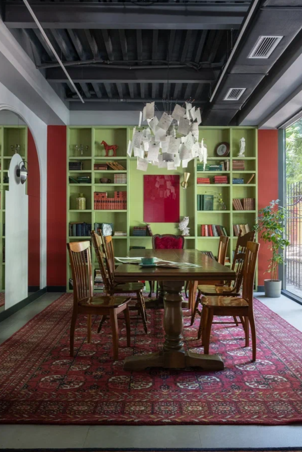 Мебель и декор собирали по крупицам со всей страны — винтажные стулья, советские ковры, резные деревянные элементы. Всё это создаёт атмосферу «как у бабушки», но с современным twist. Даже кирпичные стены и зелёные акценты отсылают к виду из окна, связывая интерьер с окружающим пространством.
