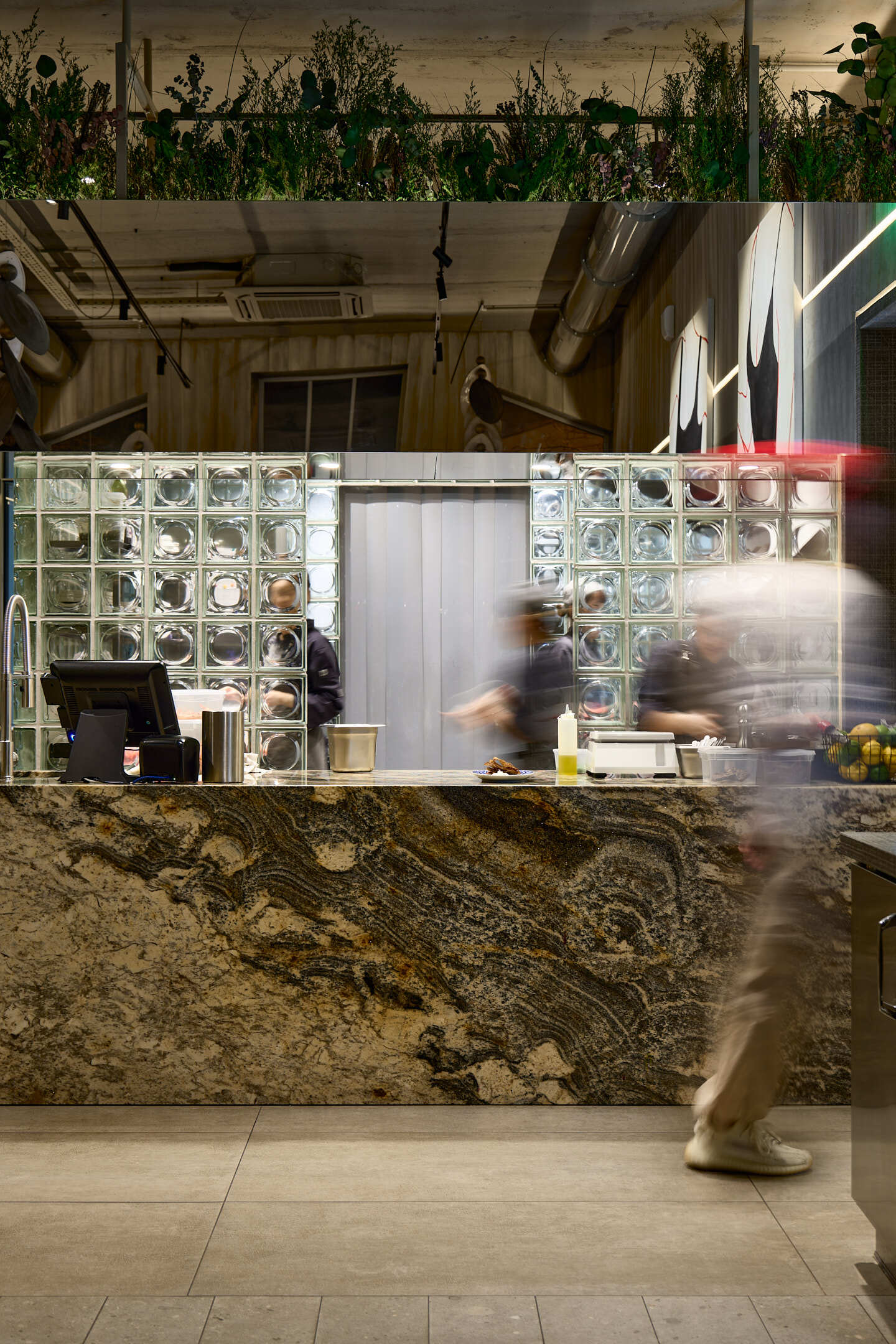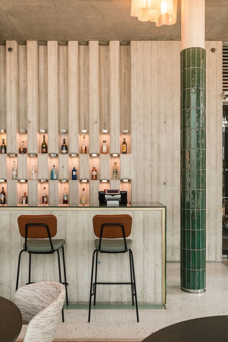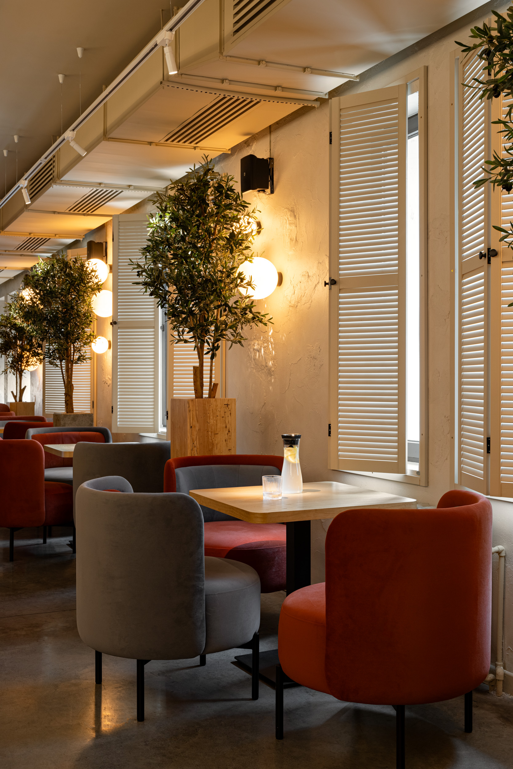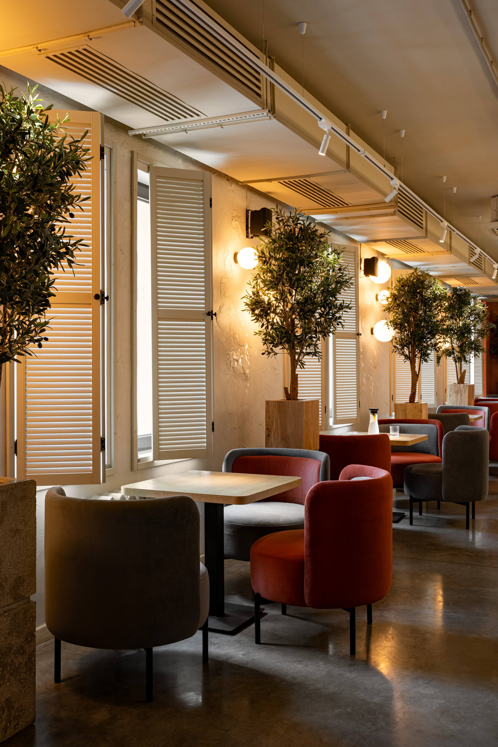 Концепция: В основе концепции лежит глубокое уважение к историческому контексту и существующим архитектурным элементам. Бережно сохраненные и отшлифованные колонны и ригели из бетона терраццо, а также потолок из бетонных панелей, стали отправной точкой. Центральным акцентом интерьера выступает винтажное деревянное панно с изображением солнца, вокруг которого выстраивается функциональная и эстетическая композиция. Барная зона, расположенная перпендикулярно панно, гармонично сочетает открытую кухню и низкую стойку для максимального взаимодействия, а ее отделка вторит деревянным панелям. Полупрозрачные белые стеклянные панели с внутренней подсветкой обертывают бетонные и металлические конструкции, создавая многослойность без перегрузки. Пол выполнен из Scarpa mosaic – мраморной крошки, напоминающей об утраченном оригинальном покрытии. Стены из алюминиевых панелей обеспечивают динамику игры отражений. Фасадное распашное остекление полностью объединяет интерьер с террасой. Пространство обогащено уникальными акцентами: подвесной «Луной» от Davide Groppi, винтажной мебелью из Нидерландов и оригинальными решениями в санузлах, включая цветную сантехнику и лайтбоксы. Интеграция живых плодовых деревьев символизирует связь с локальной культурой и натуральными фермерскими продуктами.