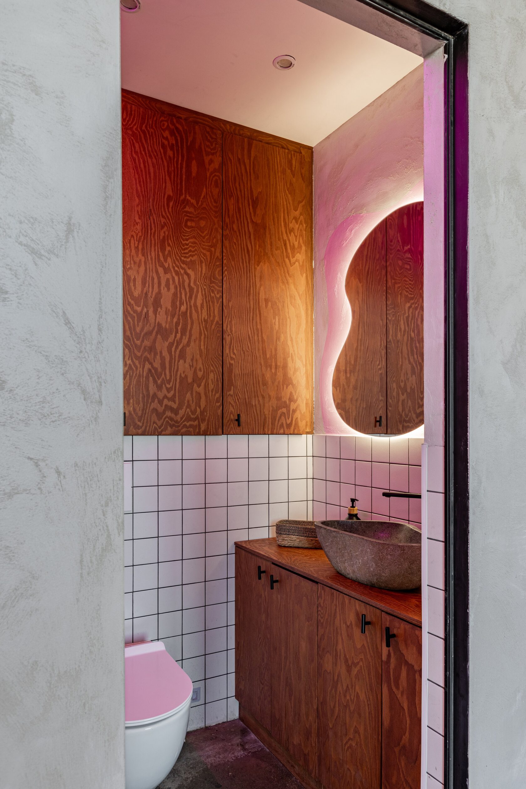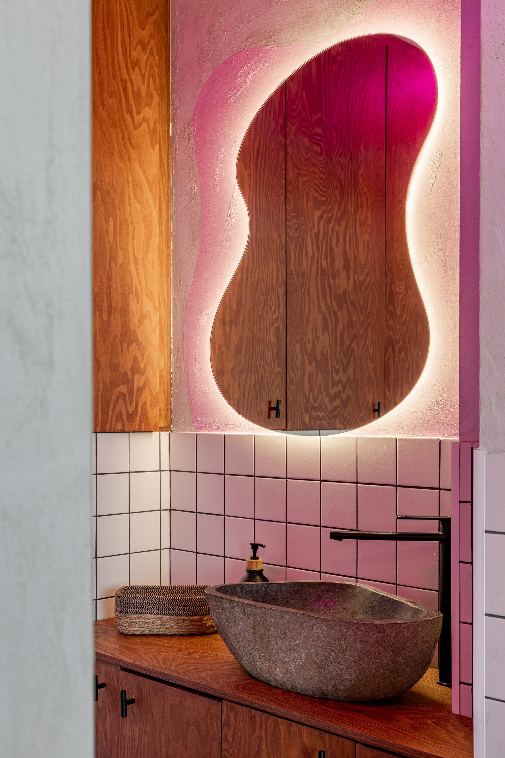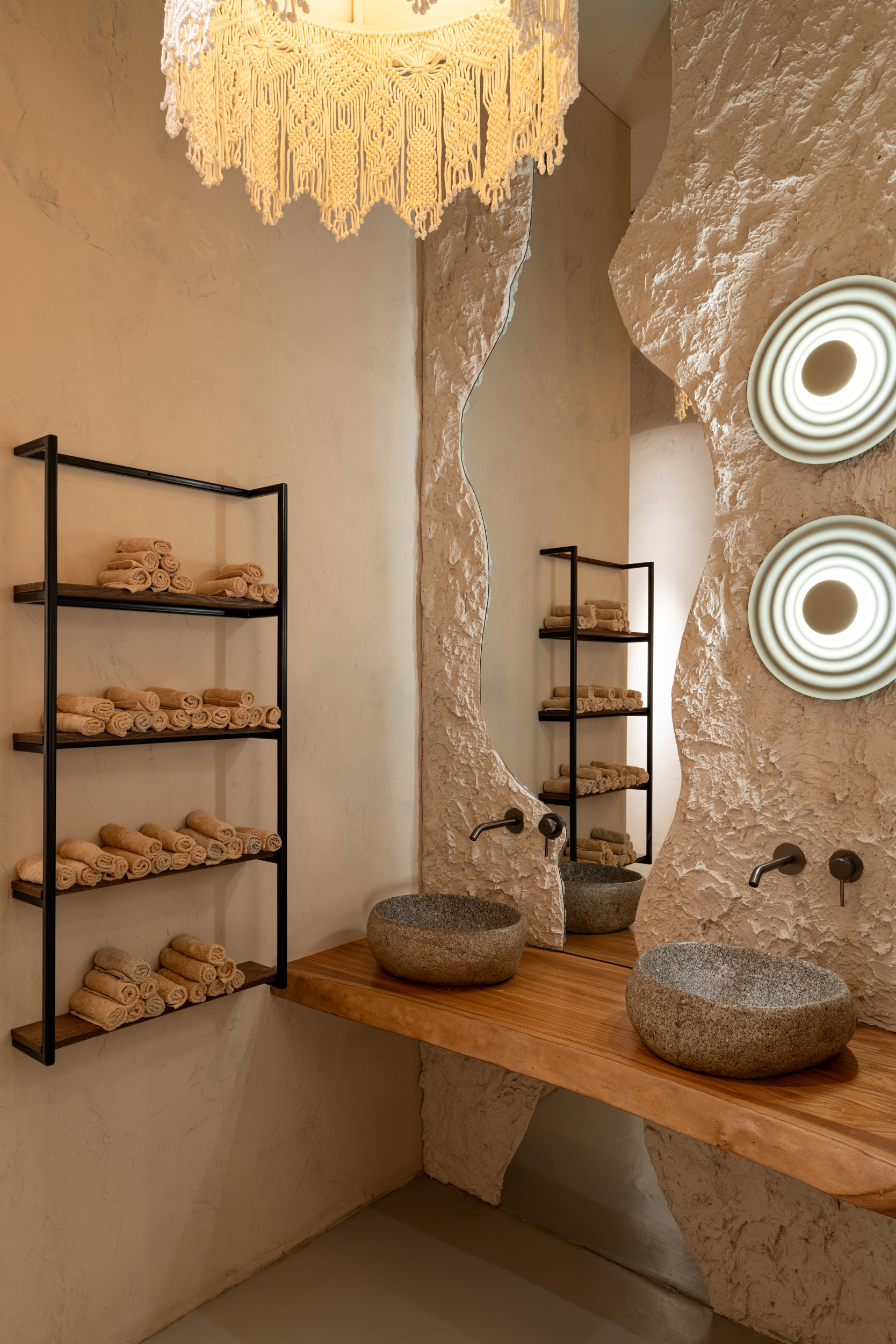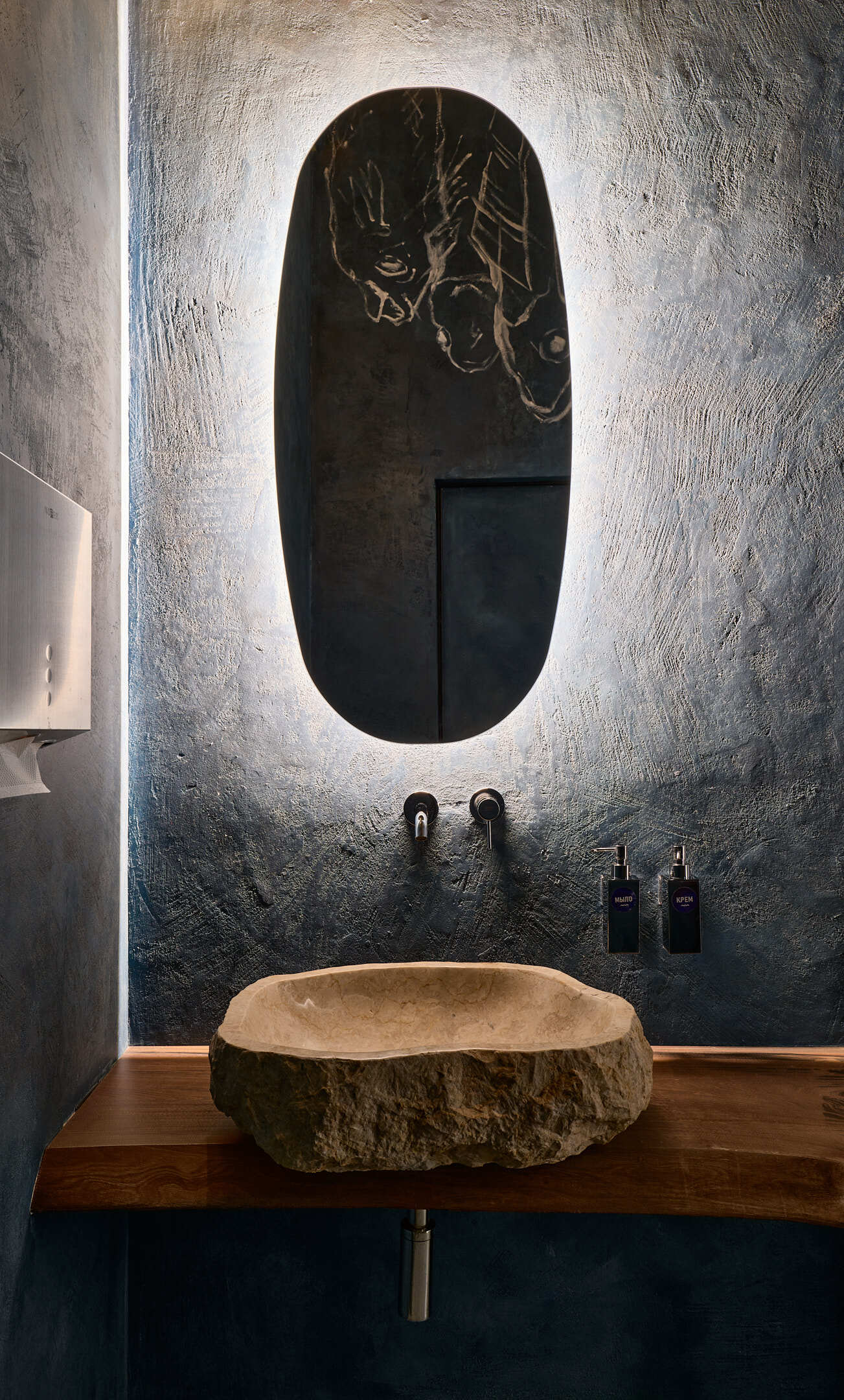 Концепция: В основе концепции лежит глубокое уважение к историческому контексту и существующим архитектурным элементам. Бережно сохраненные и отшлифованные колонны и ригели из бетона терраццо, а также потолок из бетонных панелей, стали отправной точкой. Центральным акцентом интерьера выступает винтажное деревянное панно с изображением солнца, вокруг которого выстраивается функциональная и эстетическая композиция. Барная зона, расположенная перпендикулярно панно, гармонично сочетает открытую кухню и низкую стойку для максимального взаимодействия, а ее отделка вторит деревянным панелям. Полупрозрачные белые стеклянные панели с внутренней подсветкой обертывают бетонные и металлические конструкции, создавая многослойность без перегрузки. Пол выполнен из Scarpa mosaic – мраморной крошки, напоминающей об утраченном оригинальном покрытии. Стены из алюминиевых панелей обеспечивают динамику игры отражений. Фасадное распашное остекление полностью объединяет интерьер с террасой. Пространство обогащено уникальными акцентами: подвесной «Луной» от Davide Groppi, винтажной мебелью из Нидерландов и оригинальными решениями в санузлах, включая цветную сантехнику и лайтбоксы. Интеграция живых плодовых деревьев символизирует связь с локальной культурой и натуральными фермерскими продуктами.