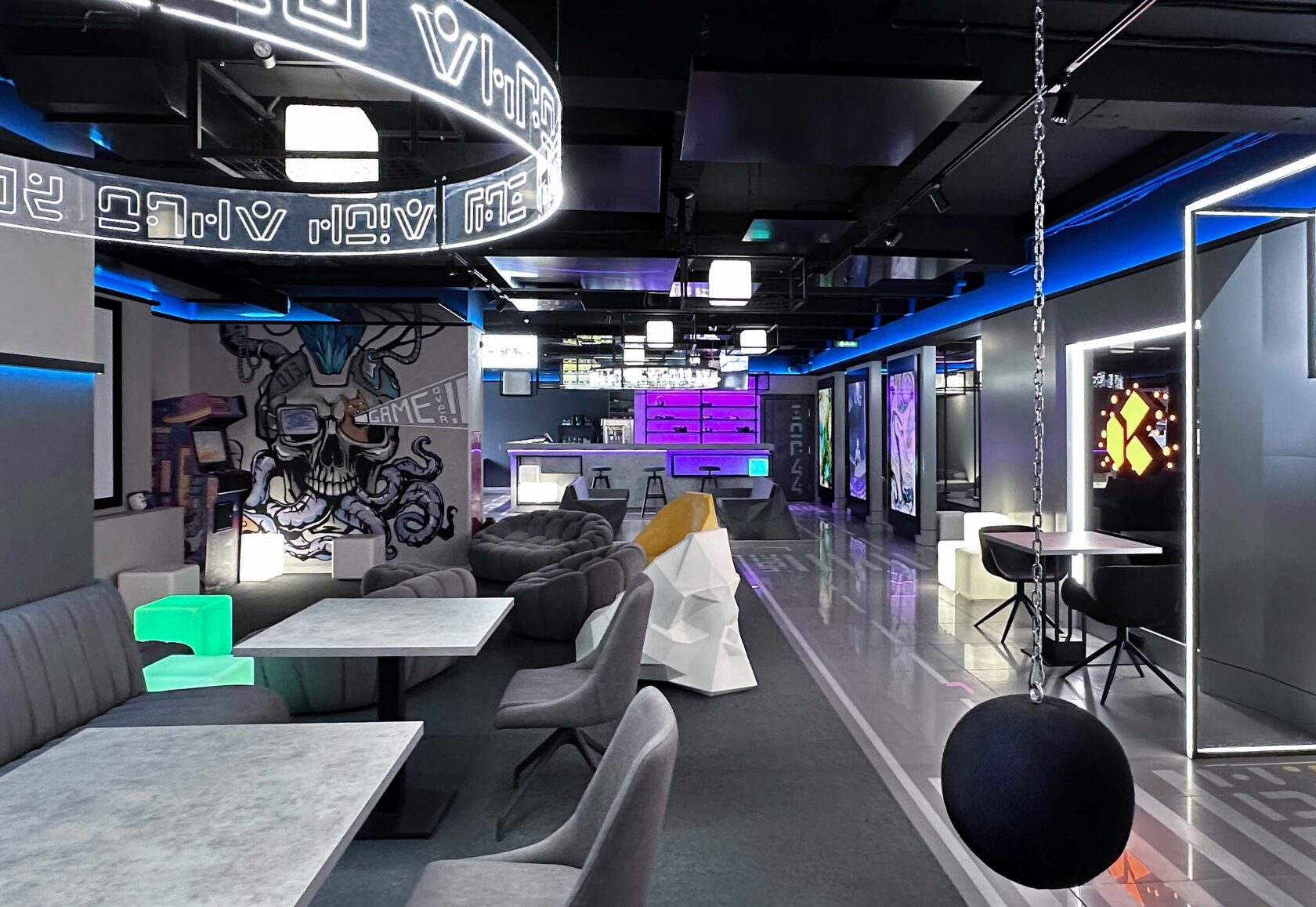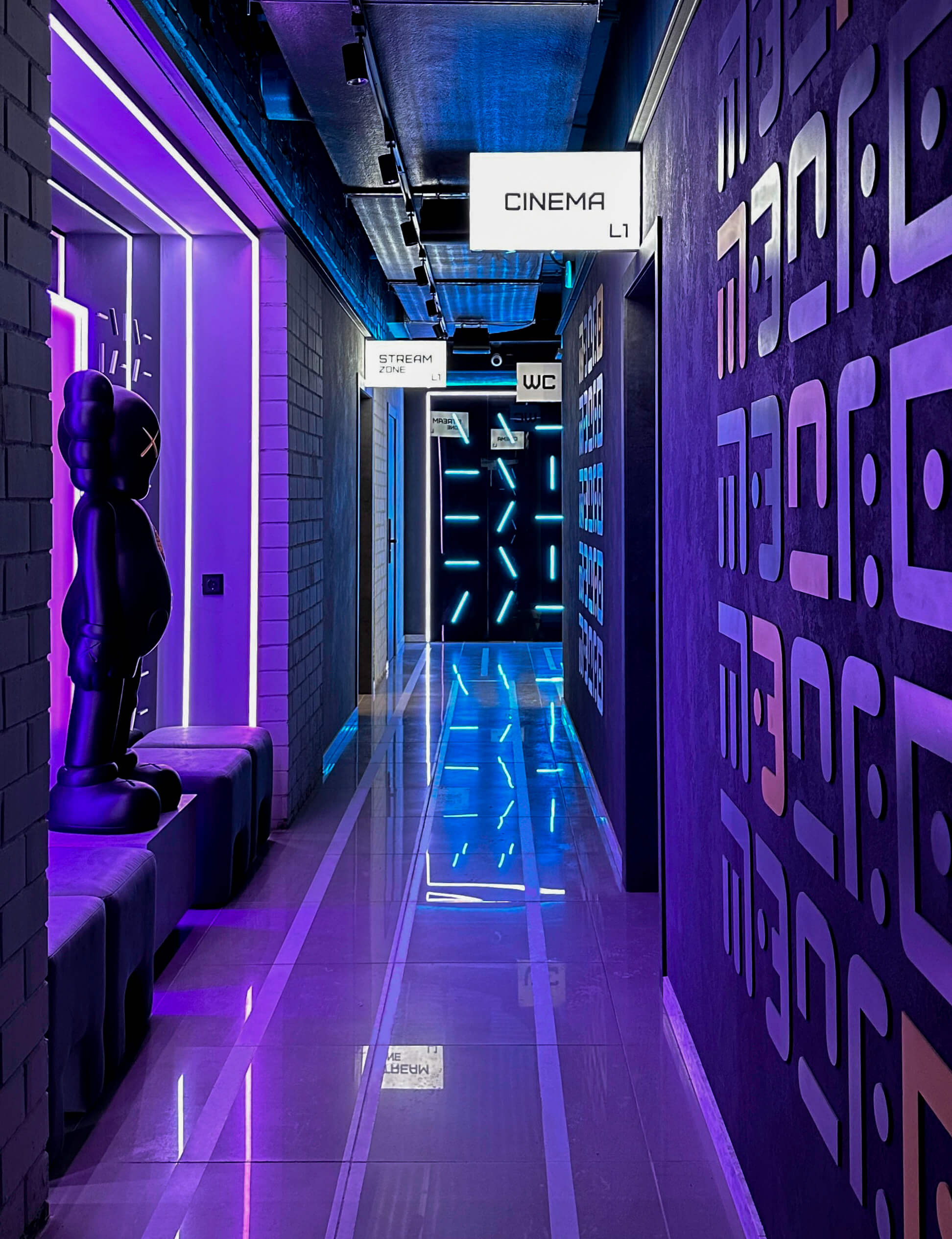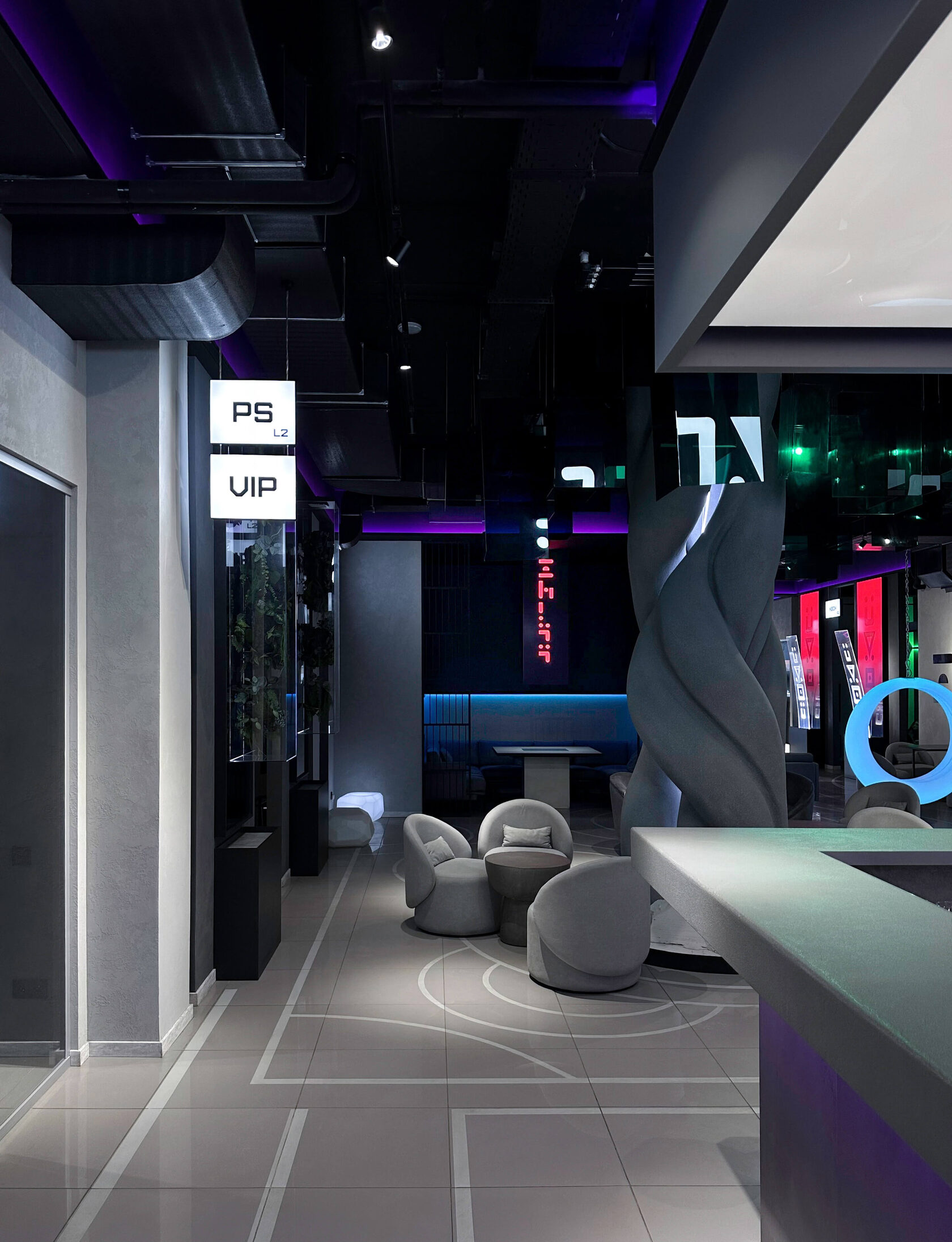 Территория площадью 1300 м² была переосмыслена и преобразована в уникальное киберпространство. Первый этаж представляет виртуальный город с элементами мегаполиса: пешеходными зонами, дорожными развязками и неоновыми вывесками на выдуманном языке. Монохромный интерьер с яркой подсветкой создает атмосферу футуристического мегаполиса. Второй этаж (18+) оформлен в светлых, спокойных тонах и представляет «сад камней» на крыше небоскрёба — умиротворённое пространство для отдыха от городской суеты. На обоих этажах расположены игровые зоны премиум-класса, кафе и лаунж-зоны, позволяющие проводить мероприятия, стримы, вечер кино или караоке.