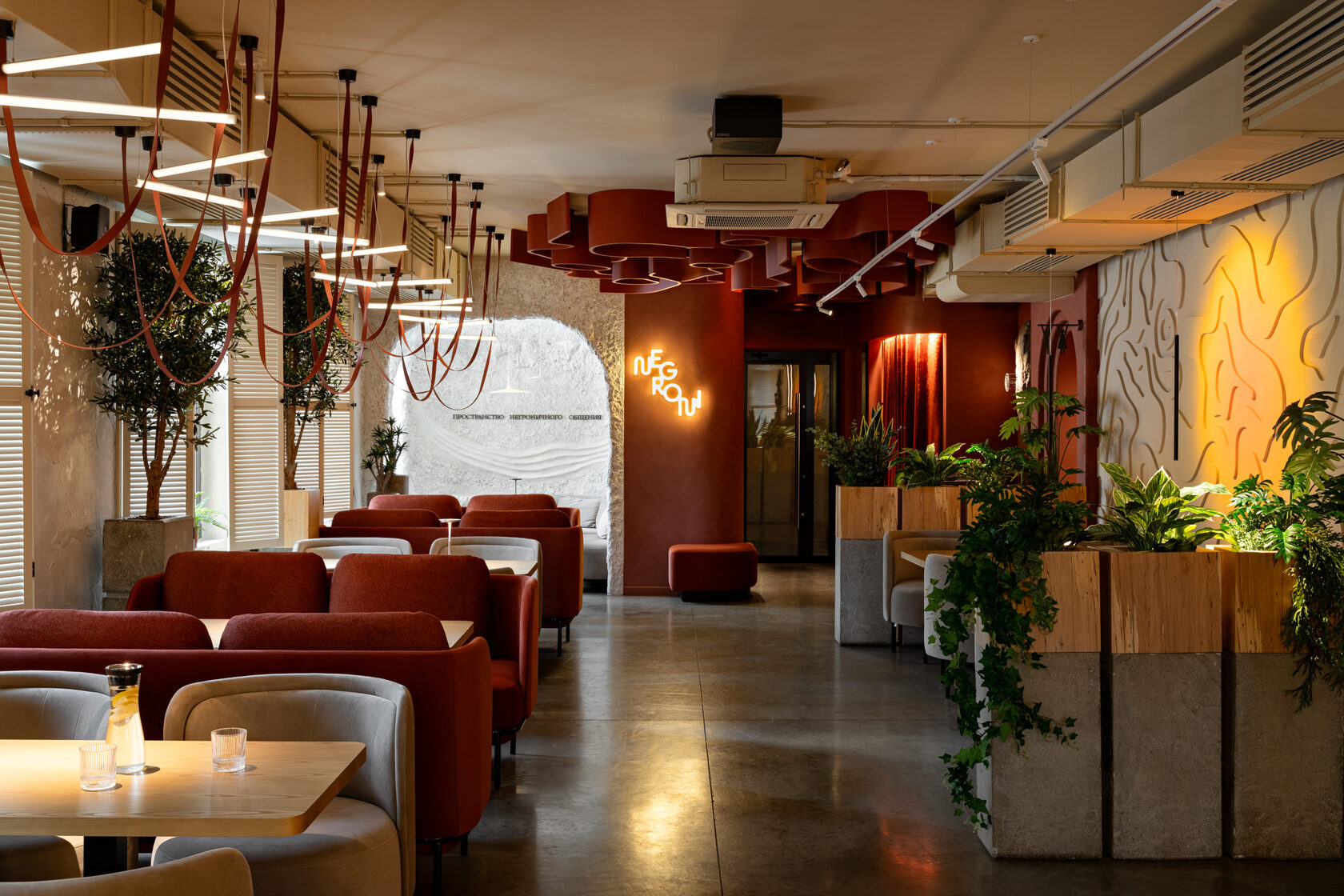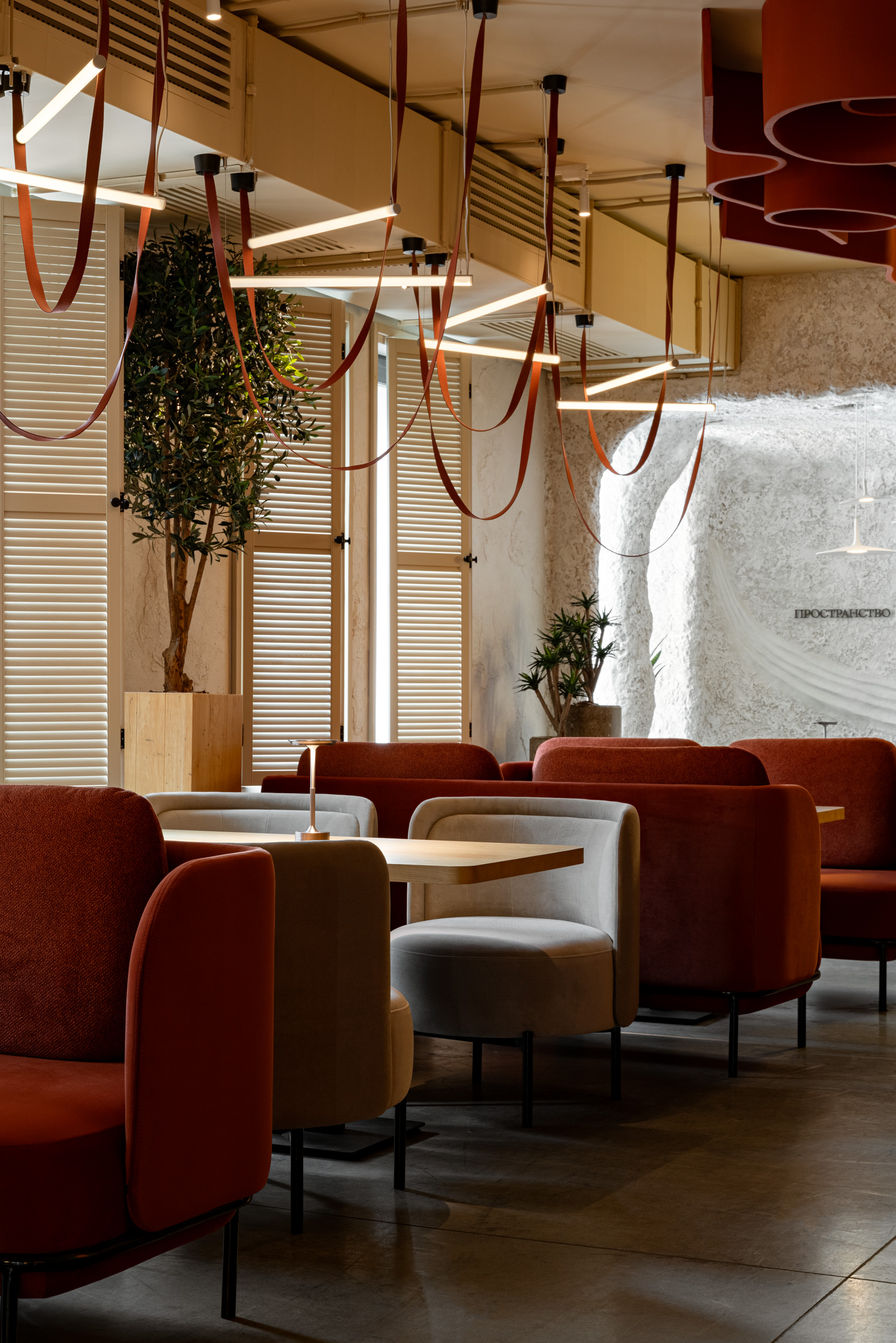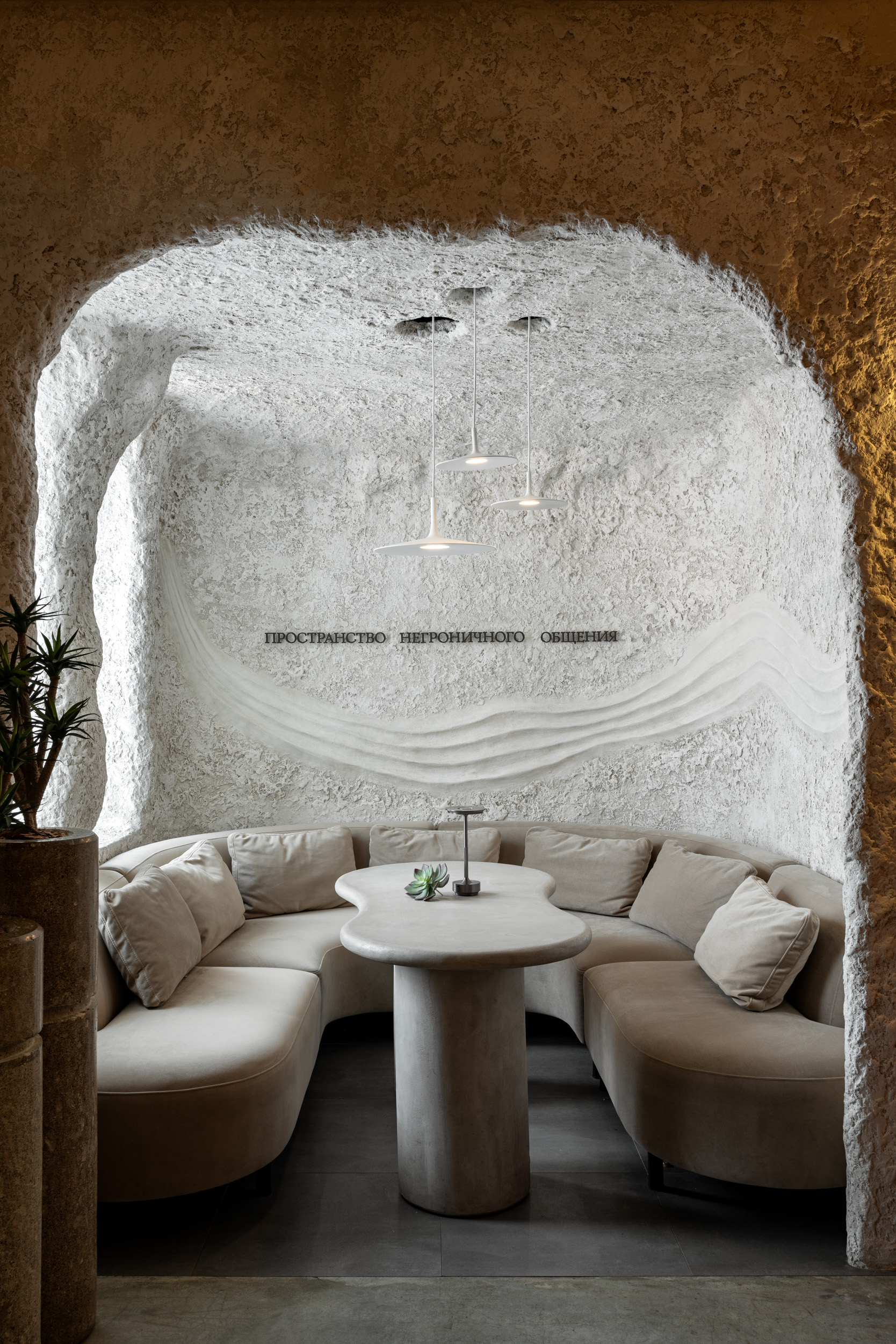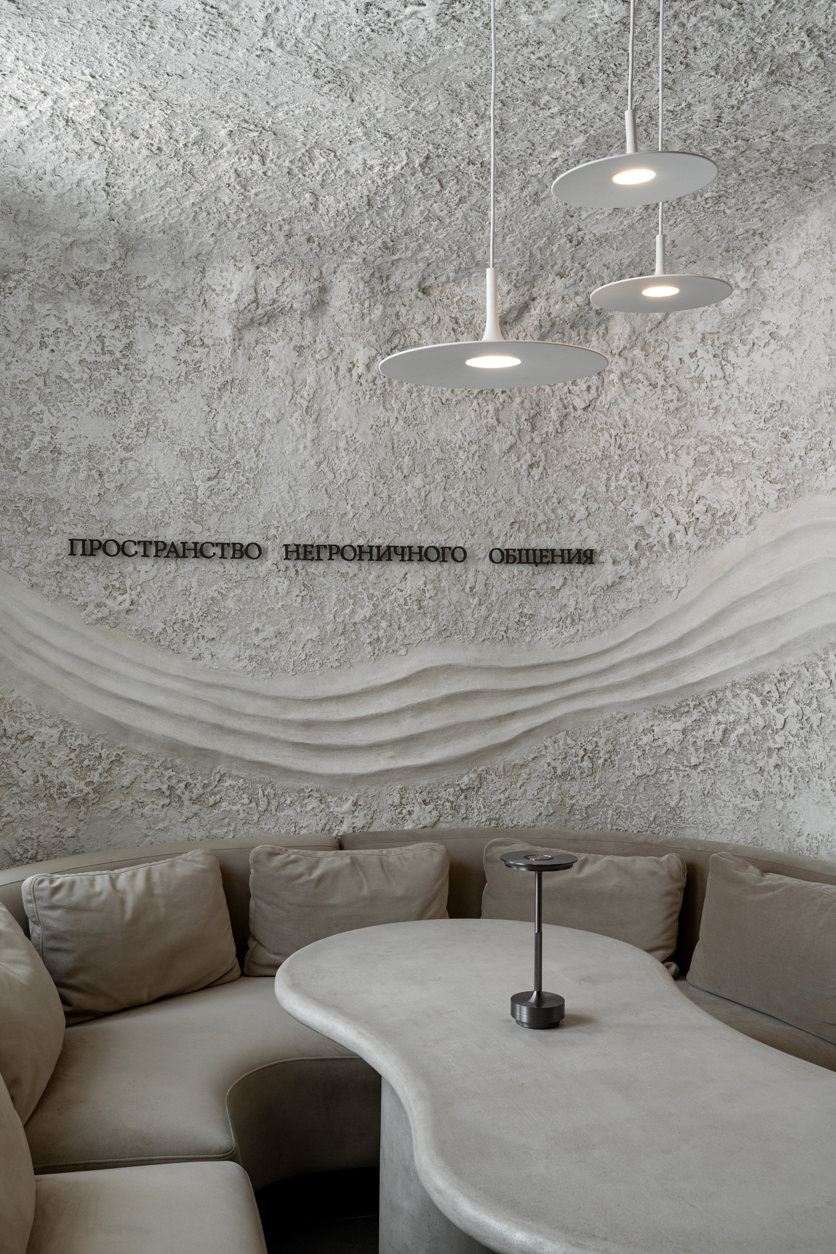 Концепция: Основная концепция проекта — воссоздание аутентичной итальянской атмосферы с акцентом на средиземноморский колорит. Дизайнеры умело использовали оранжевые и терракотовые оттенки, контрастирующие со светлым известковым фоном, а также мягкие формы для создания уютного пространства. Сложная задача зонирования П-образного помещения была решена через многофункциональные зоны: от бизнес-встреч до приватных уголков и игровых комнат, включая эффектную VIP-зону в виде грота. Интерьер обогащен уникальными стилеобразующими элементами: световыми шарами, авторскими настенными паттернами ручной росписи, рельефными стенами и мягкими потолочными лепестками терракотового цвета, каждая деталь которых тщательно подобрана для передачи утонченности и оригинальности.
