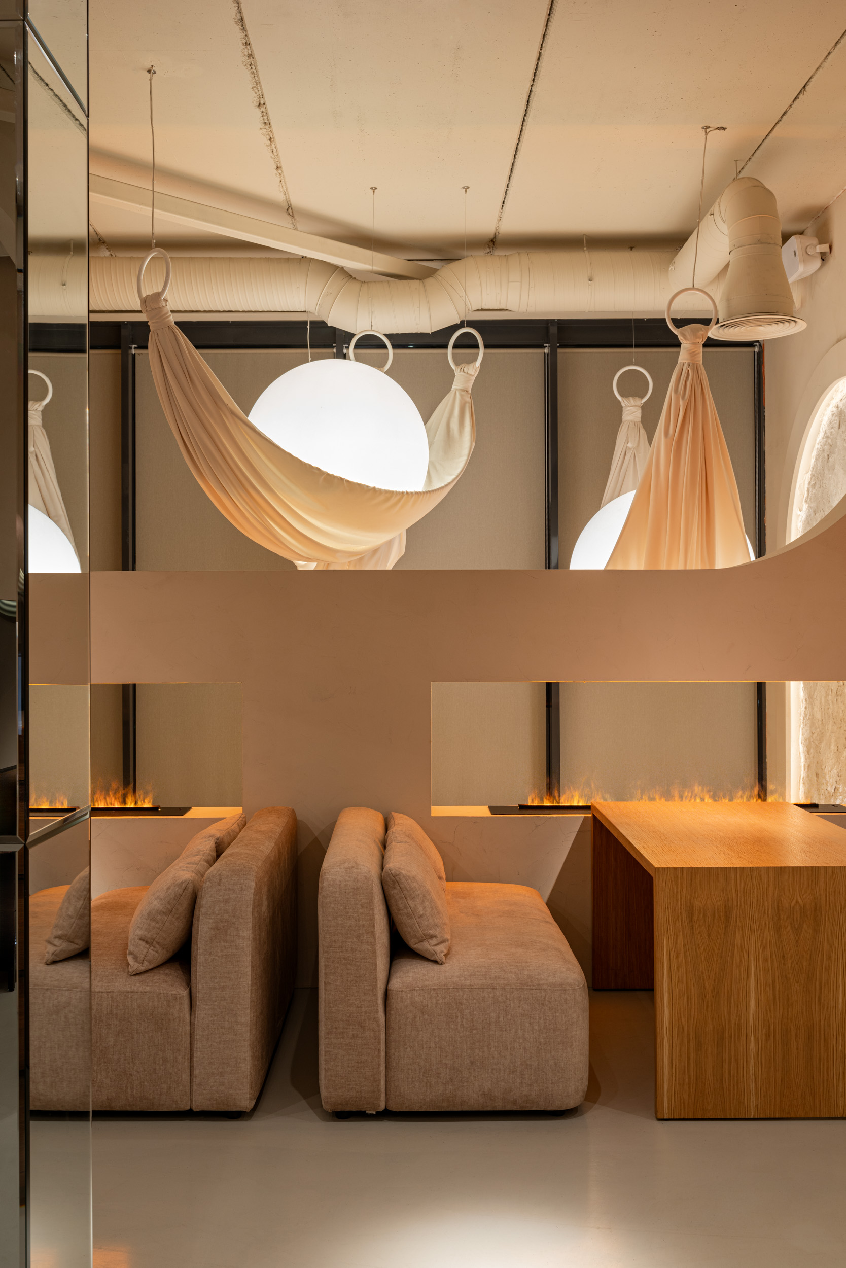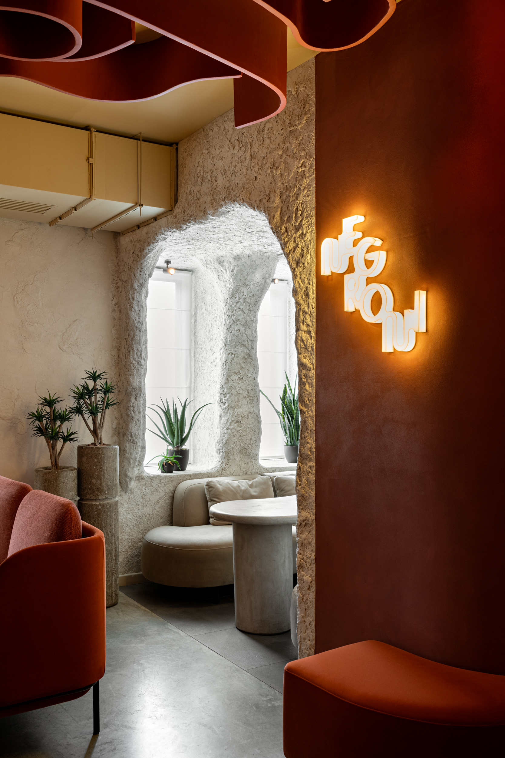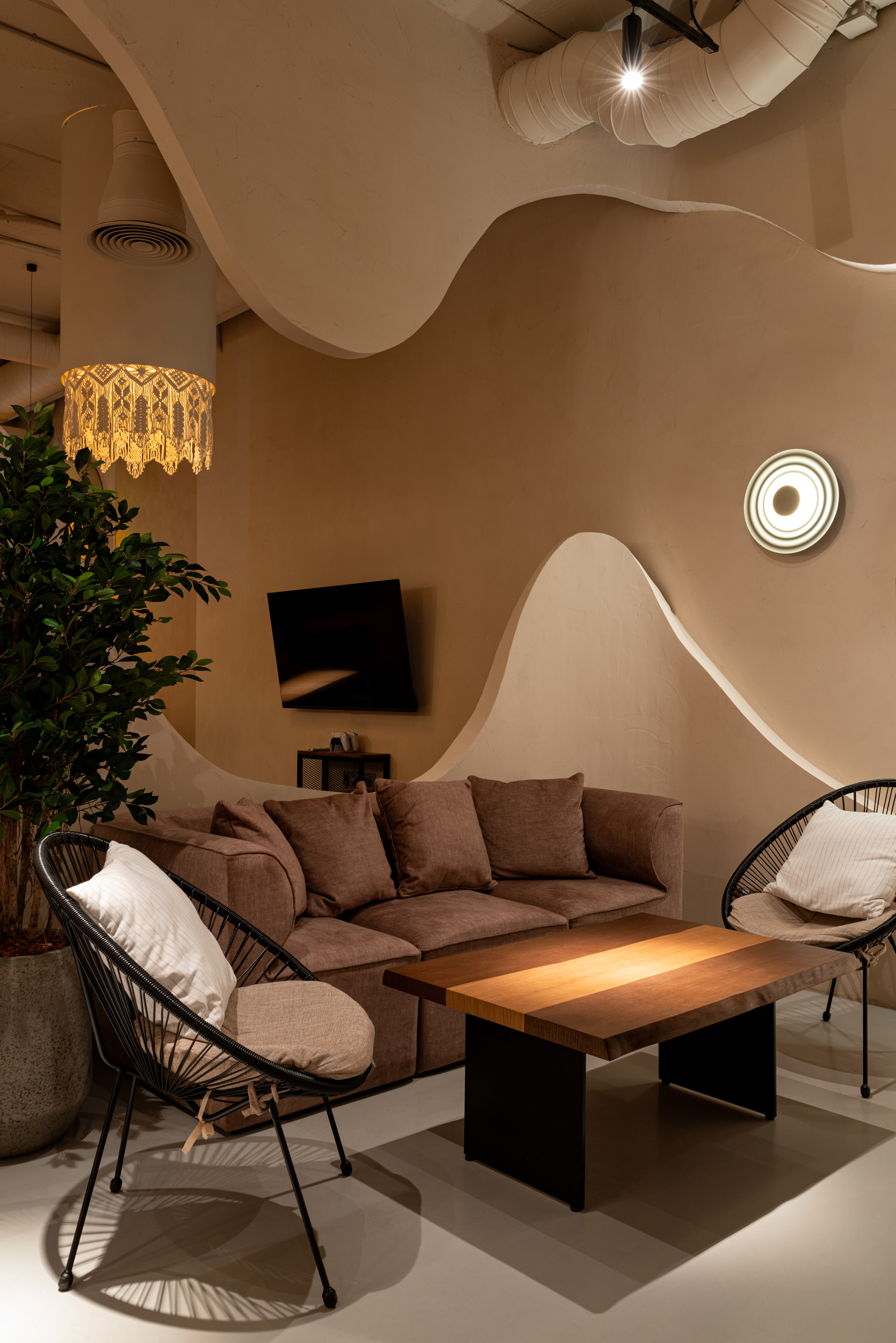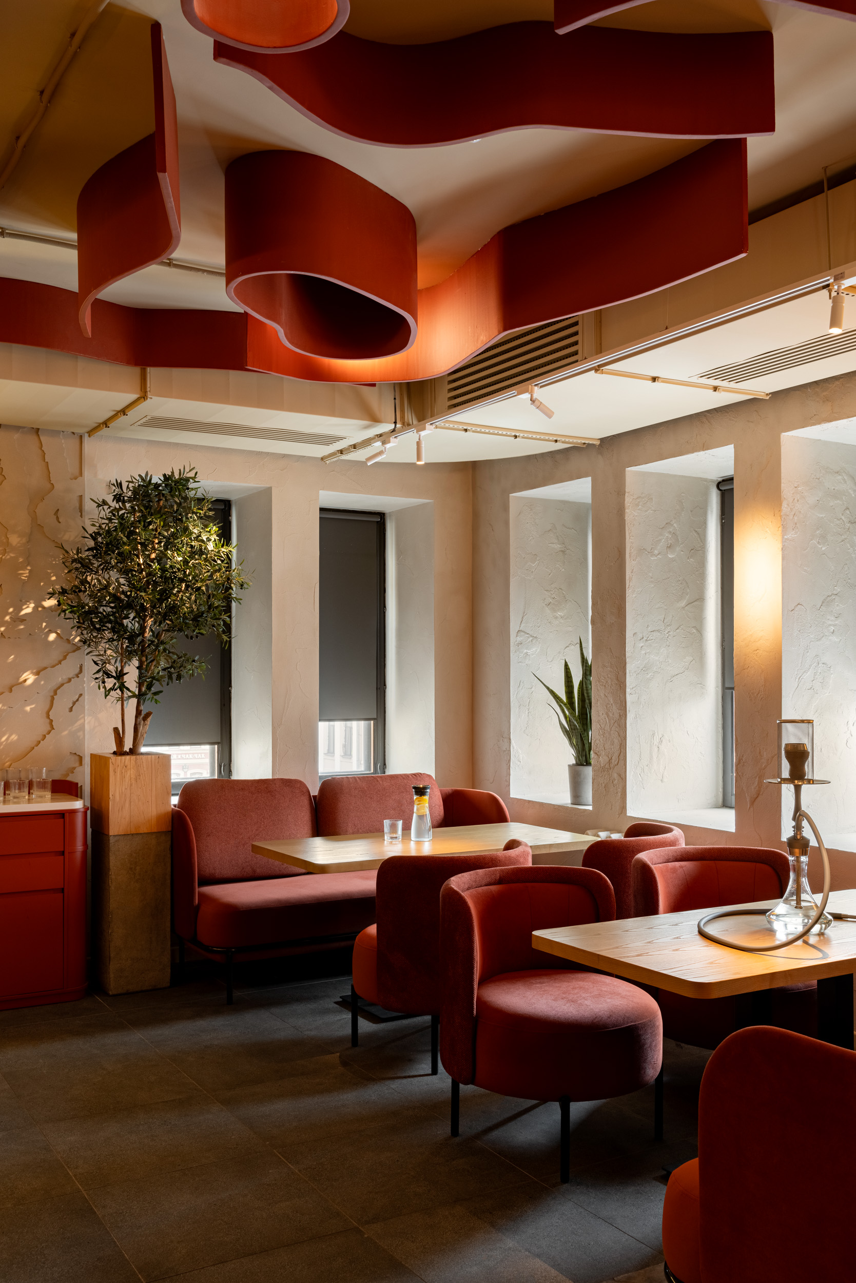 Концепция: Основная концепция проекта — воссоздание аутентичной итальянской атмосферы с акцентом на средиземноморский колорит. Дизайнеры умело использовали оранжевые и терракотовые оттенки, контрастирующие со светлым известковым фоном, а также мягкие формы для создания уютного пространства. Сложная задача зонирования П-образного помещения была решена через многофункциональные зоны: от бизнес-встреч до приватных уголков и игровых комнат, включая эффектную VIP-зону в виде грота. Интерьер обогащен уникальными стилеобразующими элементами: световыми шарами, авторскими настенными паттернами ручной росписи, рельефными стенами и мягкими потолочными лепестками терракотового цвета, каждая деталь которых тщательно подобрана для передачи утонченности и оригинальности.