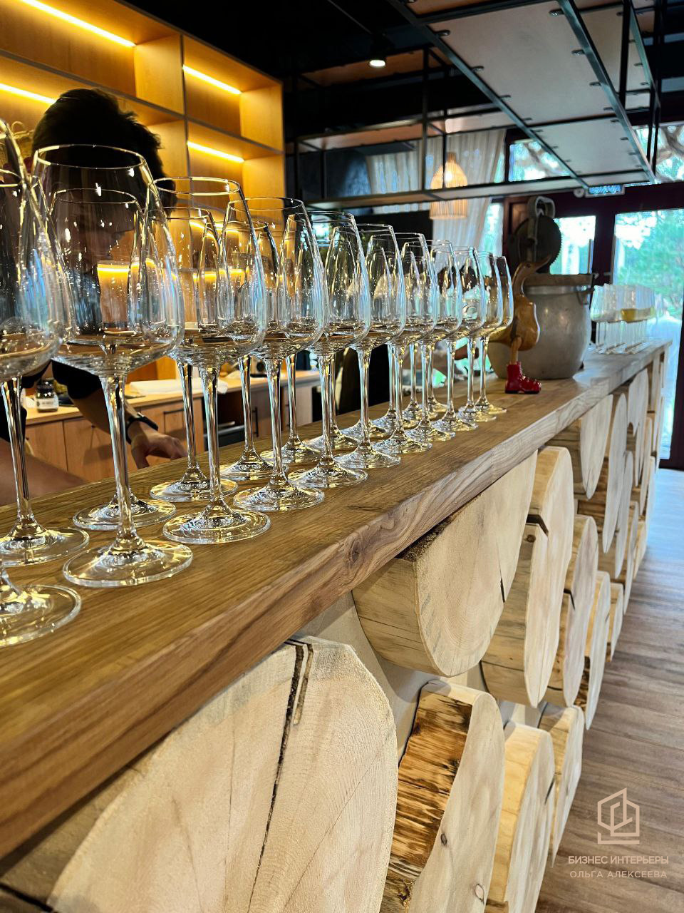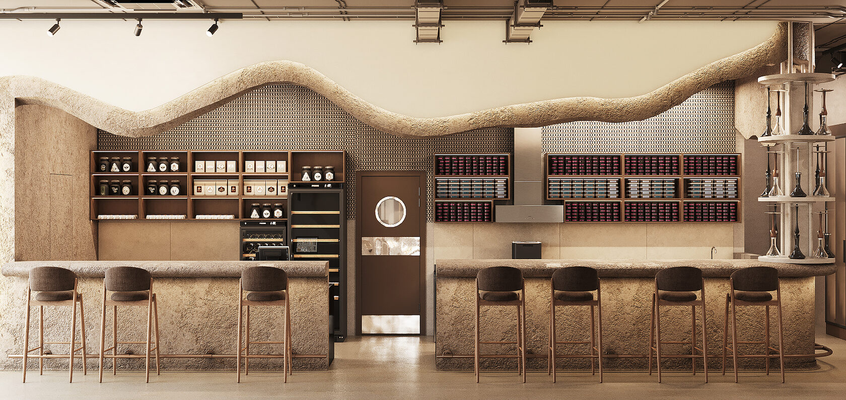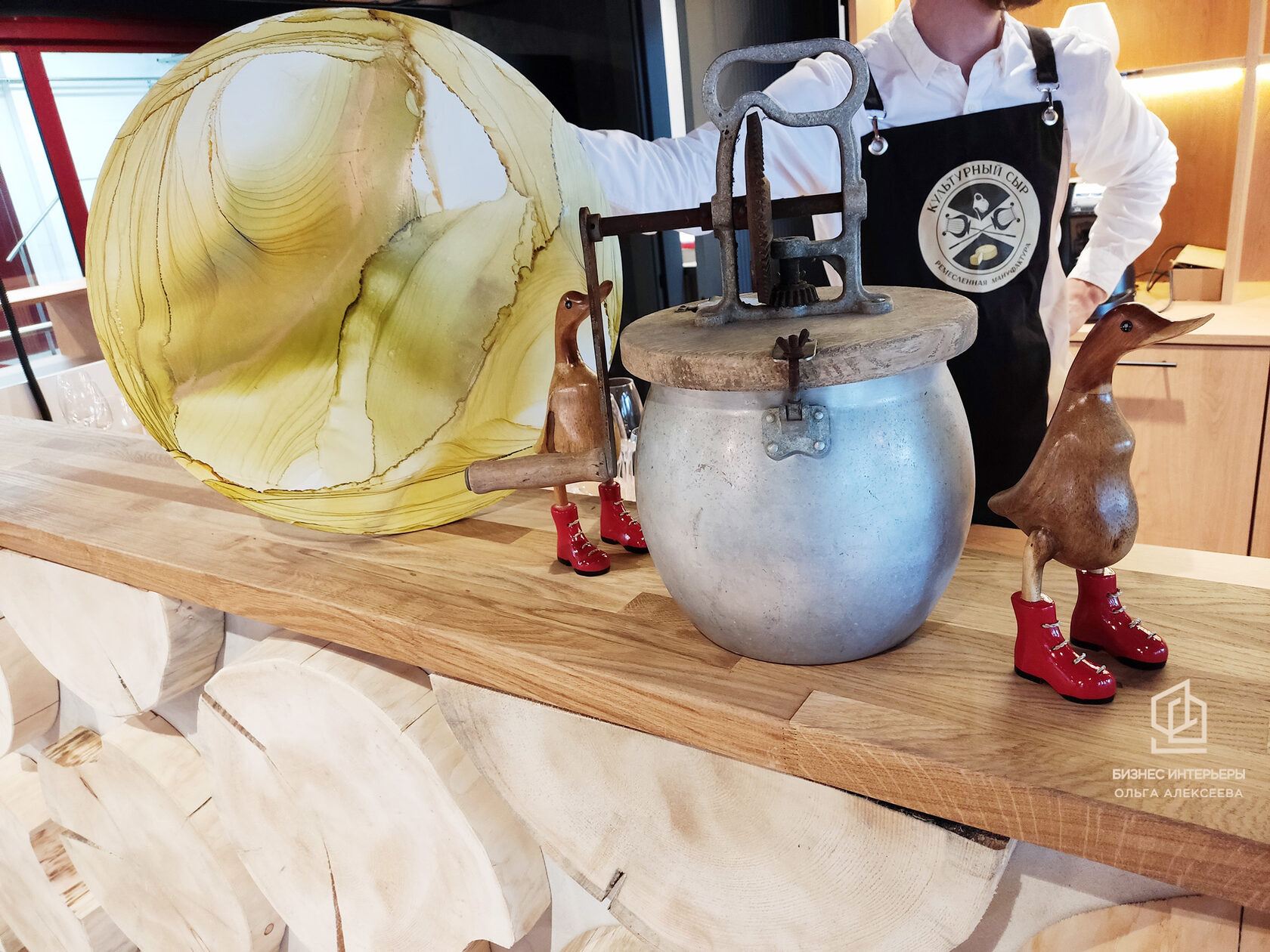Концепция: Основная концепция — создание интерактивного пространства, где панорамное остекление открывает вид на сыроварню, превращая обед в живой диалог с процессом создания продукта, что символизирует доверие и открытость. Интерьер служит логическим продолжением сыроварни, используя аутентичные материалы, такие как спилы кедра, ставшие ключевыми акцентами и элементом «деревянного панно». Зонирование зала и индивидуальный дизайн дегустационных столов тщательно продуманы для обеспечения комфорта гостей и оптимального обзора. Все детали, от эргономики персонала до инженерных подключений, рассчитаны до сантиметра, подчеркивая функциональность и удобство.