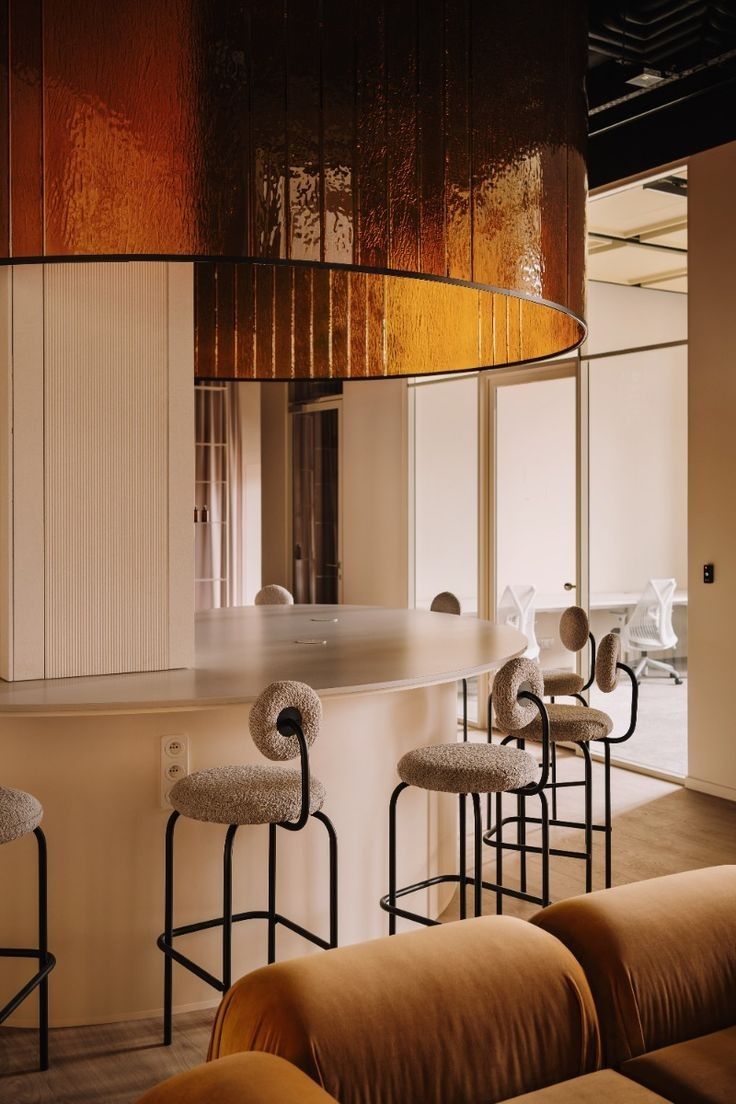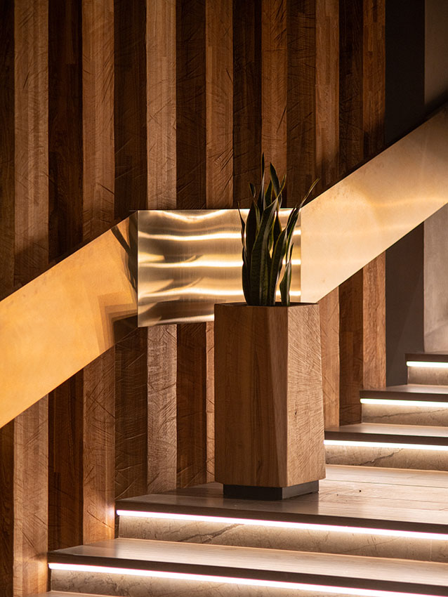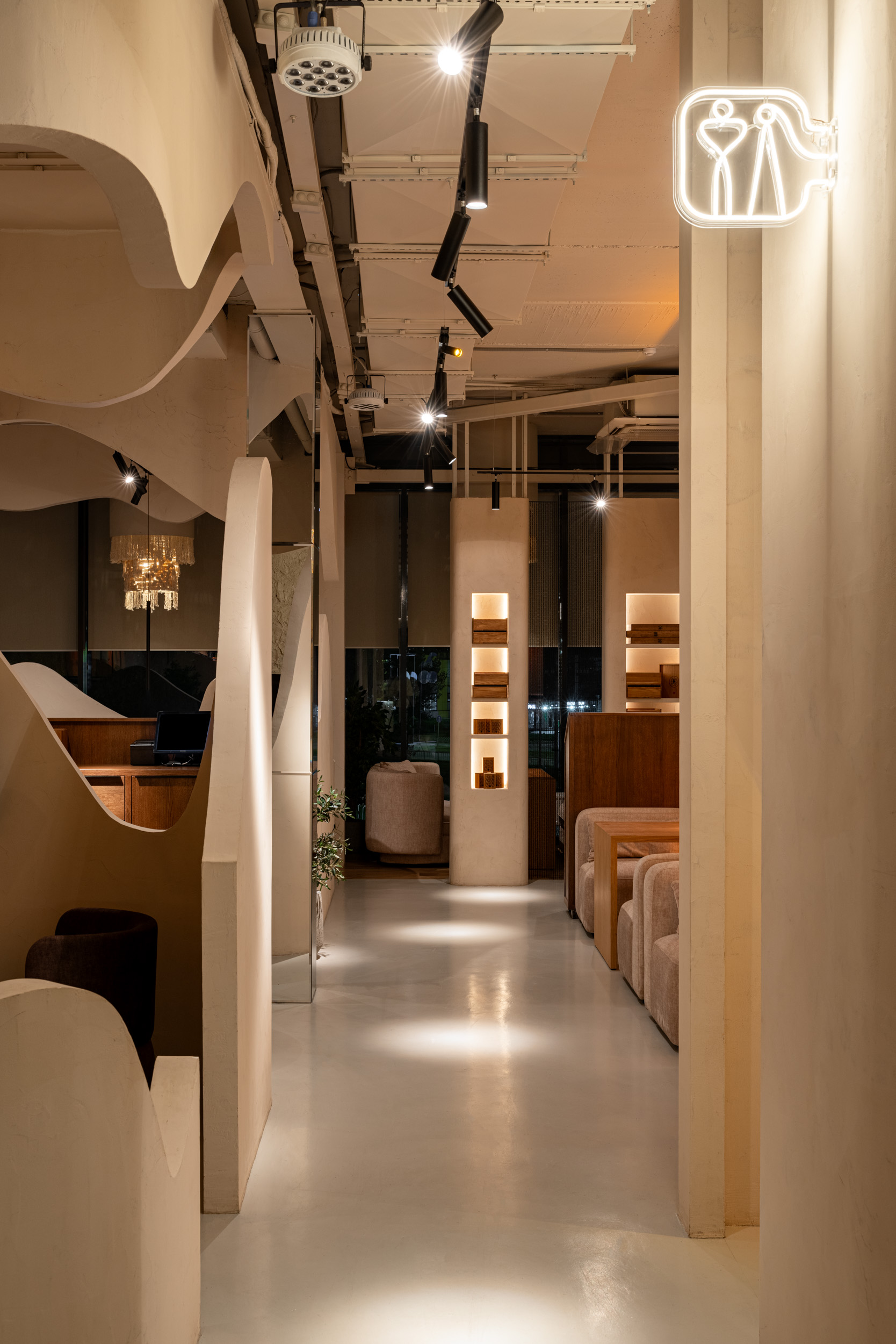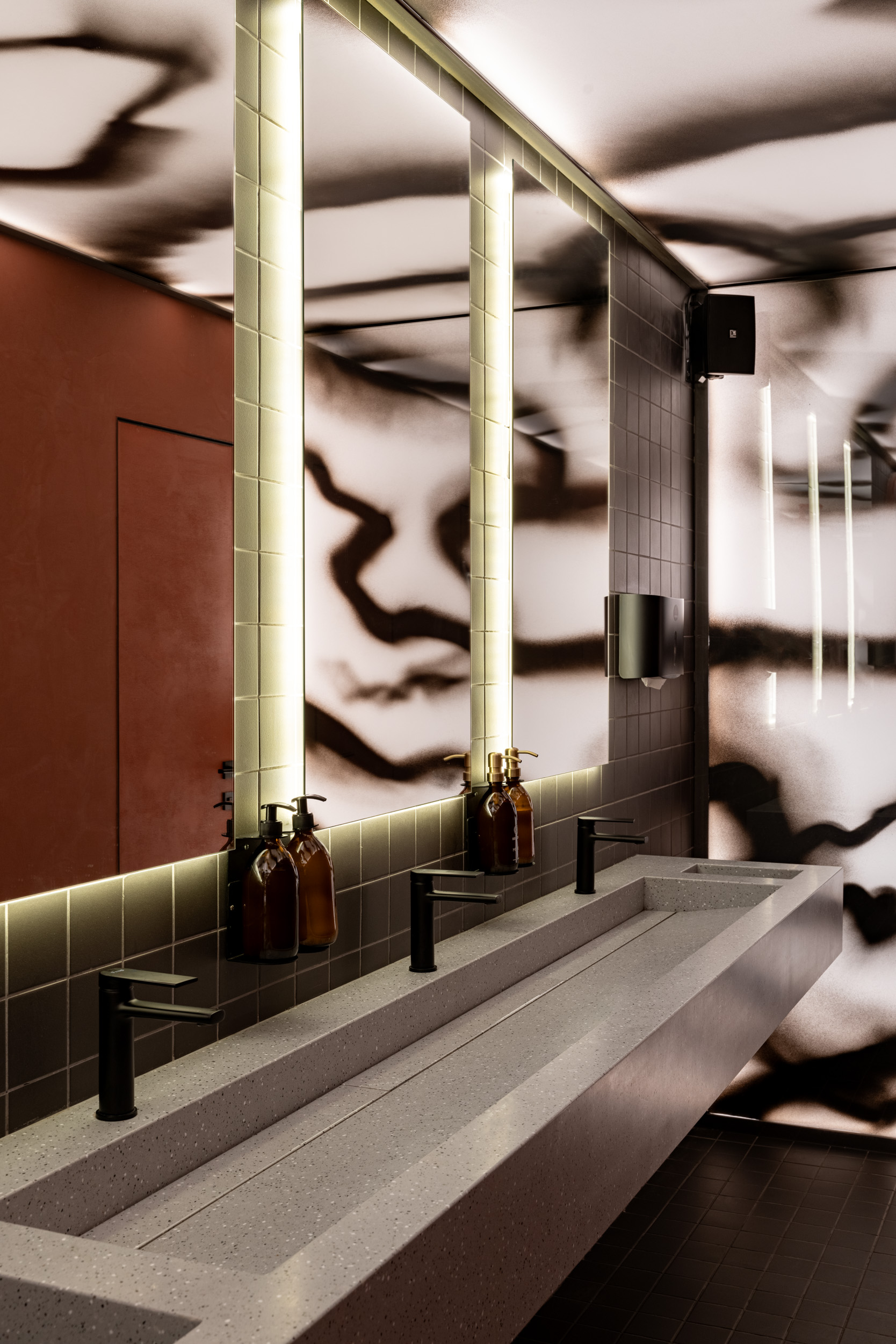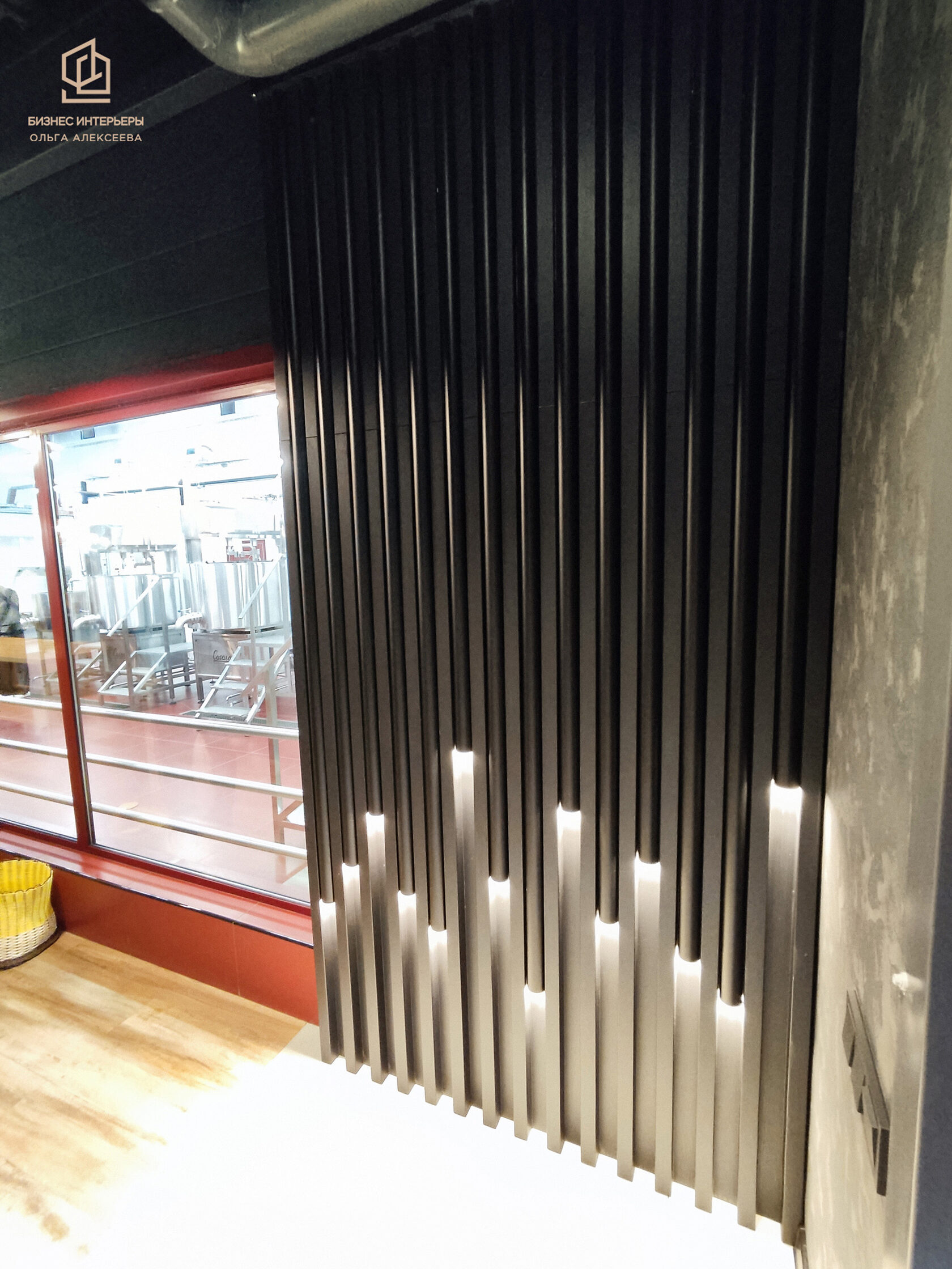 Особое внимание уделено свету. В проекте использованы авторские светильники, спроектированные специально для этого объекта, которые не только выполняют функциональную задачу, но и стали частью фирменного визуального кода.