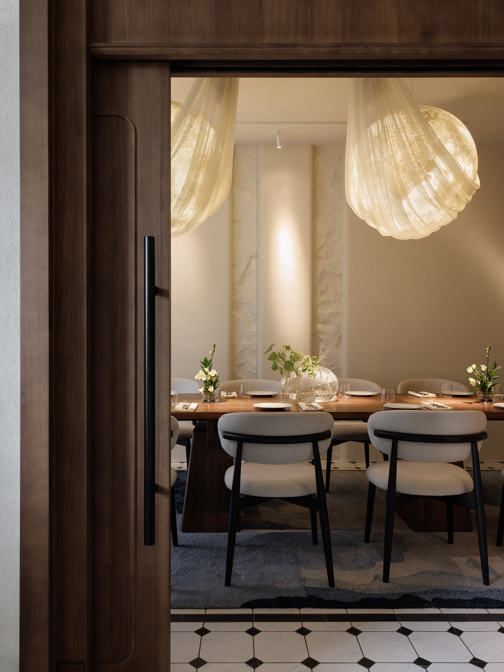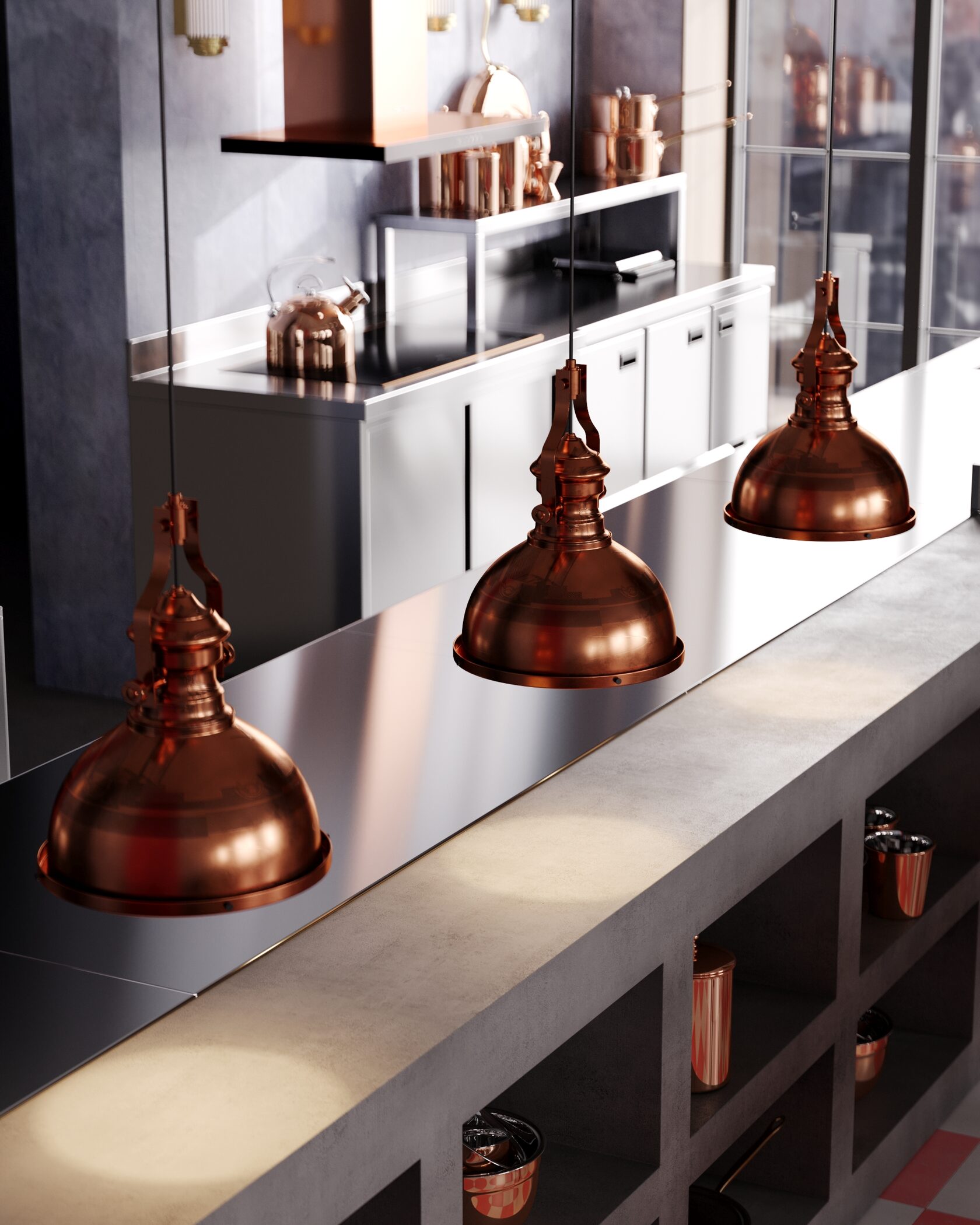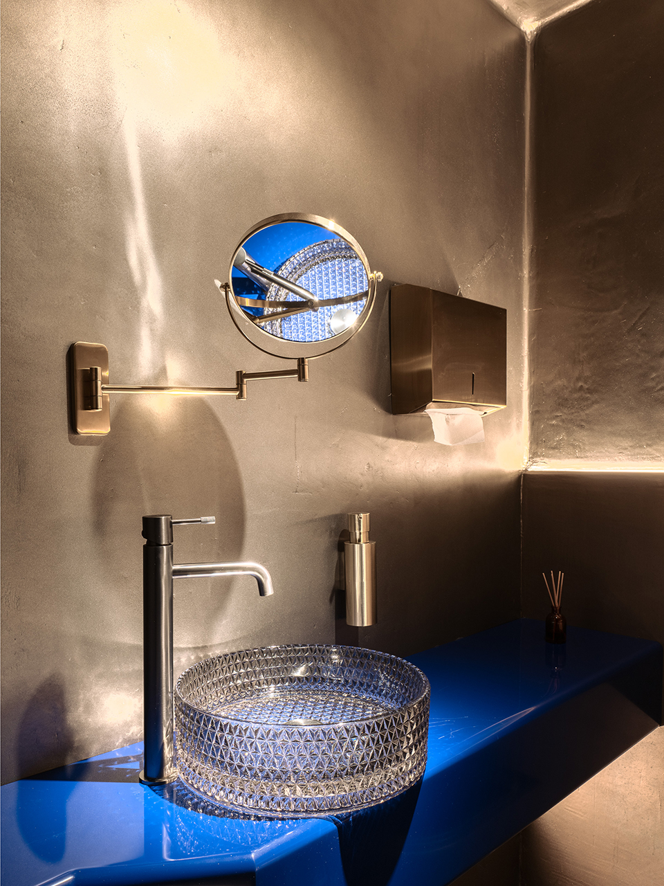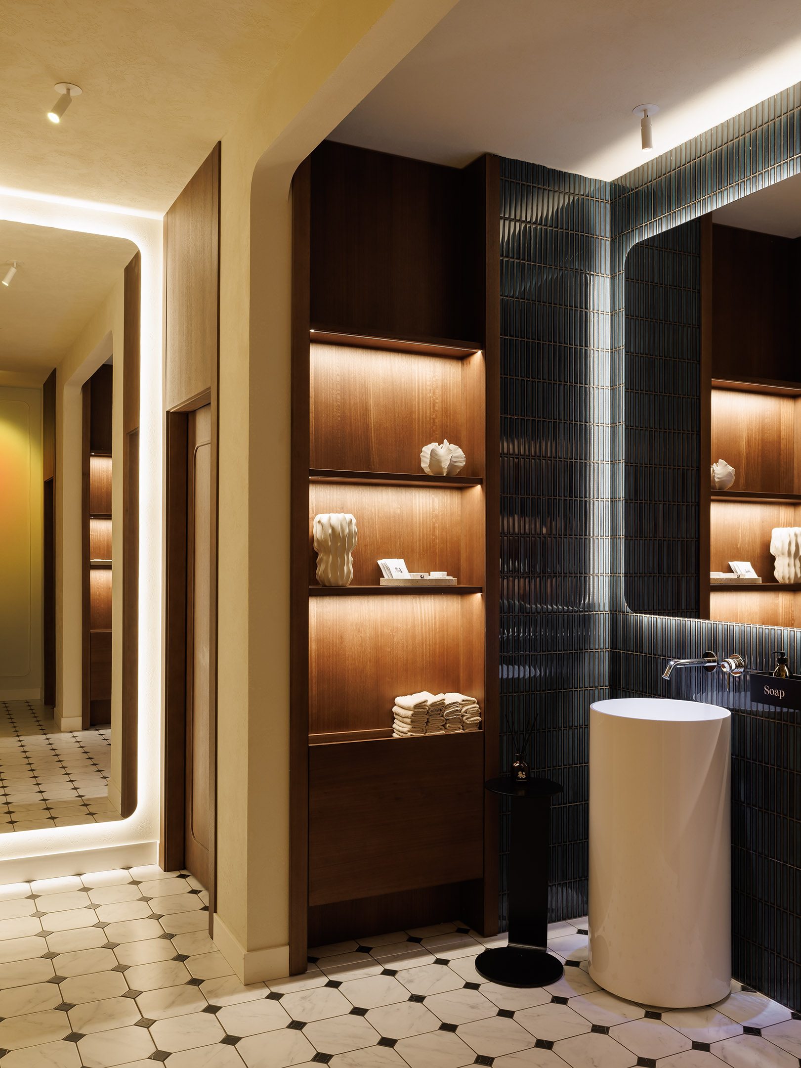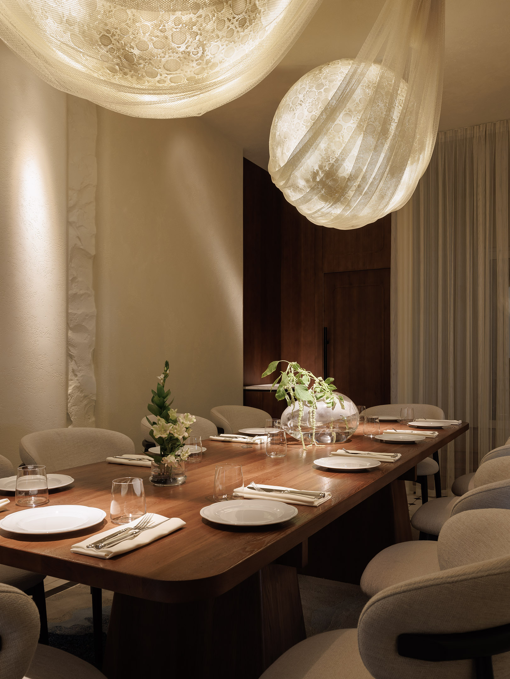 Особое внимание уделено свету. В проекте использованы авторские светильники, спроектированные специально для этого объекта, которые не только выполняют функциональную задачу, но и стали частью фирменного визуального кода.