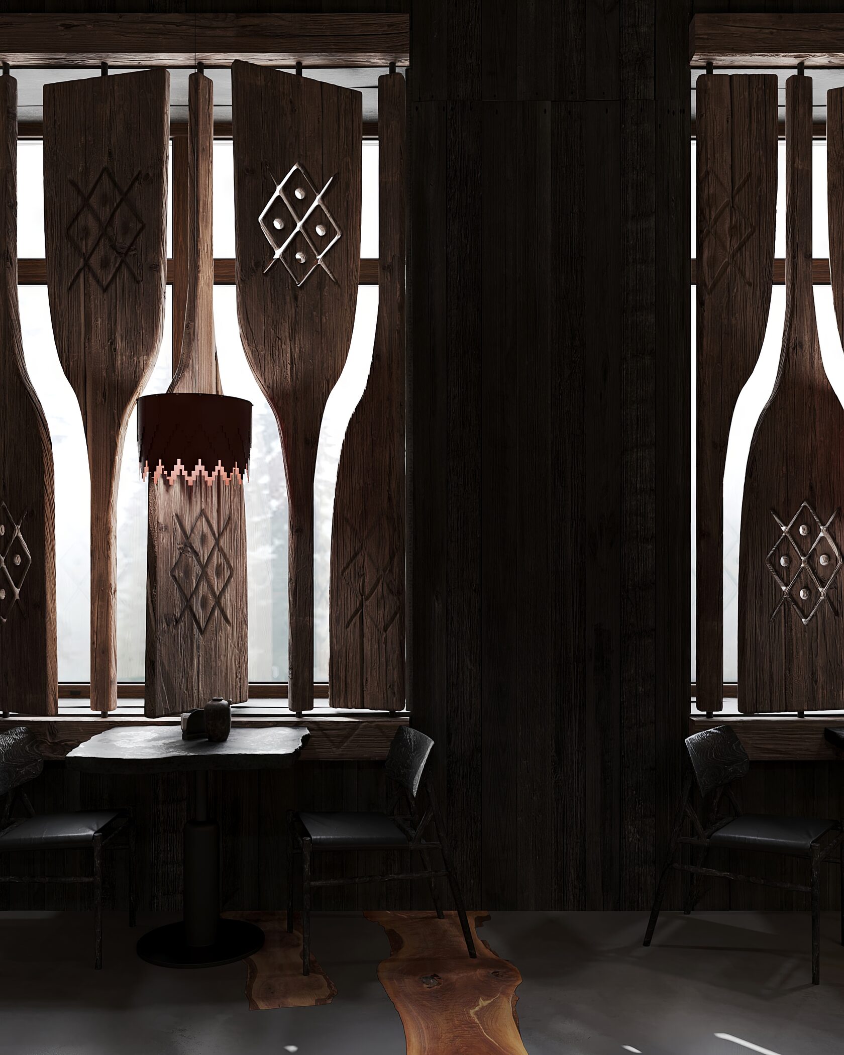 Концепция: «ЛадЪ» — это целостная сенсорная среда, где каждая деталь формирует глубокое эмоциональное погружение гостя. Мерцание пламени, игра света на дереве и металле, тактильная теплота и текстуры создают комфортное пространство, объединяющее традиции и современность. Основной принцип — передача подлинной атмосферы русского дома через материалы, формы и художественные акценты.
