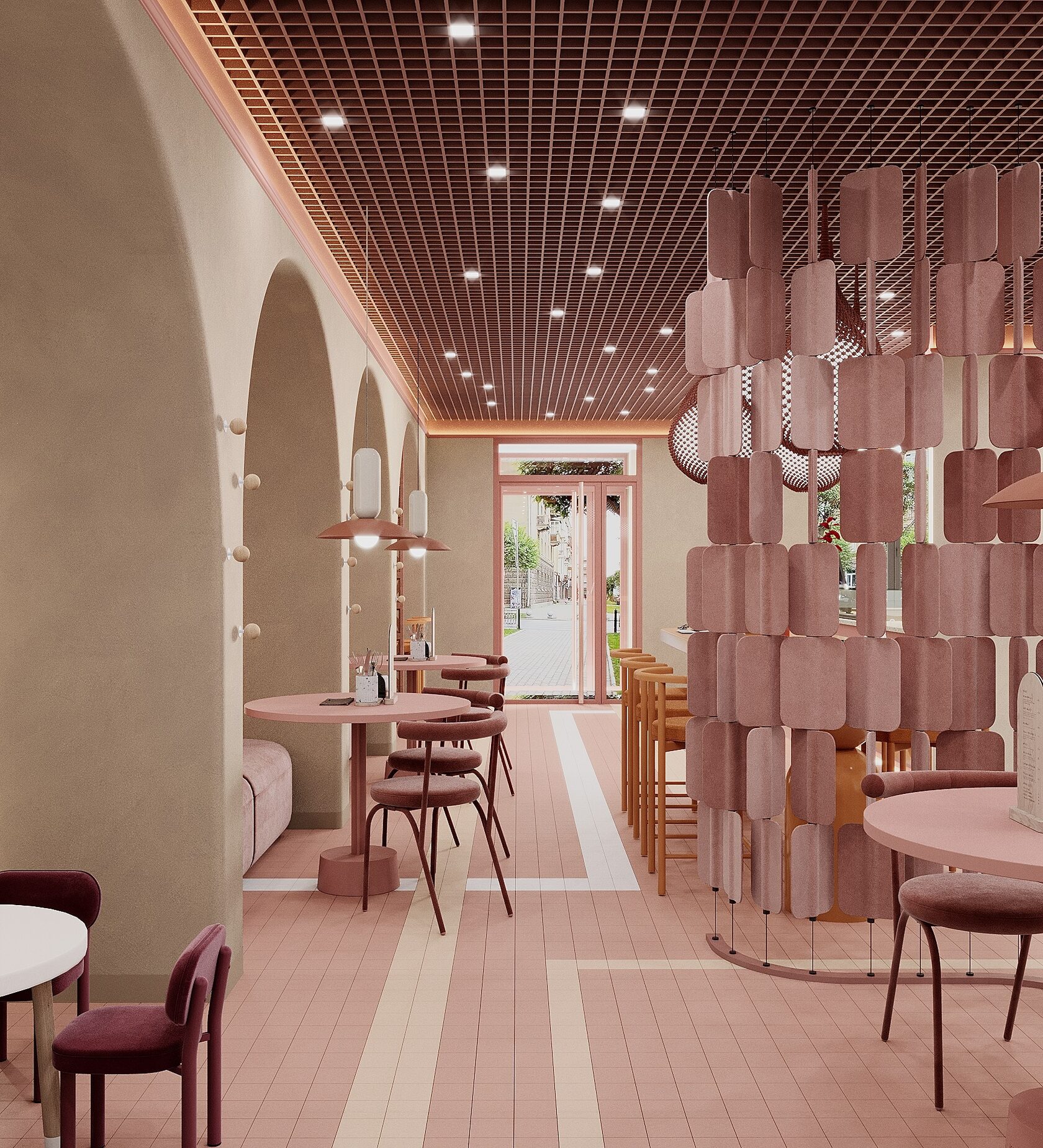 Концепция Я взяла цветовую палитру из окружения бренда: ягодные оттенки, холодное молоко, сливки, фисташка, малиновый эспрессо — визуальные ассоциации со вкусом кофе и десертов стали основой идеи. Палитра получилась аппетитной и уютной, визуально согревающей и вызывающей интерес. Чтобы усилить женственное и изысканное настроение, я добавила игру фактур: