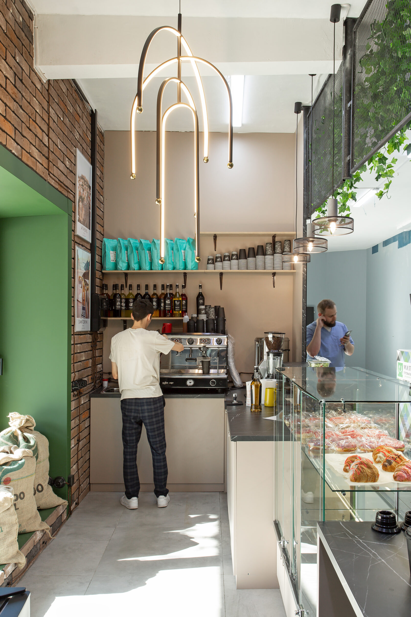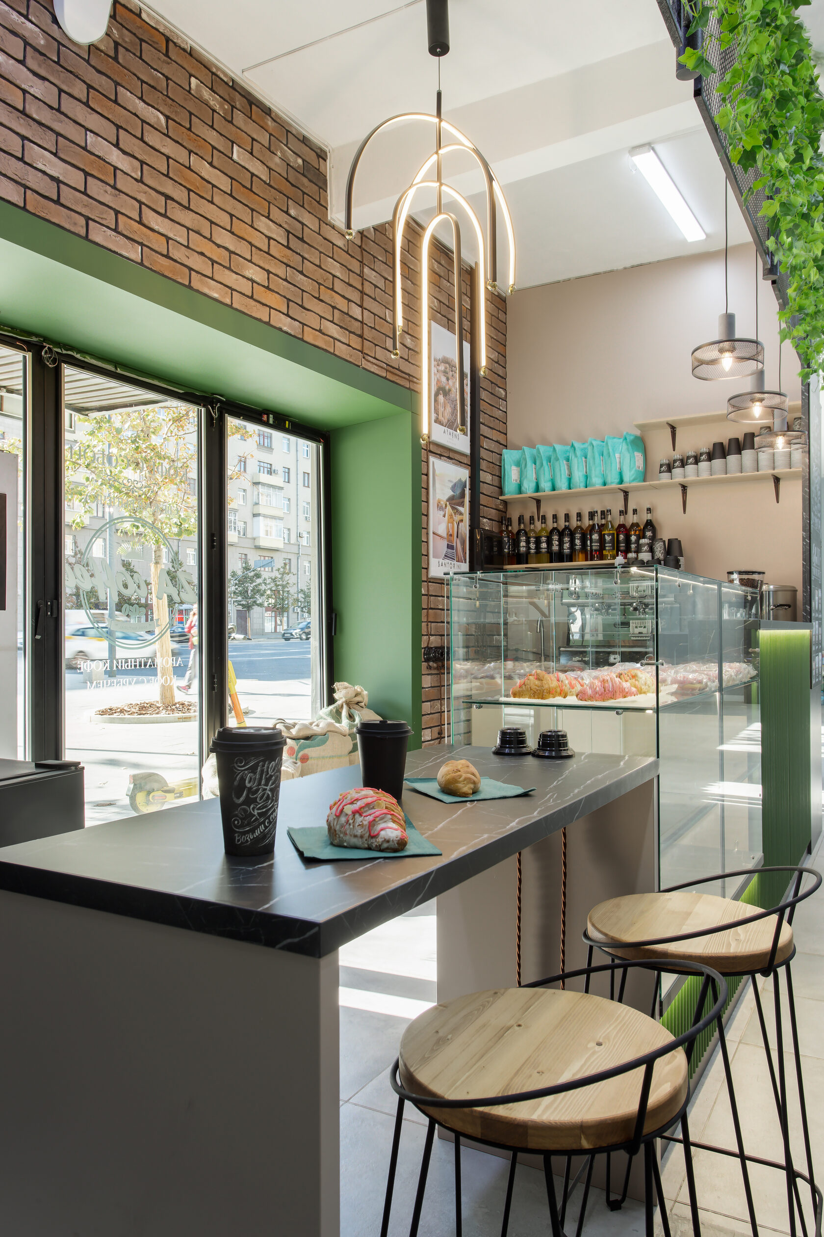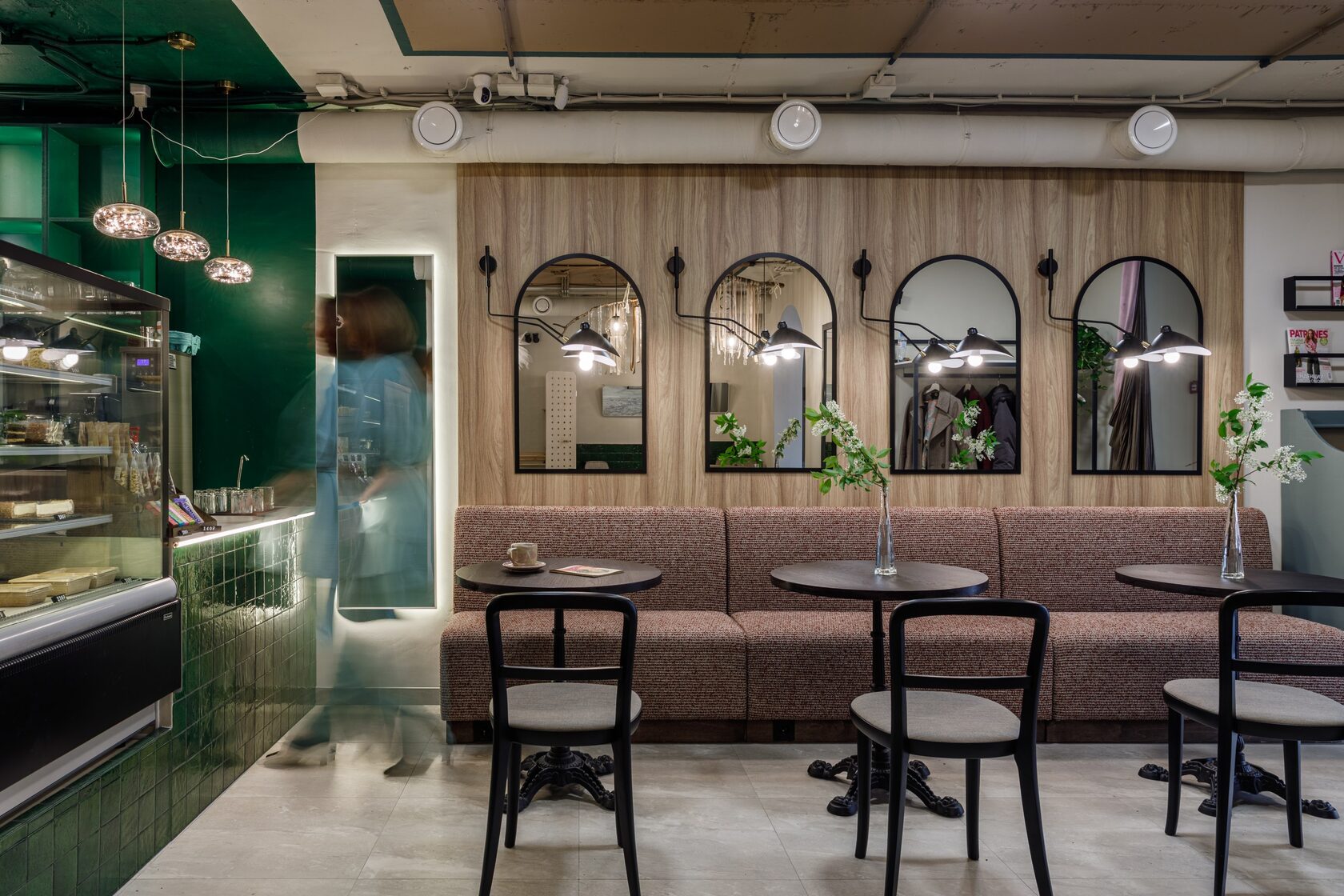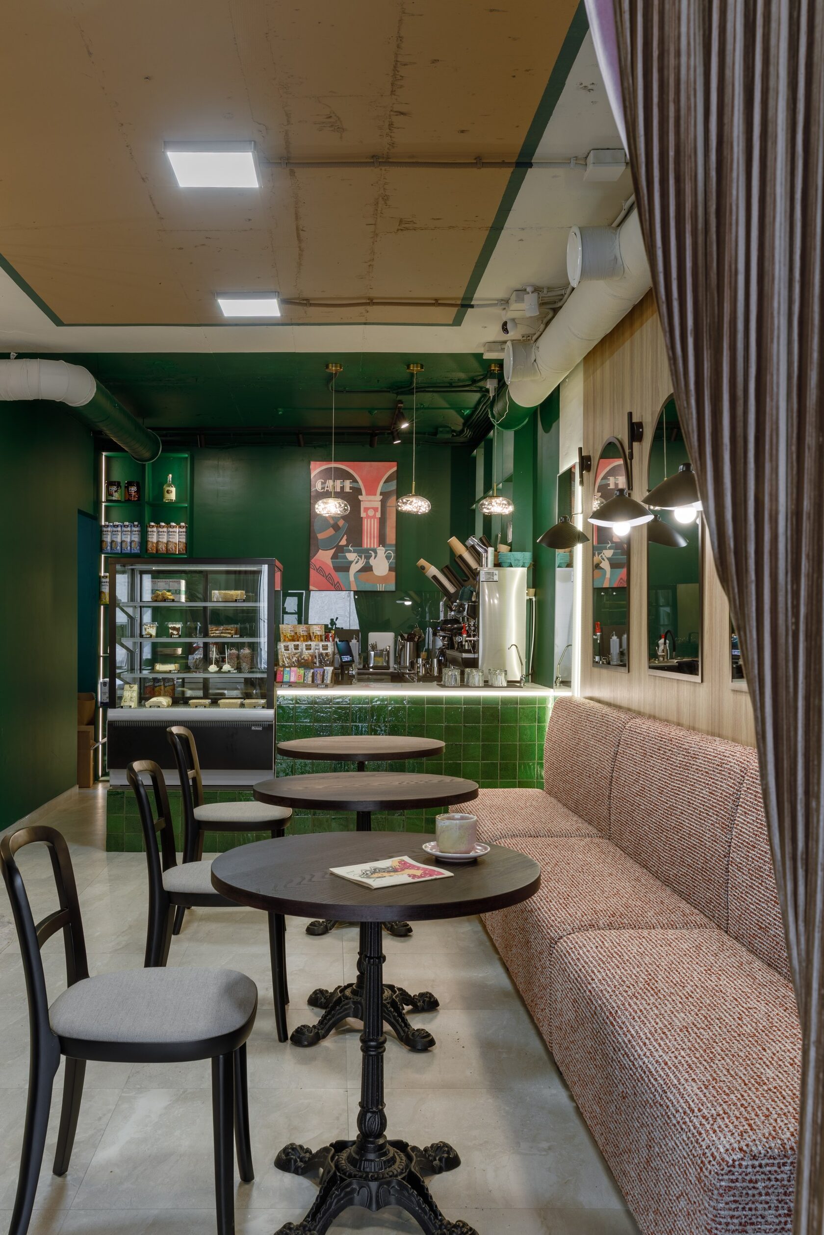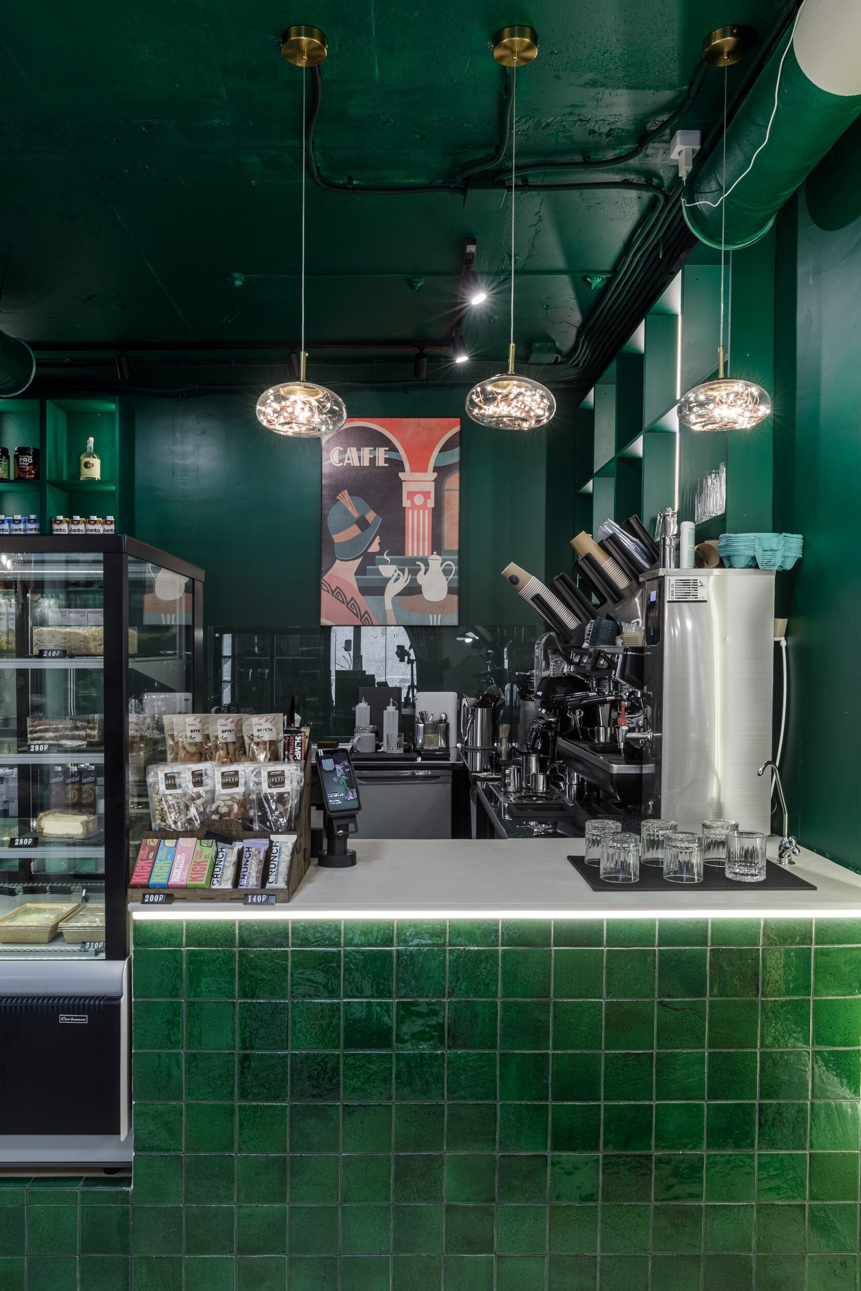 Этот проект представляет собой коммерческое пространство в центре Москвы, где дизайн является ключевым инструментом создания притягательной атмосферы. Интерьер кофейни выделяется гармоничным сочетанием выразительных текстур — кирпичной кладки, насыщенного зеленого цвета, декоративных реек и столешниц "под камень". Продуманное акцентное освещение и дизайнерские люстры эффектно дополняют общую композицию.