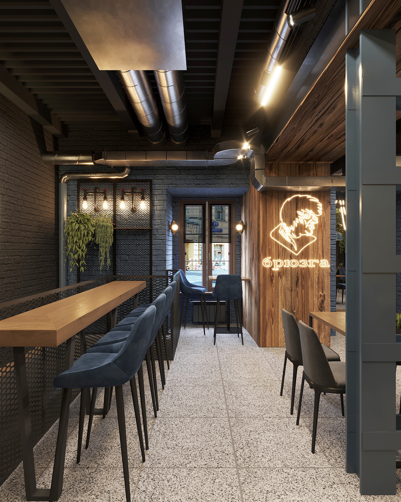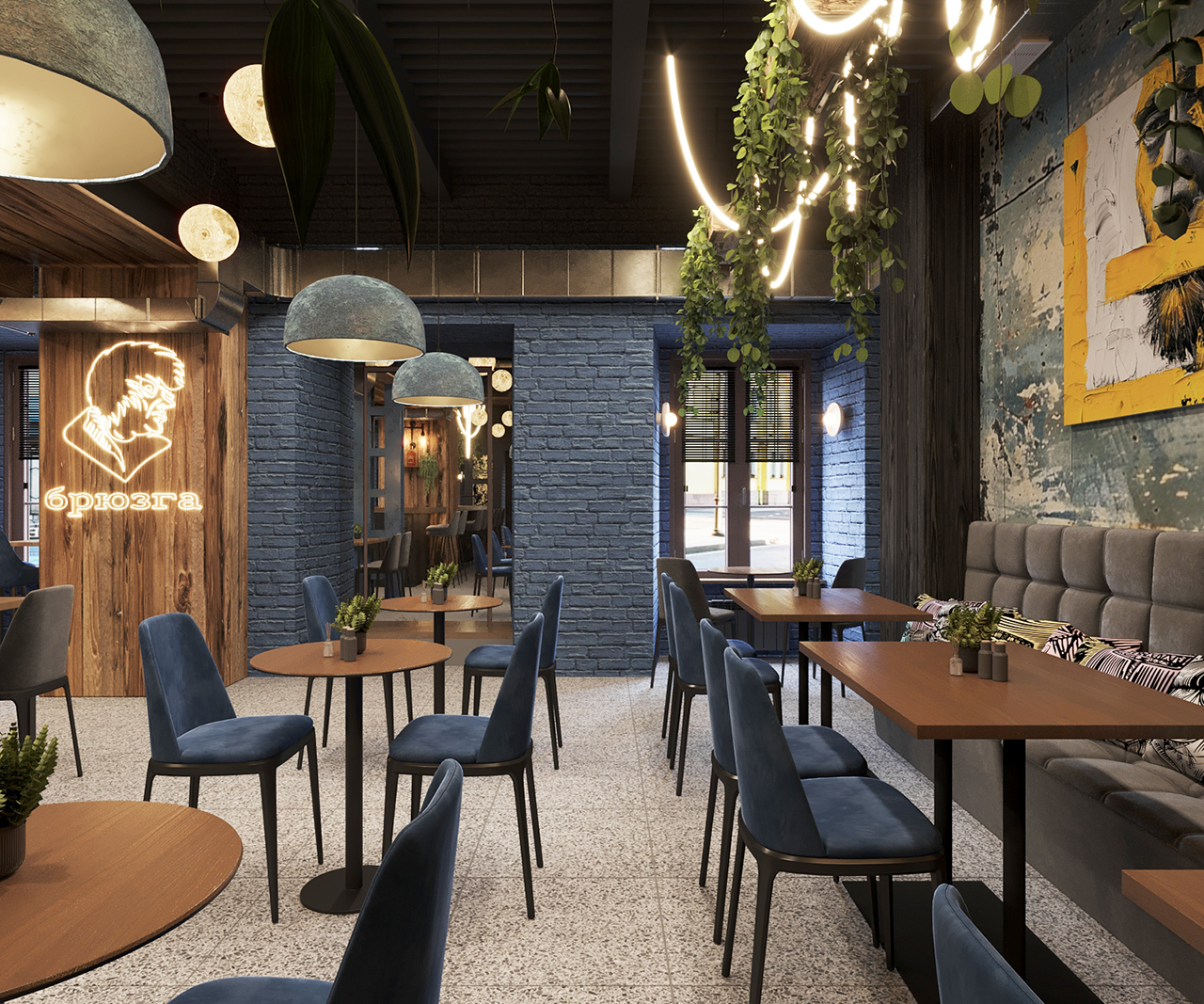 Проект интерьера бара «Городской Брюзга» представляет собой дерзкое переосмысление городской эстетики, где индустриальная брутальность сливается с утонченной художественной выразительностью. Это пространство, искусно сочетающее грубые поверхности с мягкими текстурами, живыми акцентами и динамичным светом, создавая атмосферу смелого, притягательного комфорта.