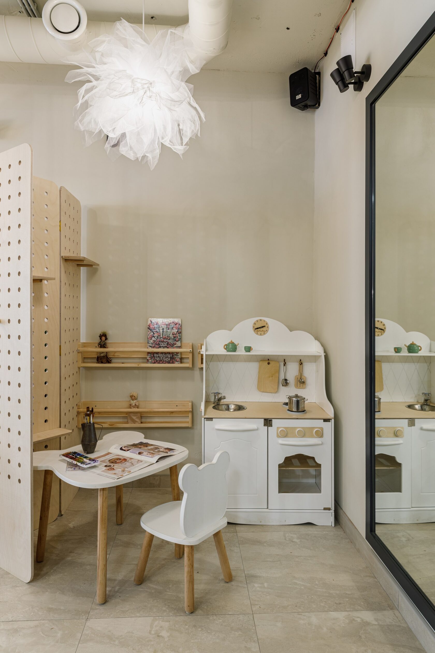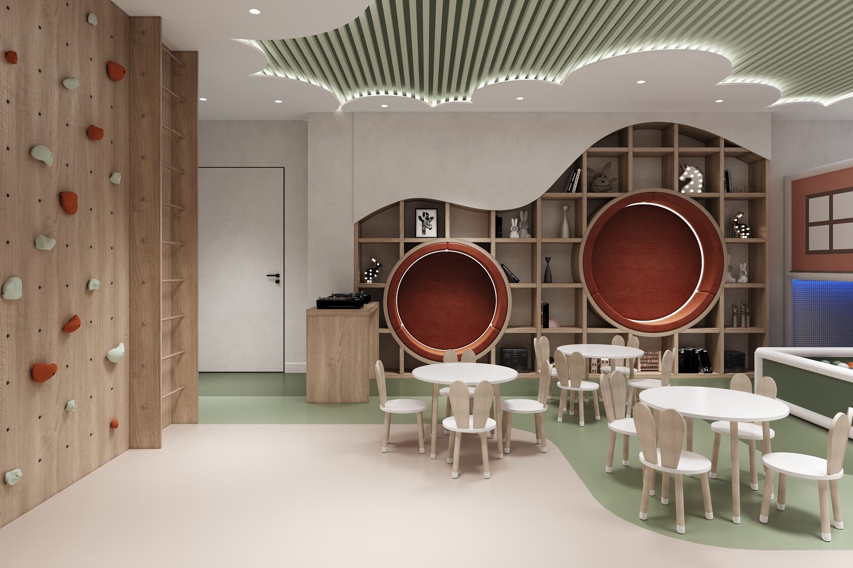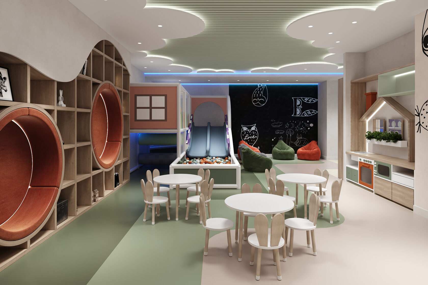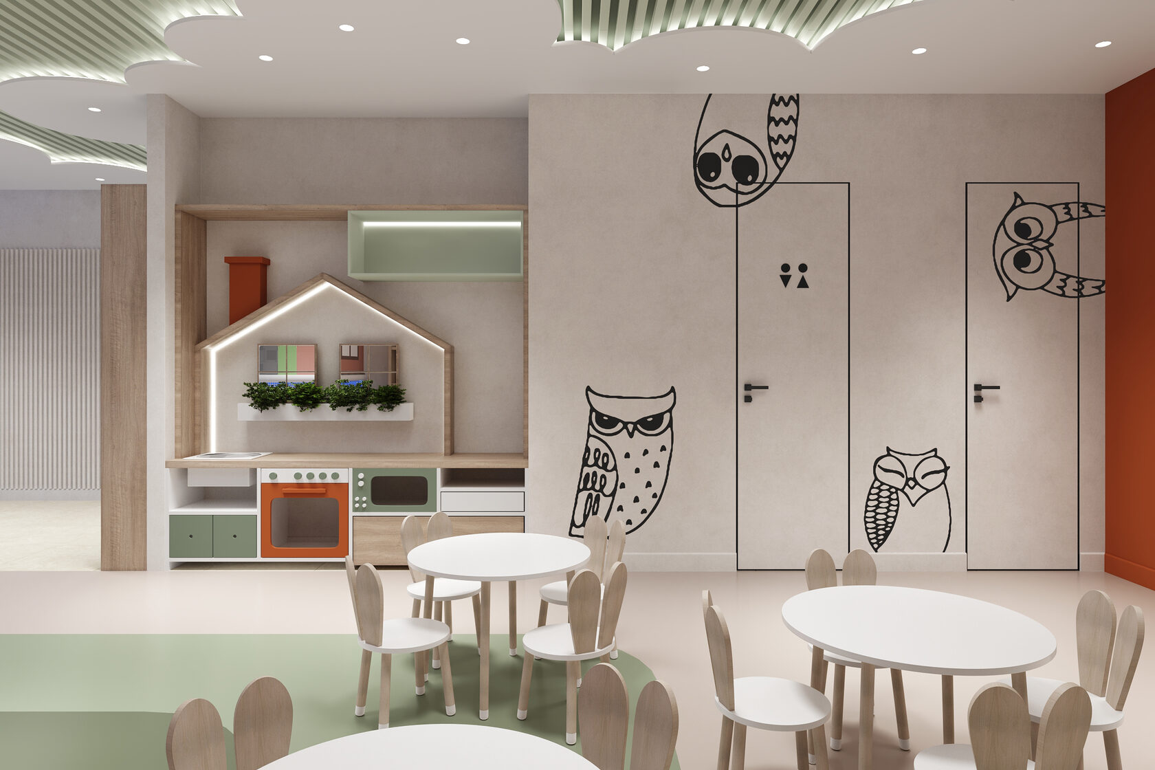 Проект представляет собой современное семейное кафе, объединяющее уют, стиль и функциональность. Родительская зона оформлена в светлых оттенках с натуральными фактурами, создавая атмосферу лёгкости и комфорта. Детская зона включает мягкие игровые модули, интерактивные станции и безопасные материалы, стимулируя творчество и обучение.