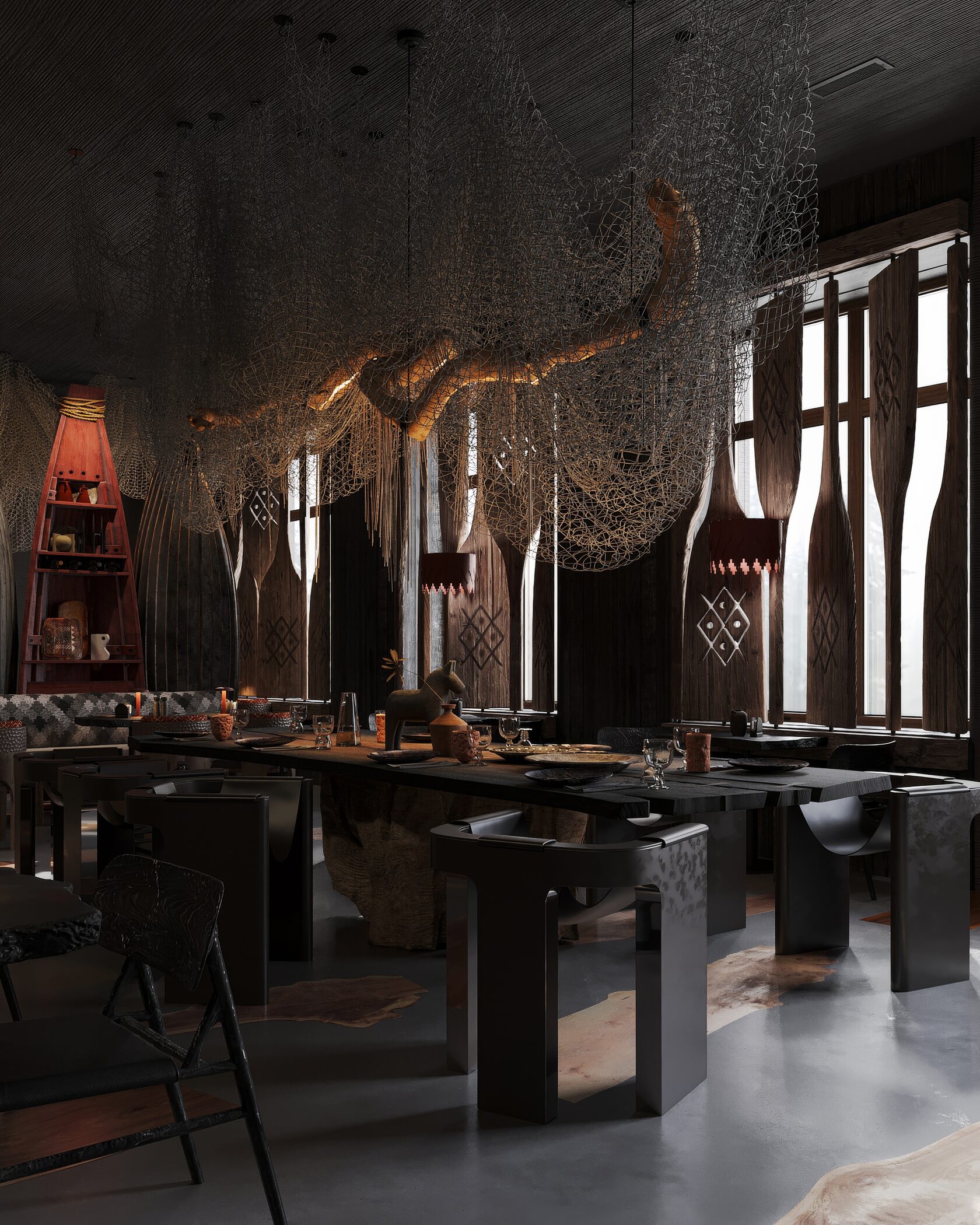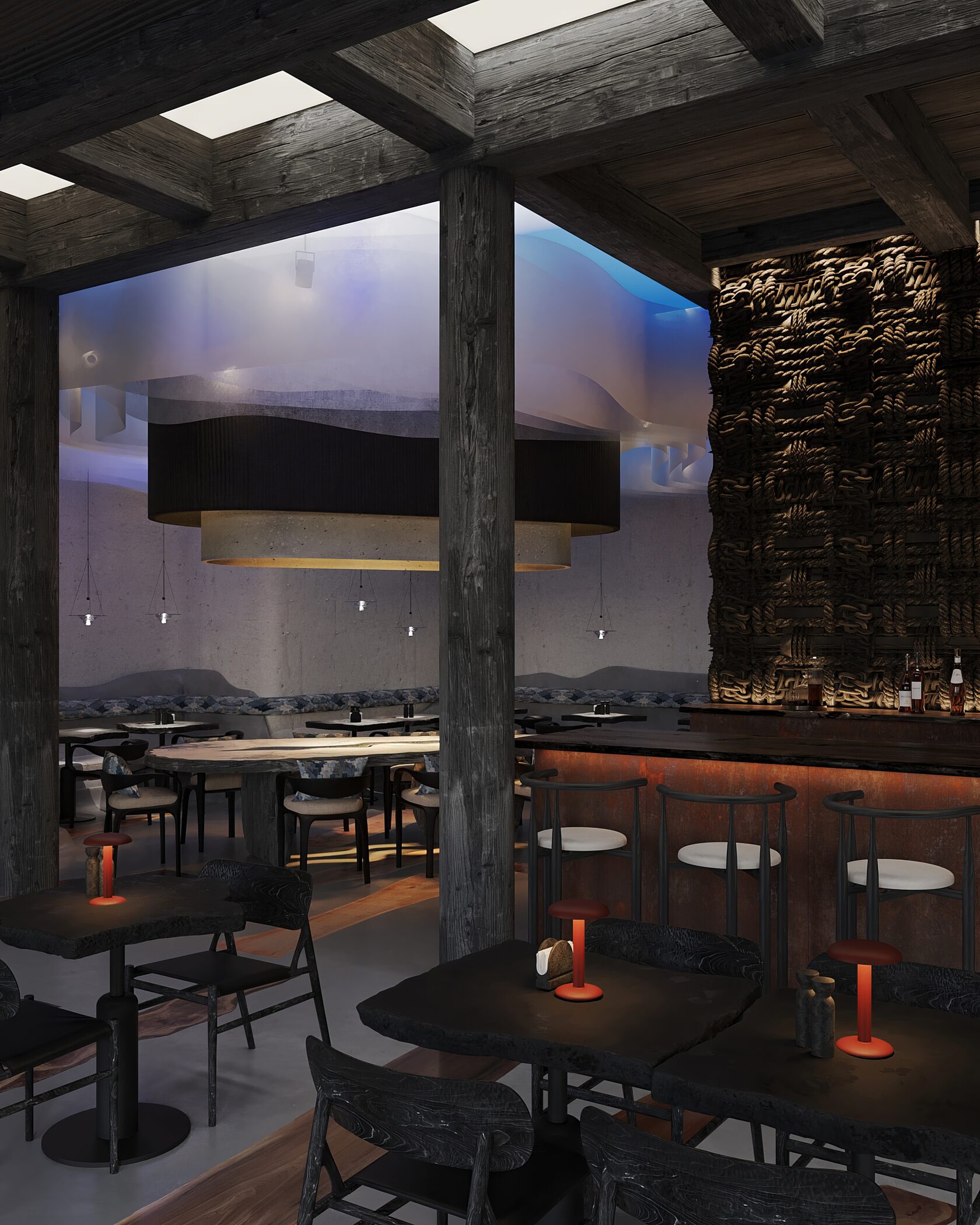 Концепция: природа как главный вдохновитель Териберка — место, где природа демонстрирует свою силу и великолепие. Северное сияние, киты, море, водопады и скалистые берега стали основными источниками вдохновения для дизайна ресторана. Пространство площадью 600 кв. м разделено на два этажа, каждый из которых рассказывает свою историю.