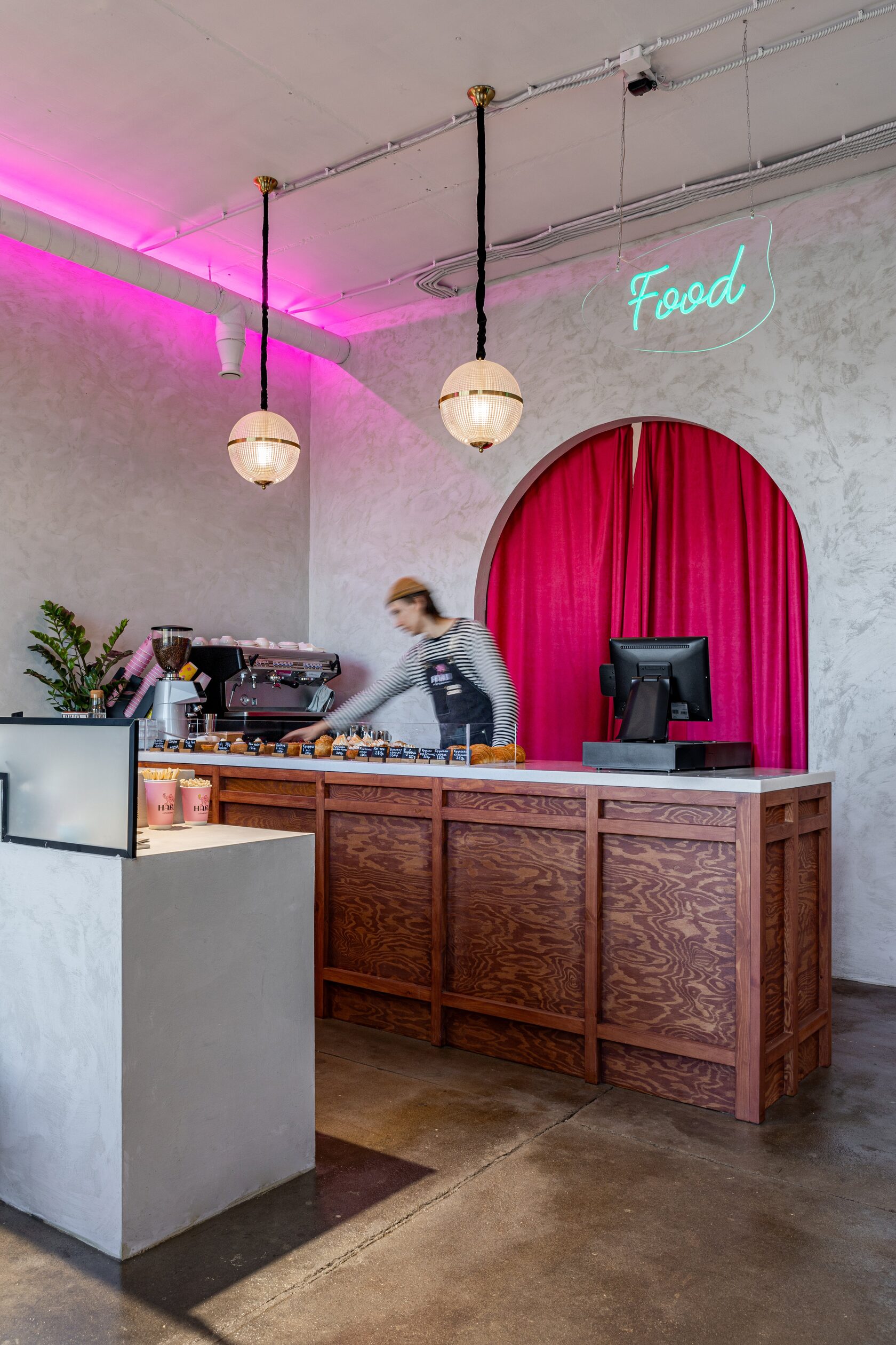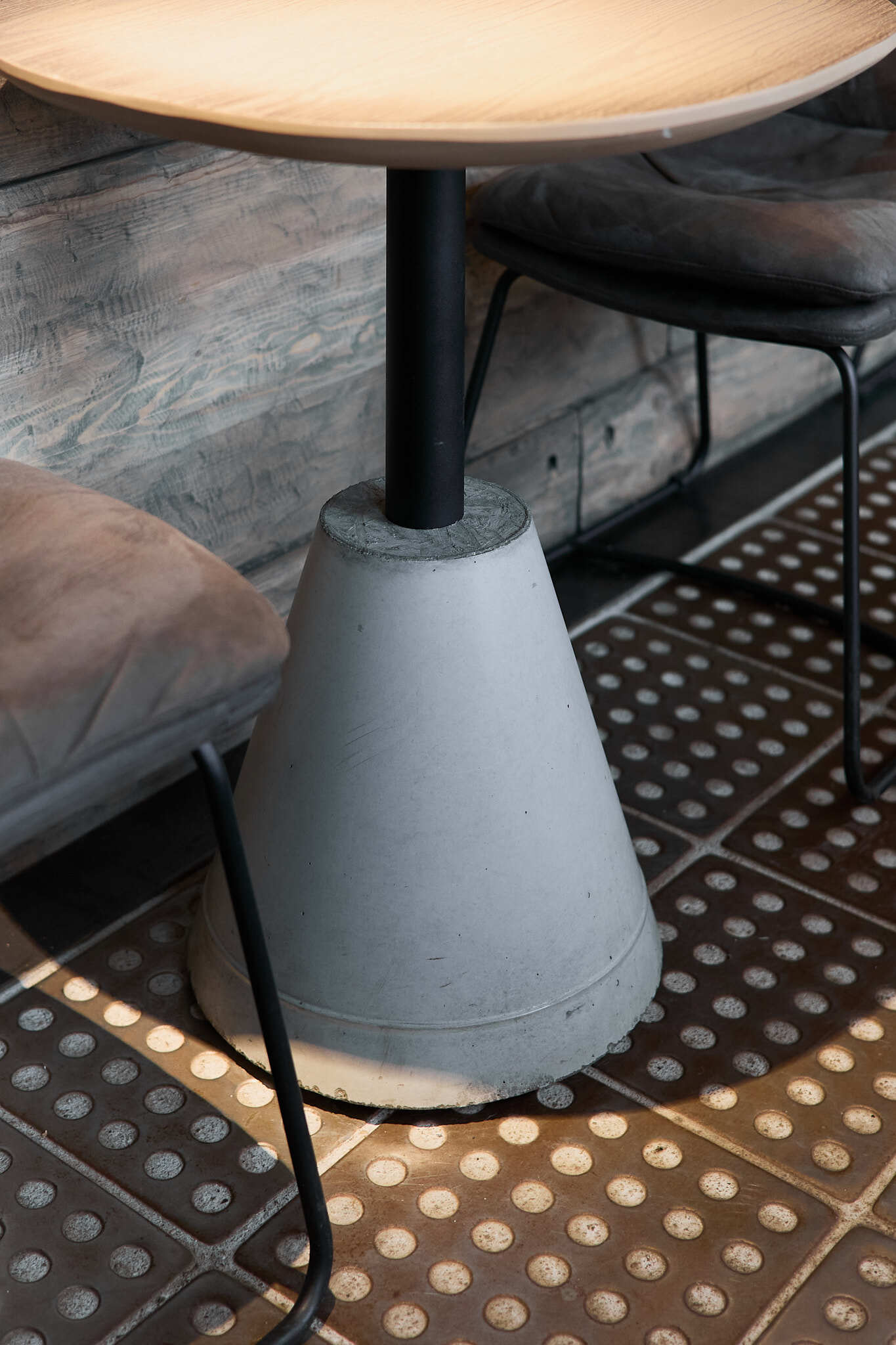 Был сделан акцент на использовании натуральных и антивандальных материалов: дерево, металл, декоративный бетон. Всё пространство продумано до мелочей — от эргономики барной зоны до расстановки мебели в кафе.