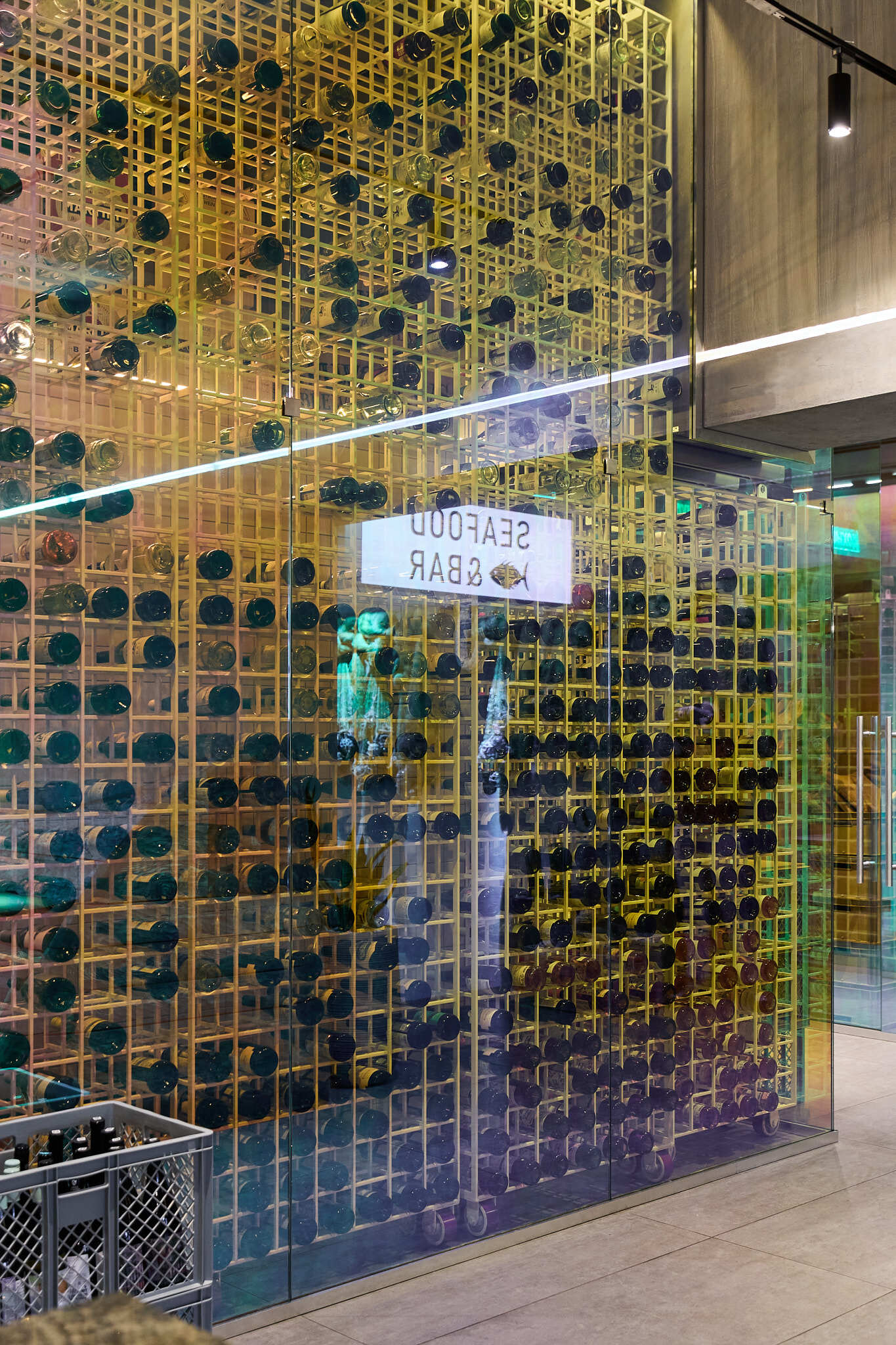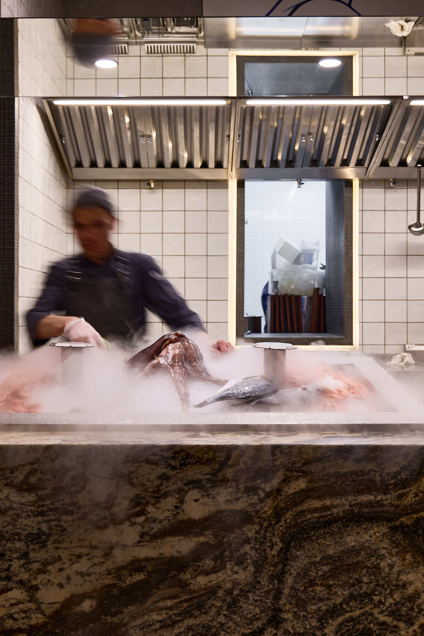 Ресторан площадью 200 м² разделен на три зала с анфиладной планировкой, создающей ощущение бескрайнего пространства. Современная вентиляция, декоративная штукатурка, керамогранит, мебель и отделка натуральным шпоном подчеркивают аутентичность итальянского интерьера. Паруса на потолке и арт-объекты в виде морских обитателей визуально раскрывают инженерные коммуникации и создают эффект перекатывающихся волн. Гости могут наблюдать приготовление блюд на открытой кухне с аквариумом, отдохнуть у бара с богатой винной коллекцией или насладиться уединением за мягкими диванами и креслами. Зелень, оригинальная керамика и регулируемое освещение позволяют создавать комфортное настроение в зависимости от времени суток.