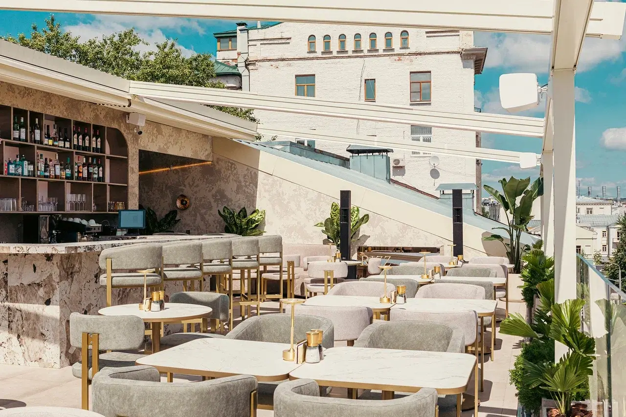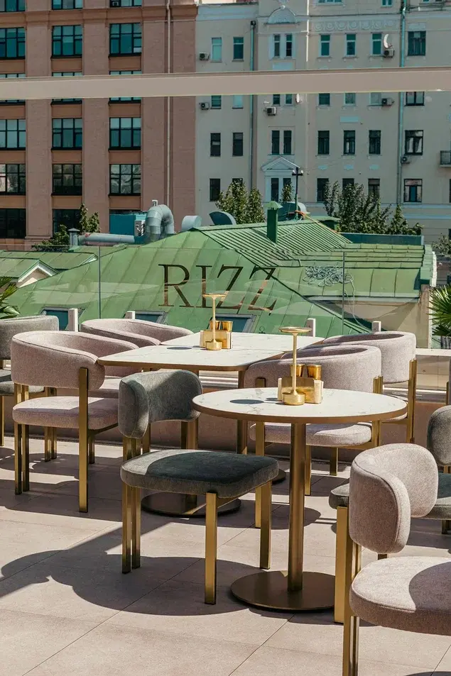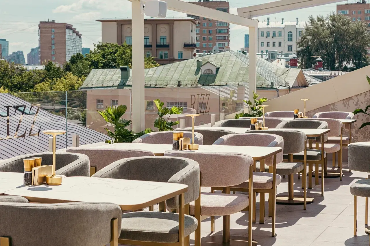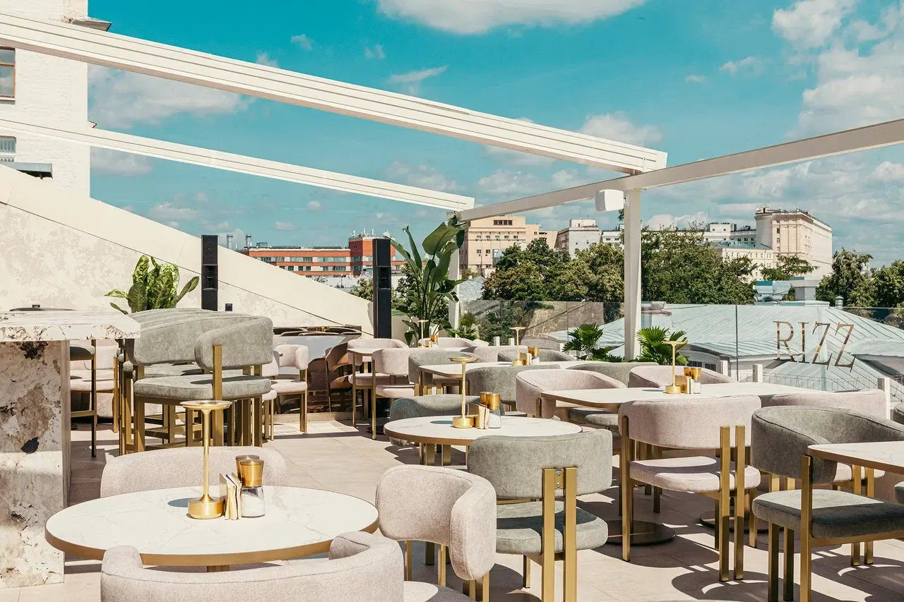Летняя терраса Rizz — это самая масштабная видовая площадка Замоскворечья, способная комфортно разместить до 70 гостей. Ее уникальный дизайн, вдохновленный средиземноморским стилем, гармонично сочетает натуральные, природные оттенки и пышные пальмовые растения. Пространство дополнено баром, оформленным в стиле высококлассных гостиных лучших отелей Сингапура и Гонконга, что обеспечивает исключительный уровень комфорта и роскоши.