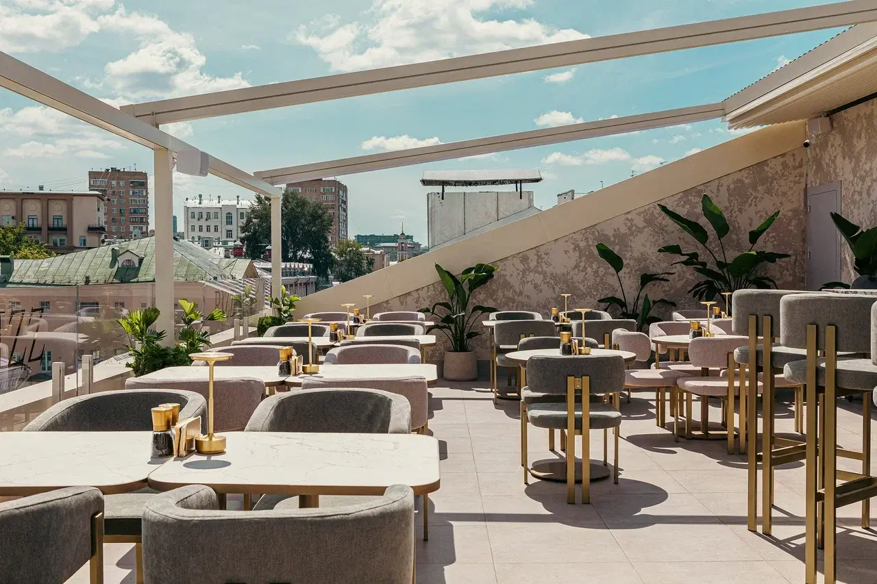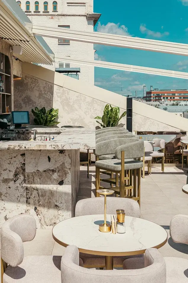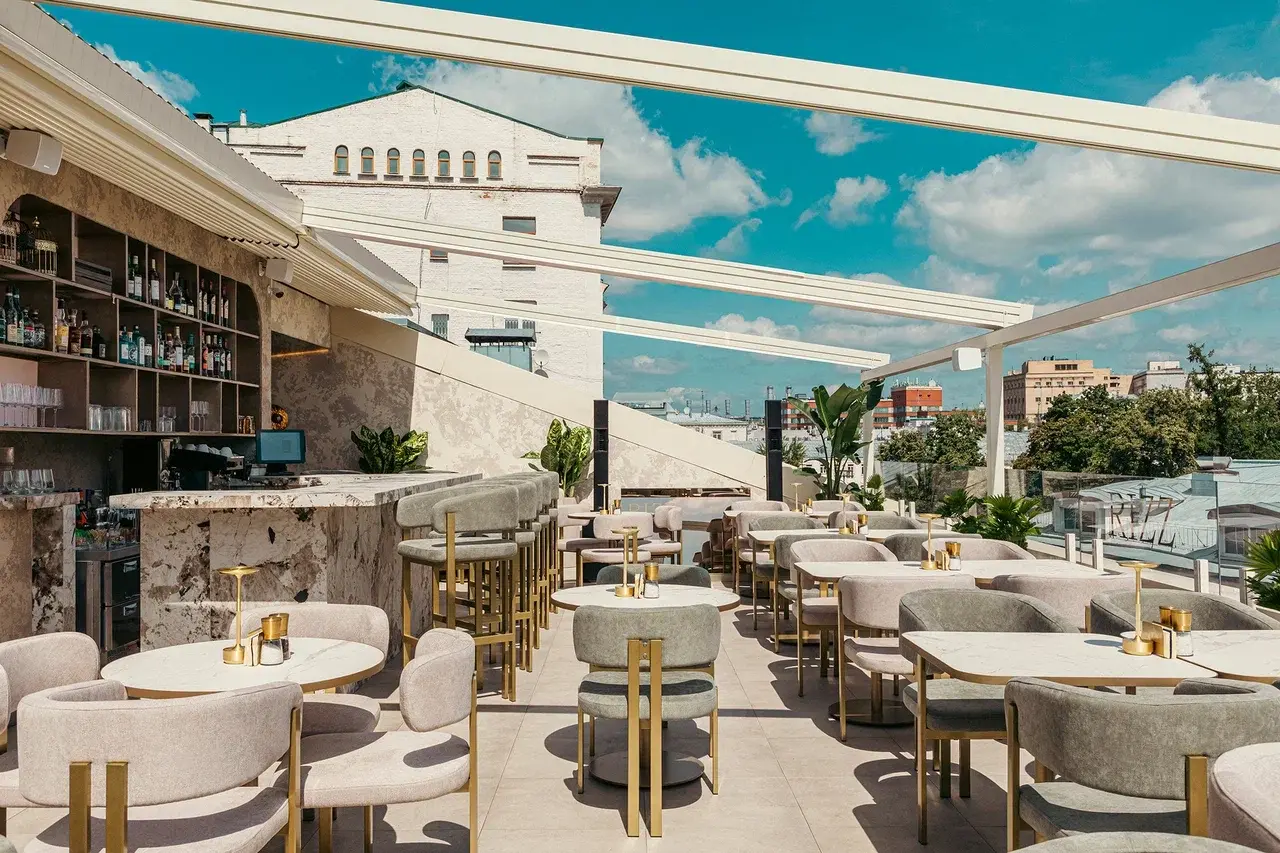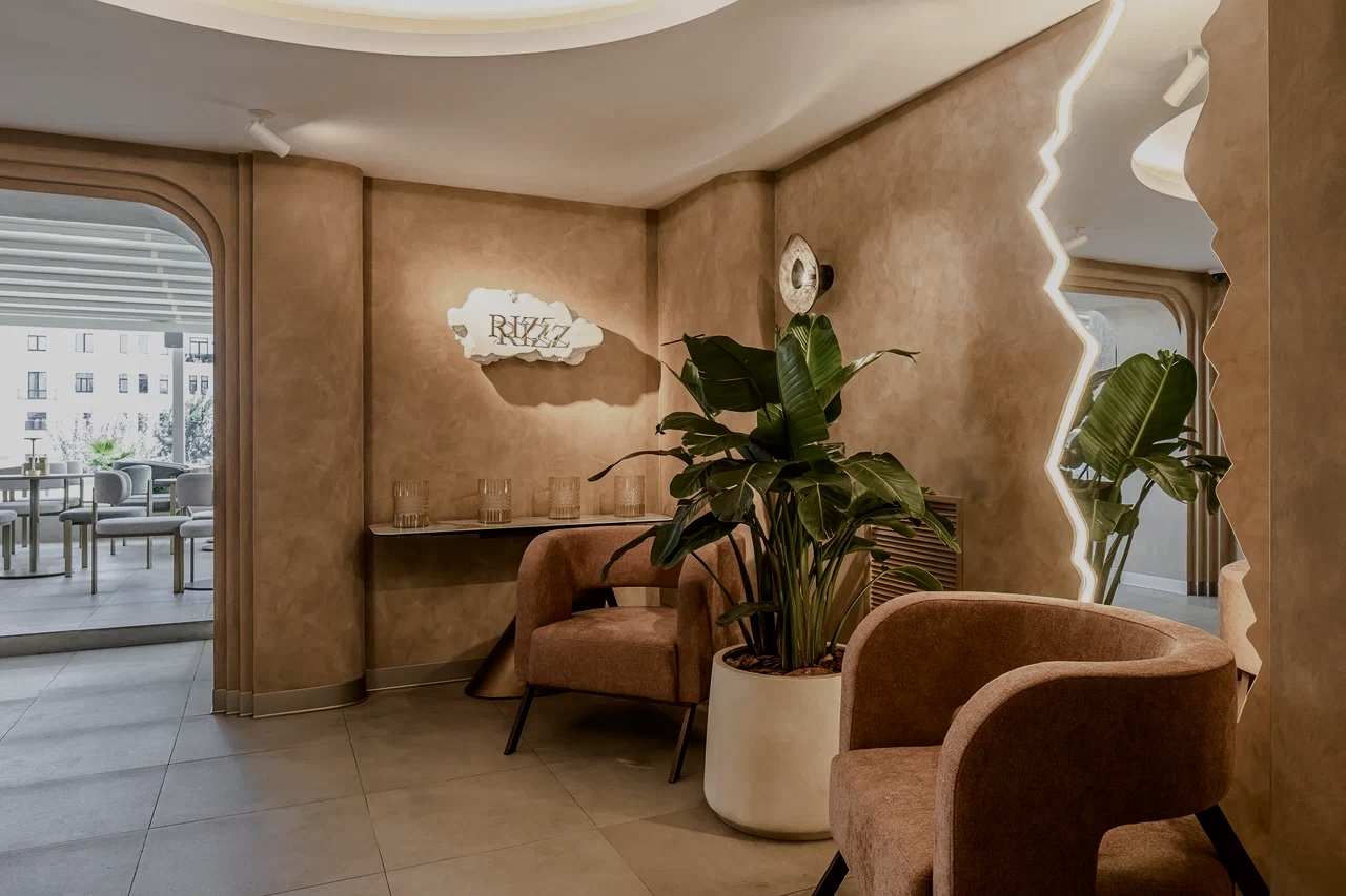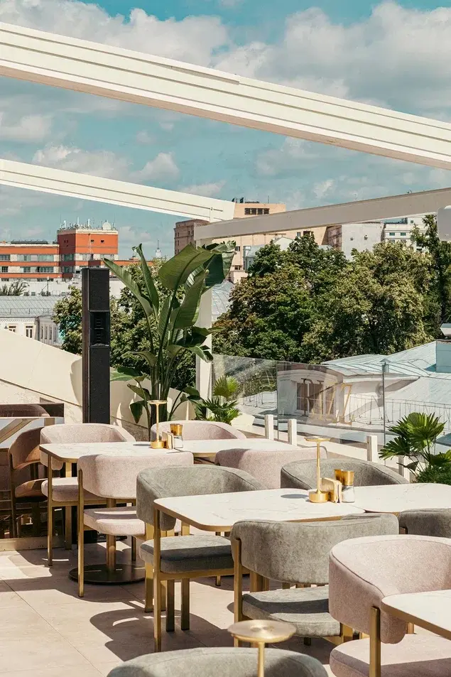 Летняя терраса Rizz — это самая масштабная видовая площадка Замоскворечья, способная комфортно разместить до 70 гостей. Ее уникальный дизайн, вдохновленный средиземноморским стилем, гармонично сочетает натуральные, природные оттенки и пышные пальмовые растения. Пространство дополнено баром, оформленным в стиле высококлассных гостиных лучших отелей Сингапура и Гонконга, что обеспечивает исключительный уровень комфорта и роскоши.