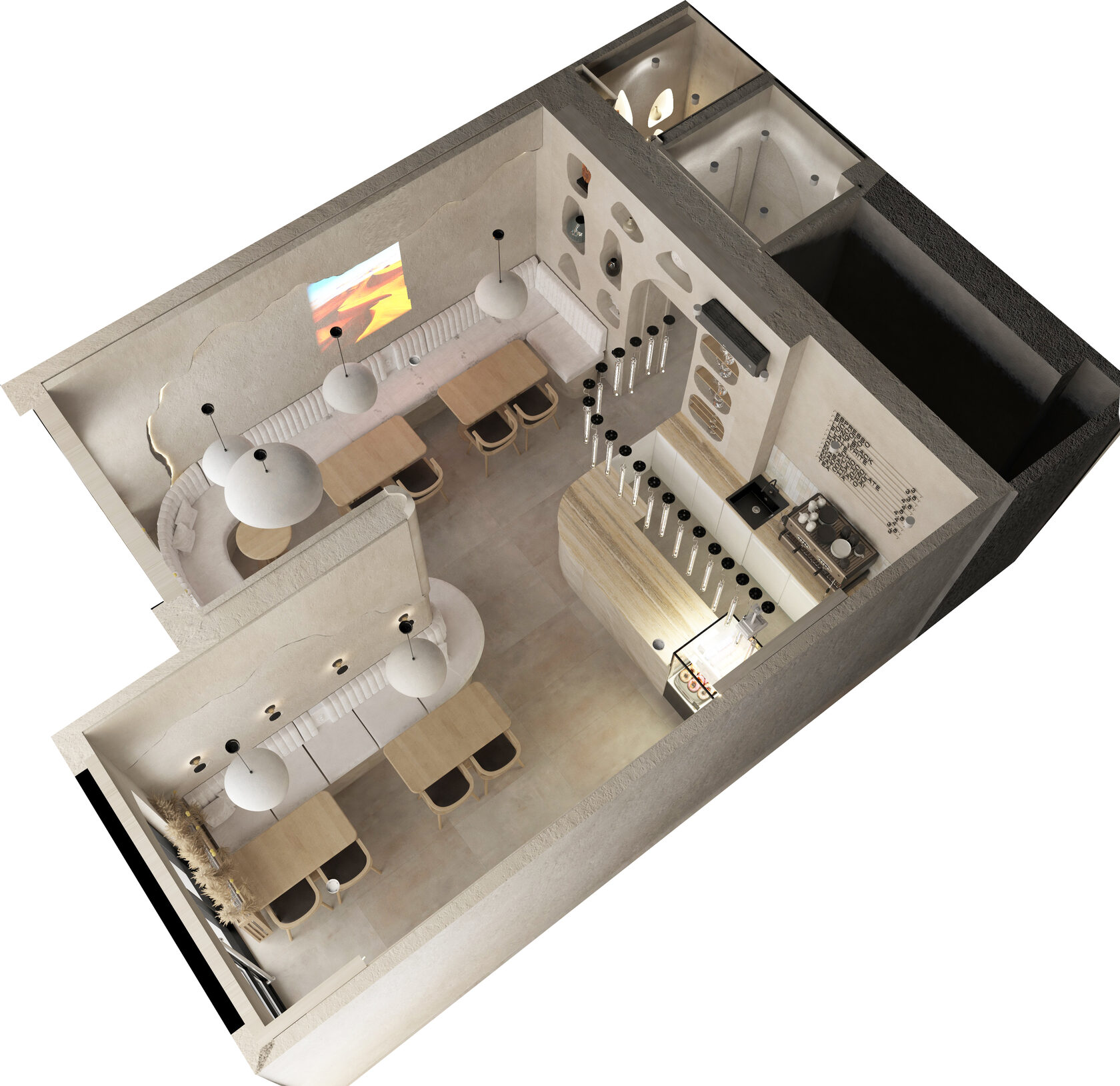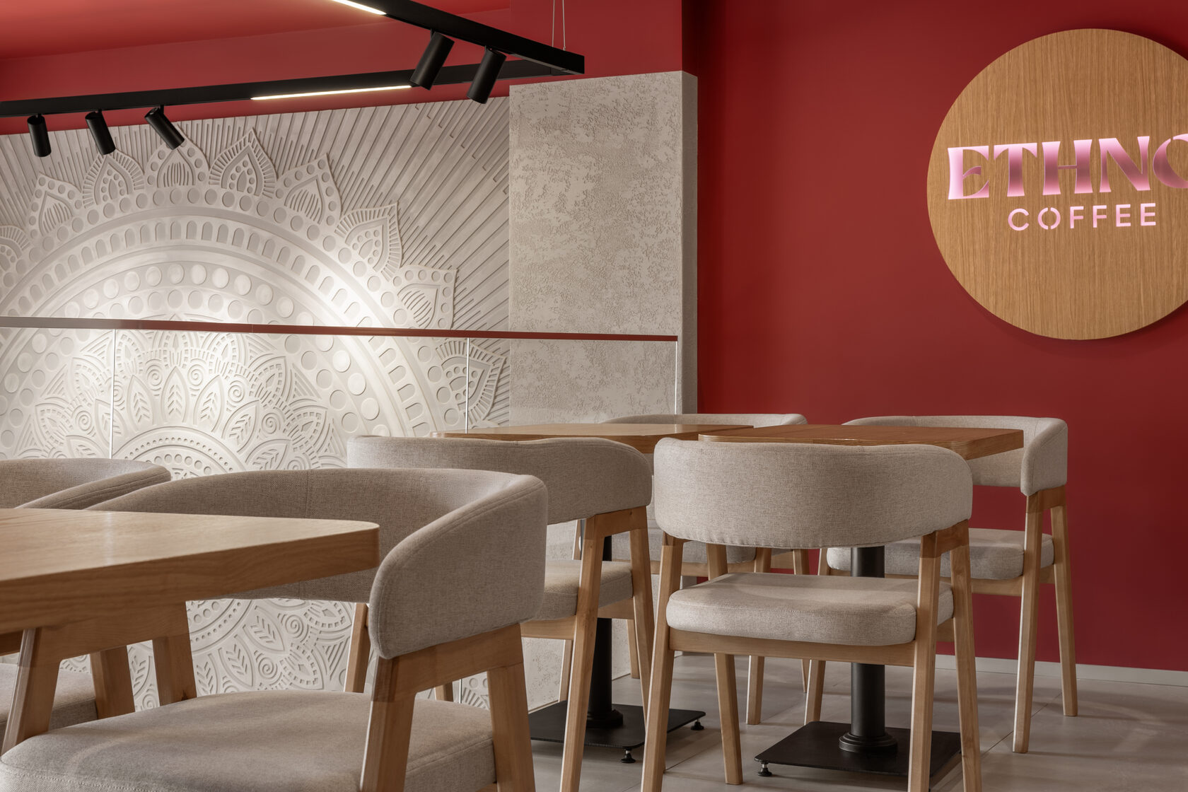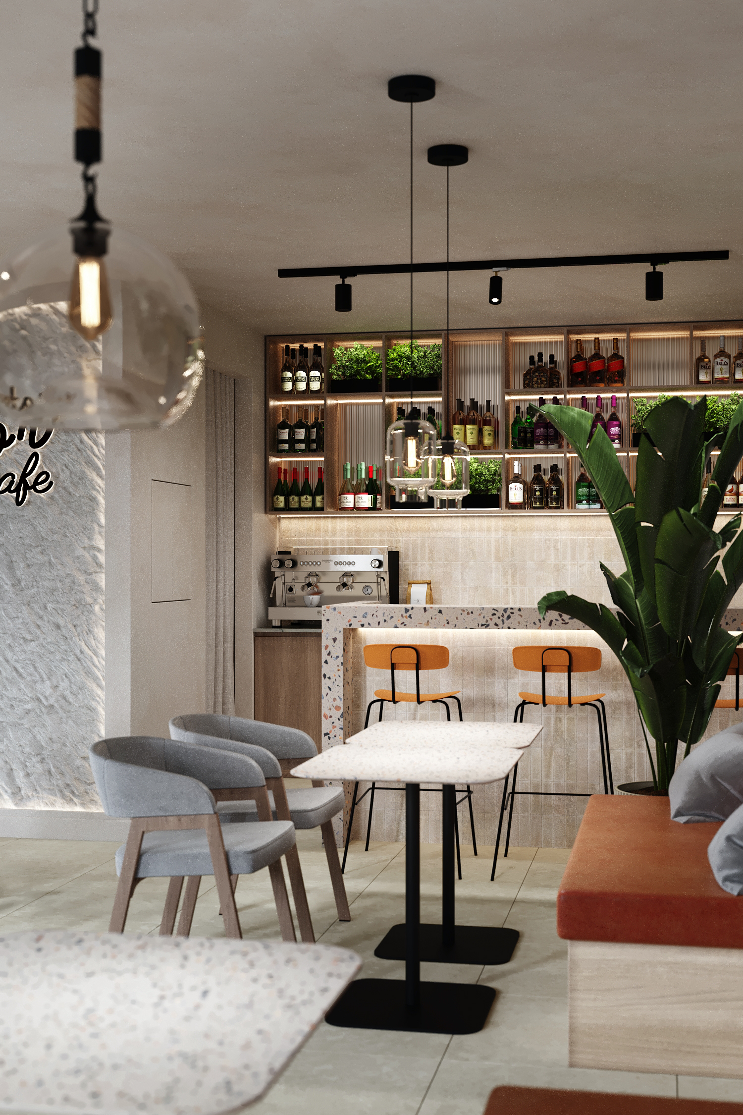 Итог: Результатом является уникальное пространство кофейни, которое, несмотря на свои компактные размеры, выглядит просторным и функциональным. Интерьер искусно сочетает в себе эстетику и комфорт, предлагая посетителям не просто место для кофе, а полноценное погружение в атмосферу, где современный дизайн гармонично переплетается с душой этнических традиций, создавая притягательный и запоминающийся опыт.