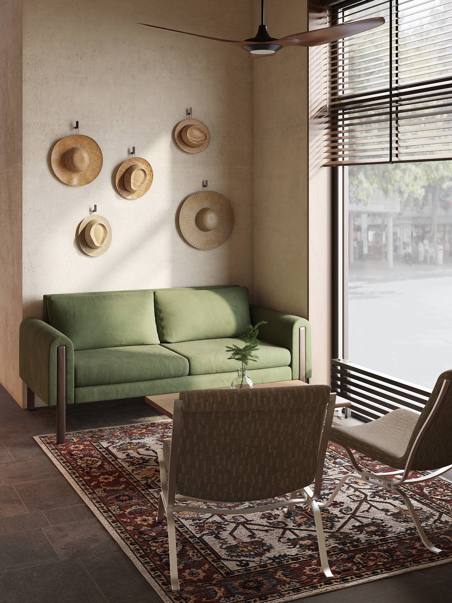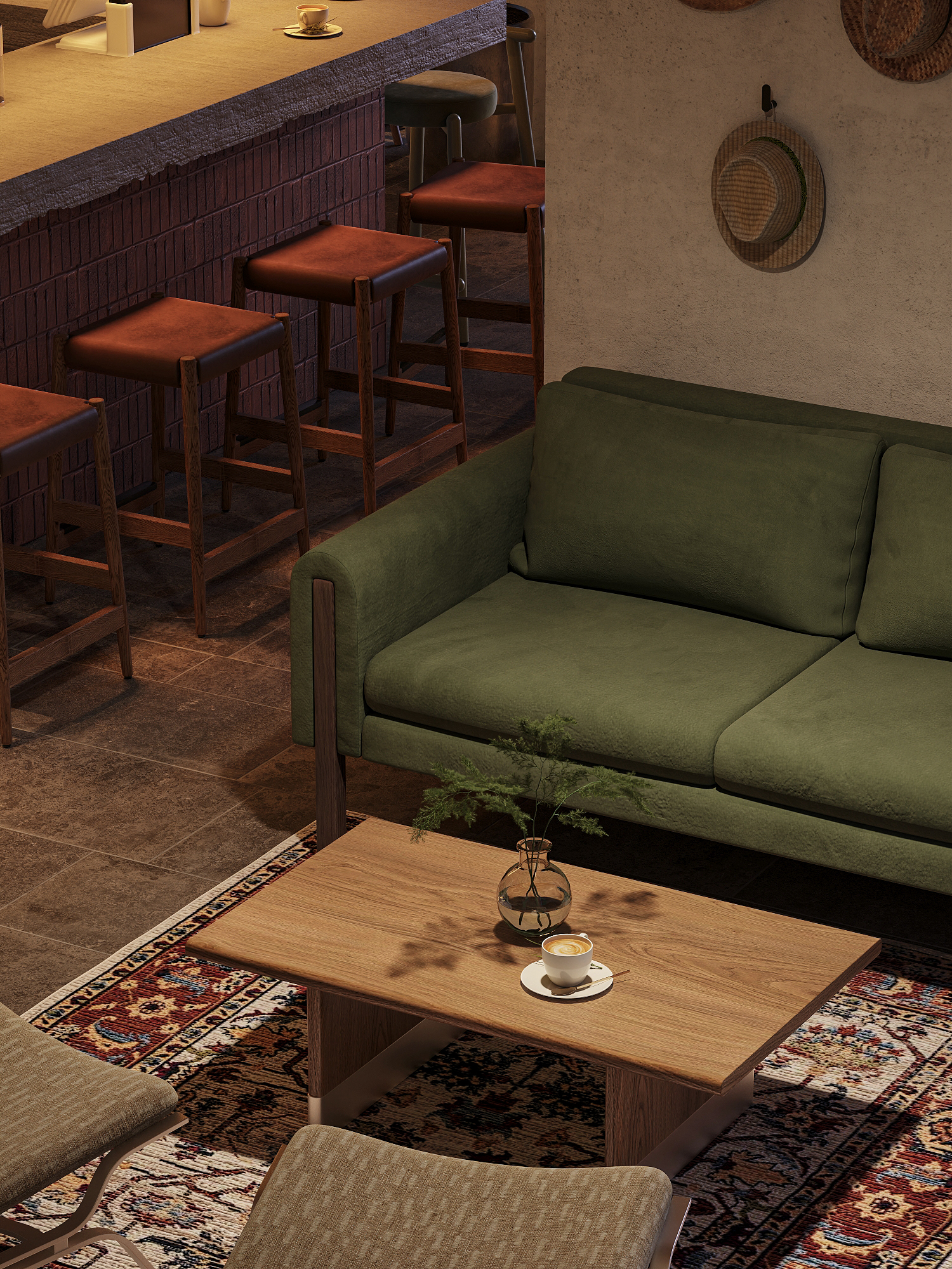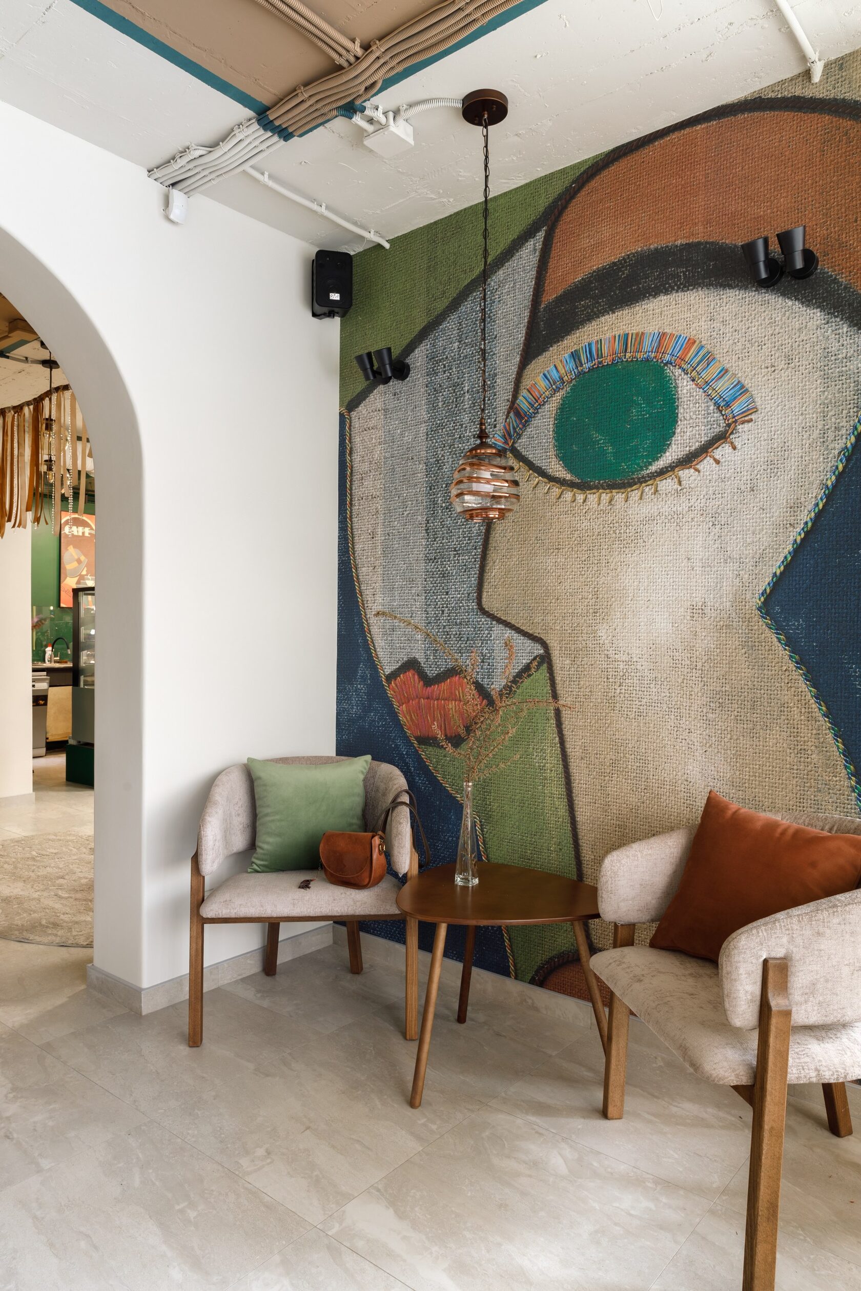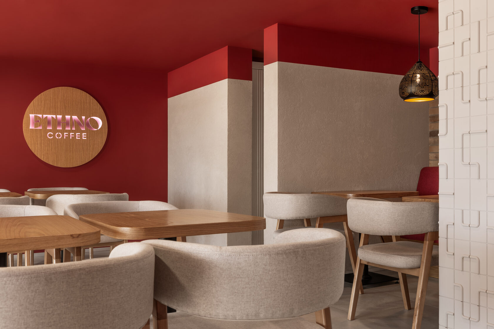 Итог: Результатом является уникальное пространство кофейни, которое, несмотря на свои компактные размеры, выглядит просторным и функциональным. Интерьер искусно сочетает в себе эстетику и комфорт, предлагая посетителям не просто место для кофе, а полноценное погружение в атмосферу, где современный дизайн гармонично переплетается с душой этнических традиций, создавая притягательный и запоминающийся опыт.