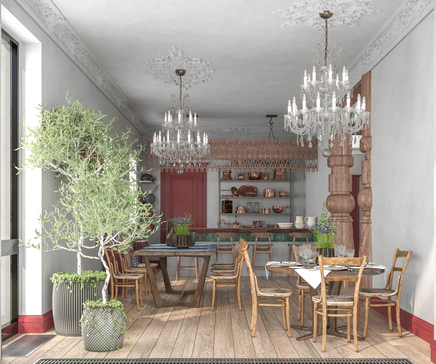 Проект интерьера ресторана, призванный погрузить посетителей в аутентичную атмосферу настоящего грузинского дворика. Трехстороннее остекление формирует уникальную основу для концепции, а стена у входа превращена в открытую «террасу» с традиционной кухней. Характерные элементы декора, обильная зелень в горшках и барная стойка из грубой кирпичной кладки создают ощущение теплого летнего дворика, полного жизни и уюта.