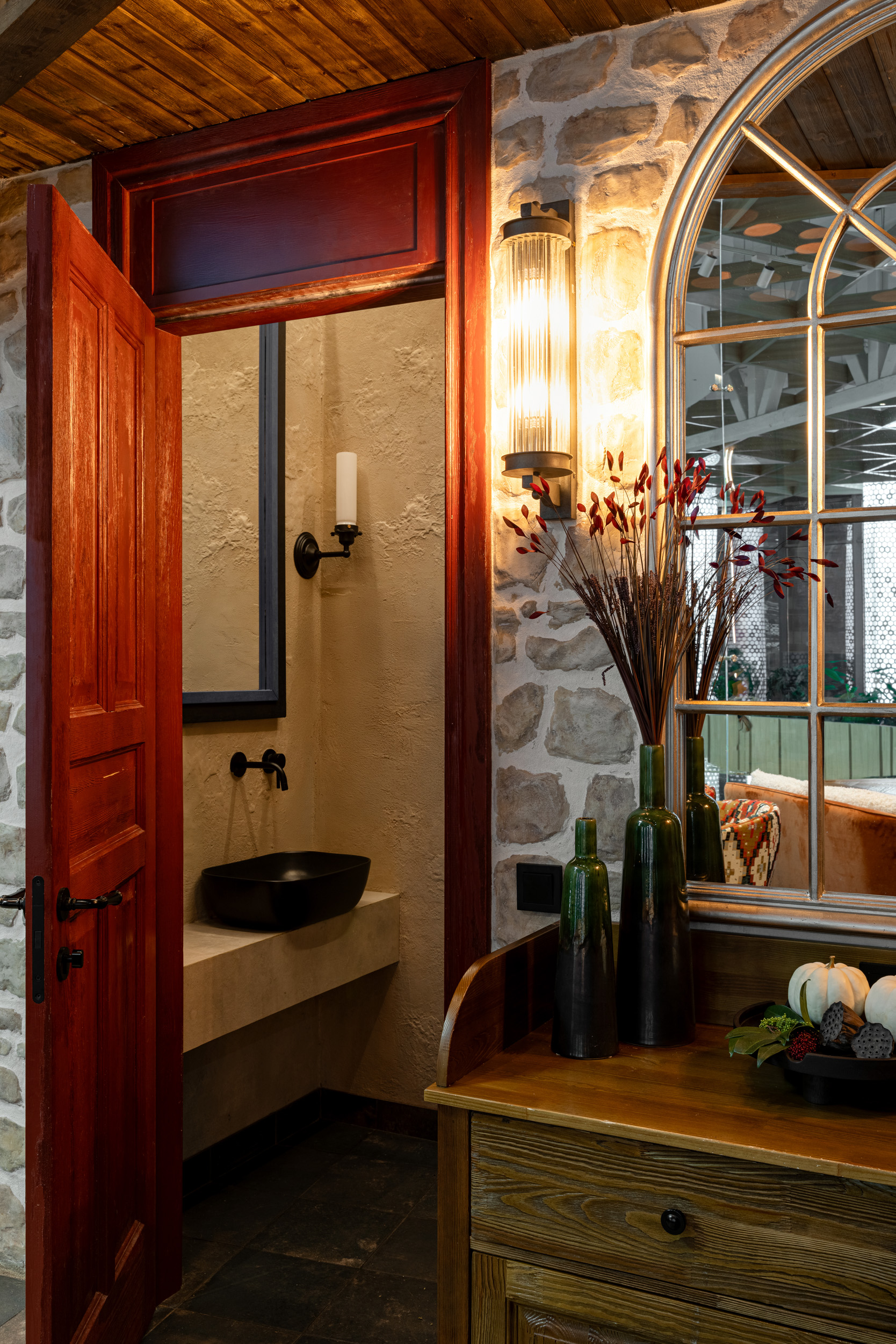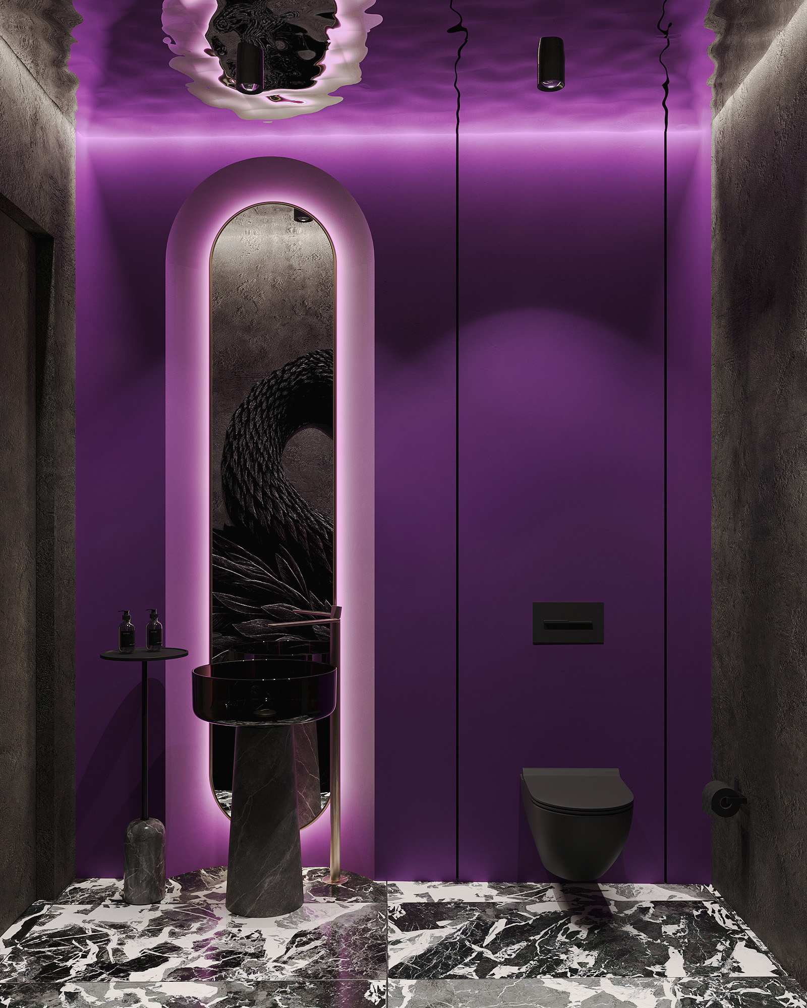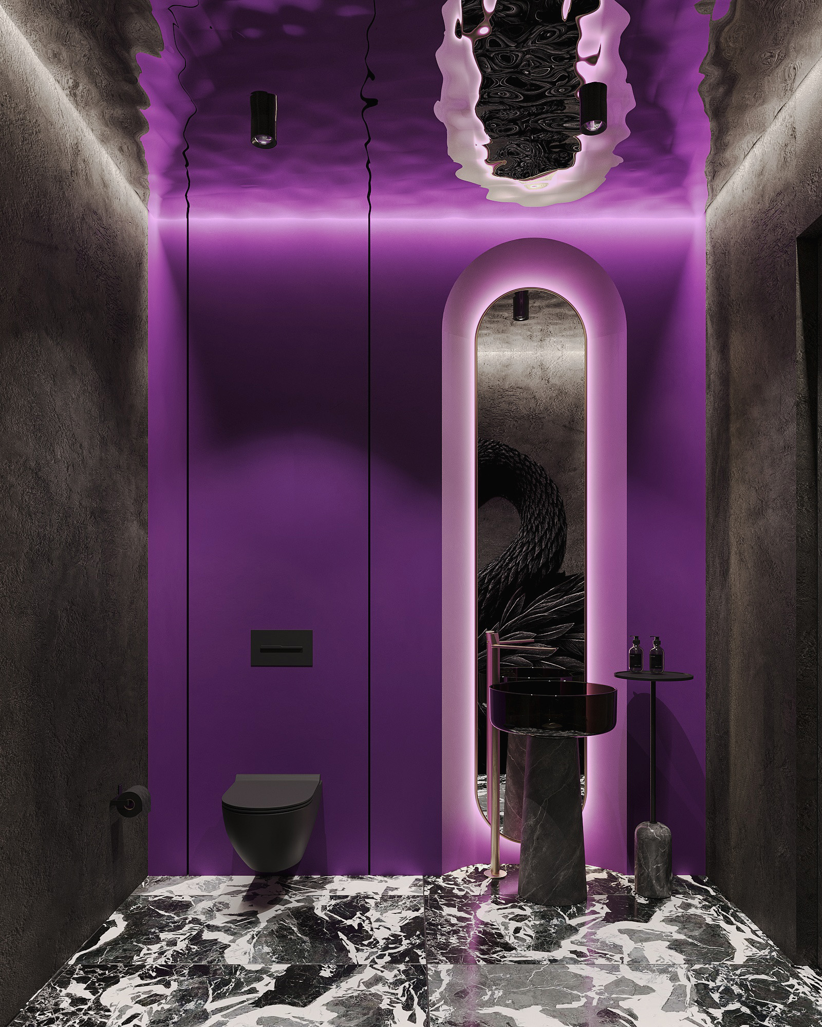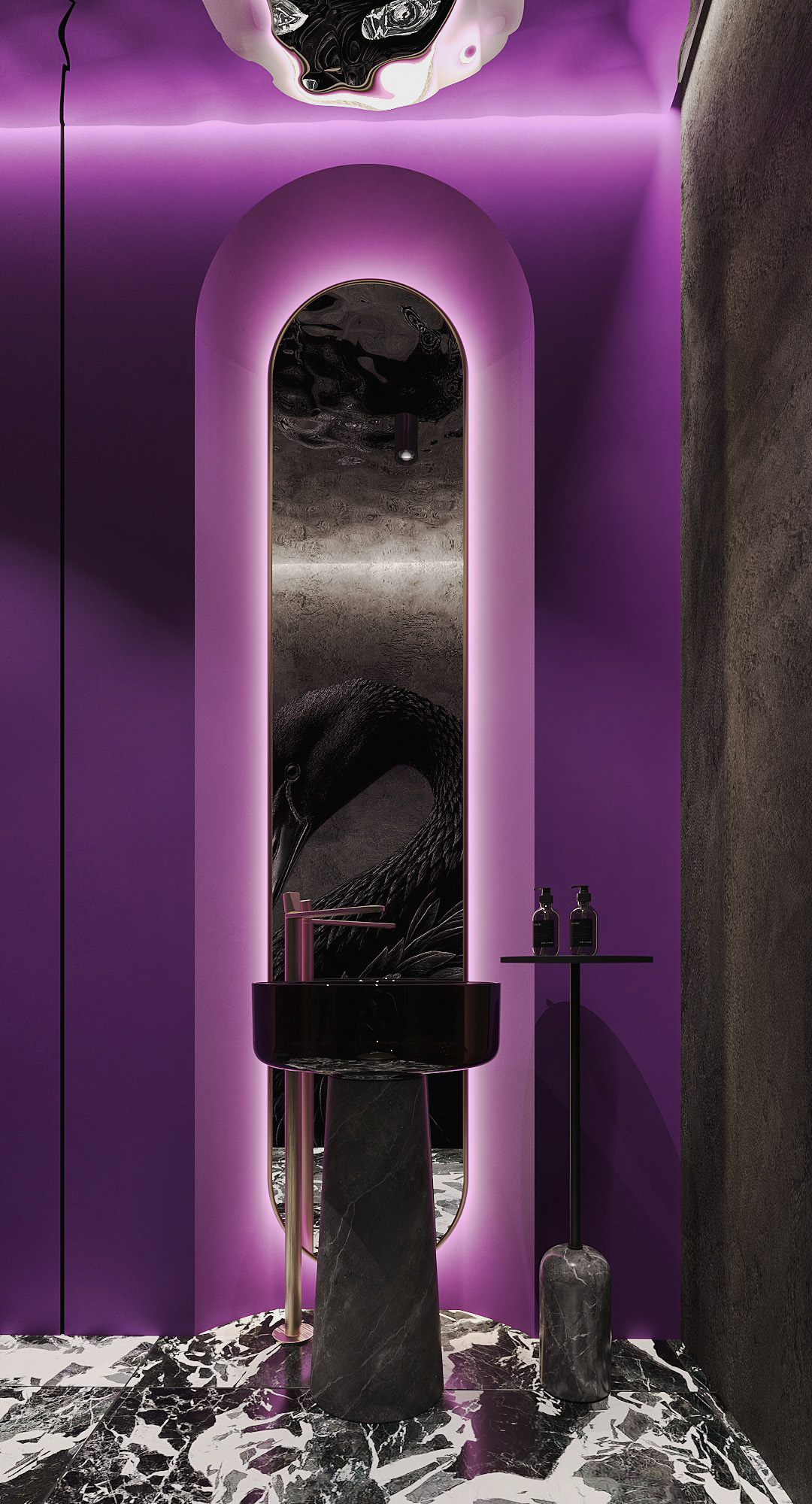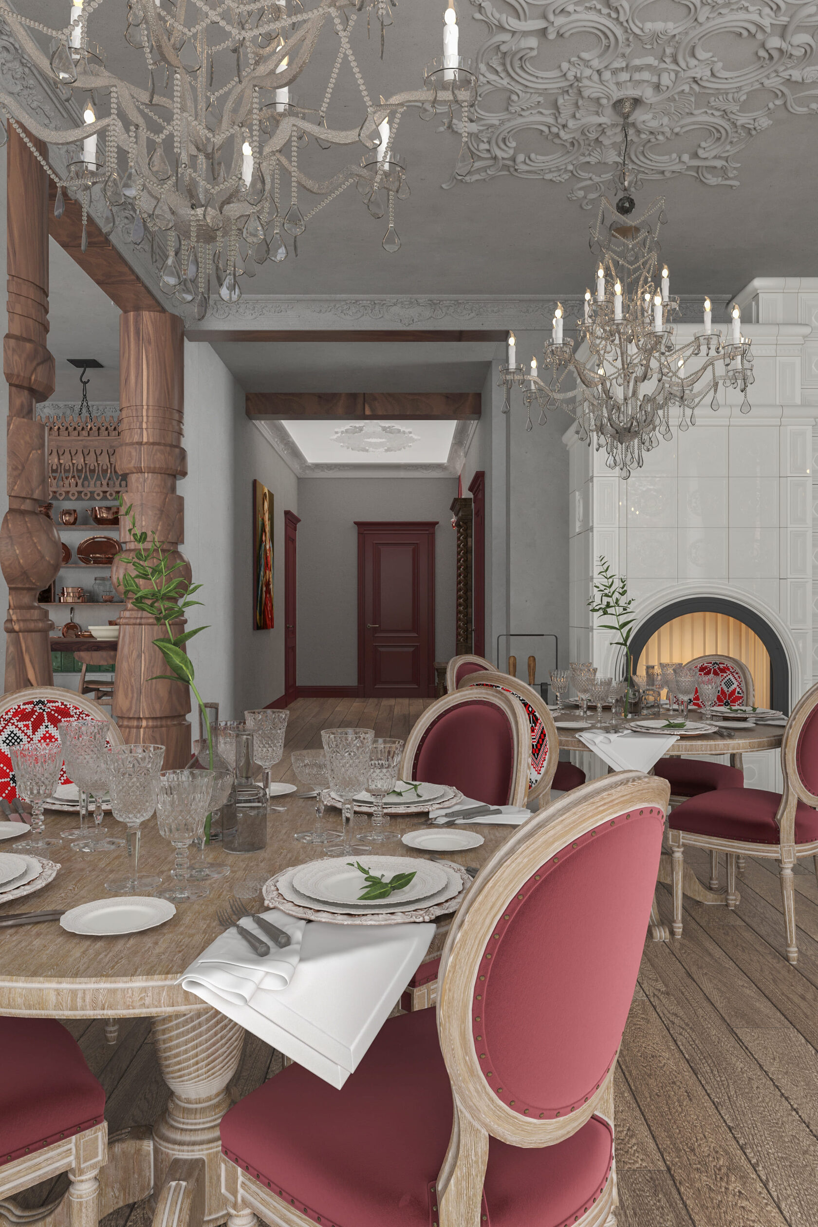Концепция: Основная идея проекта — воссоздание духа эпохи боярства и баров XV-XVI веков с применением современных дизайнерских приемов. Цветовая палитра строится на глубоких пурпурно-красных и изумрудно-зеленых оттенках, создающих торжественное и мистическое настроение. Концепция объединяет богатство орнаментов, декоративную живопись, иронию в деталях, таких как картины с гусями и необычное оформление санузлов, с элементами аристократической роскоши – кирпичной кладкой, каретной стяжкой и авторскими арт-объектами.