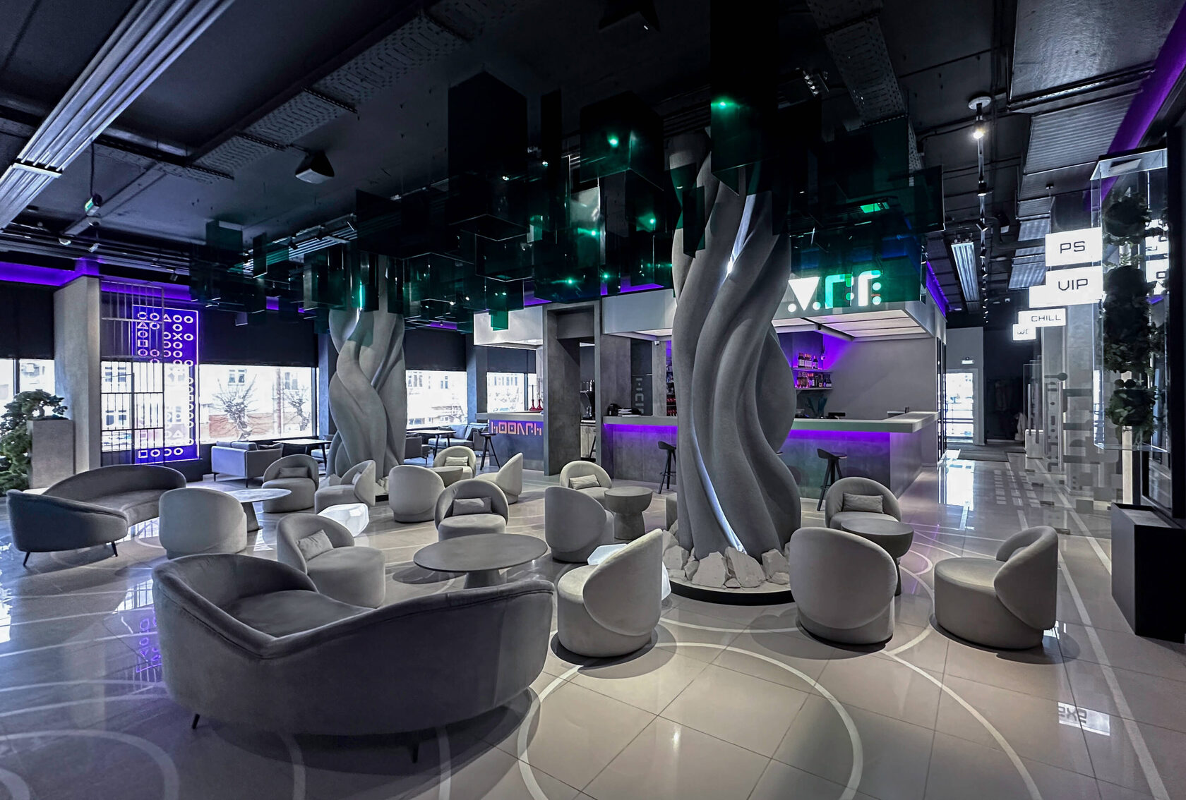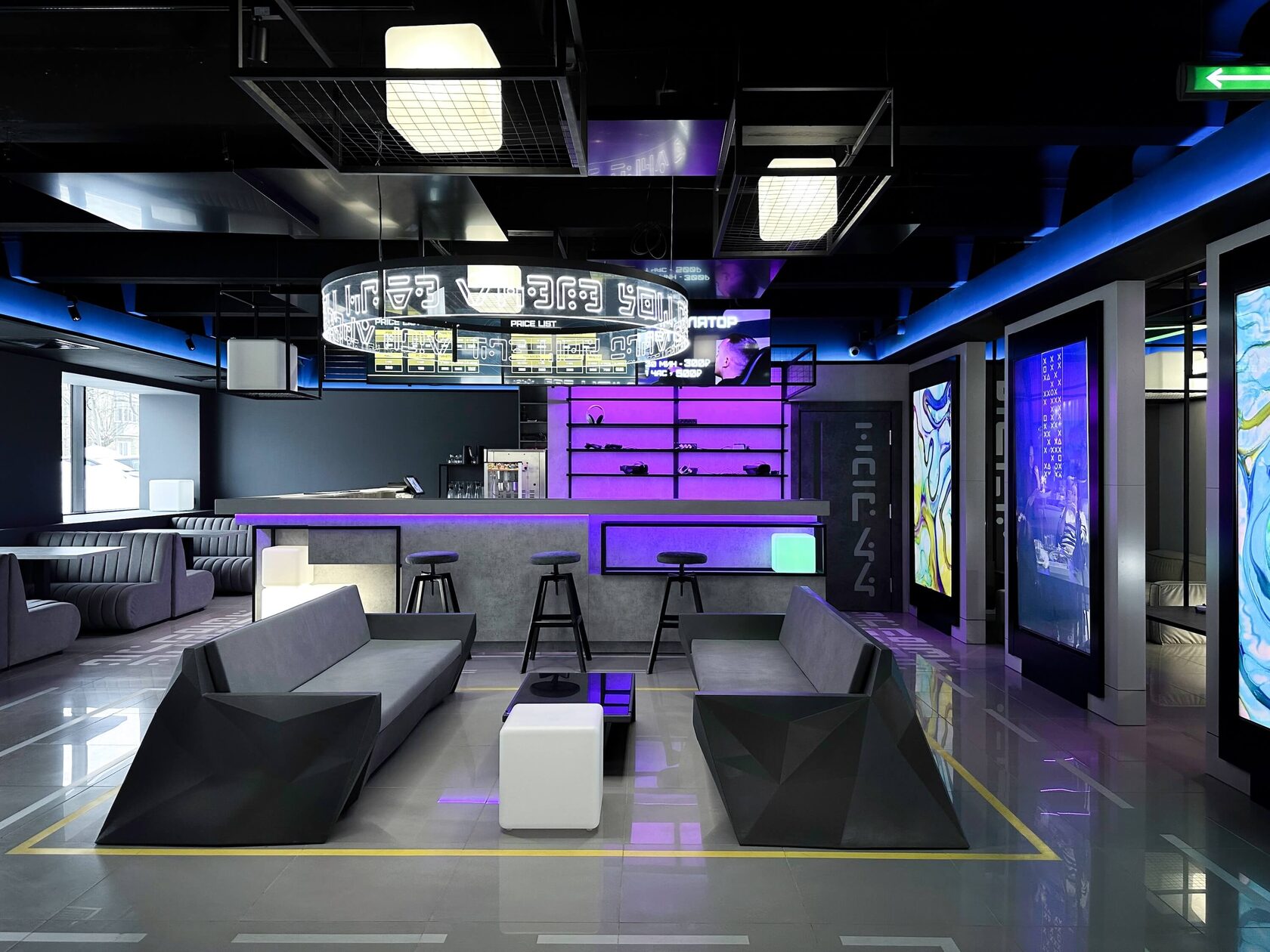 Концепция: Создать уникальный мир будущего, объединяющий геймеров, креативных людей и любителей технологий, через смелый дизайн, зонирование и продуманное управление светом и звуком. Проект соединяет динамику кибергорода и спокойствие зоны отдыха, создавая многослойное пространство современного развлечения.