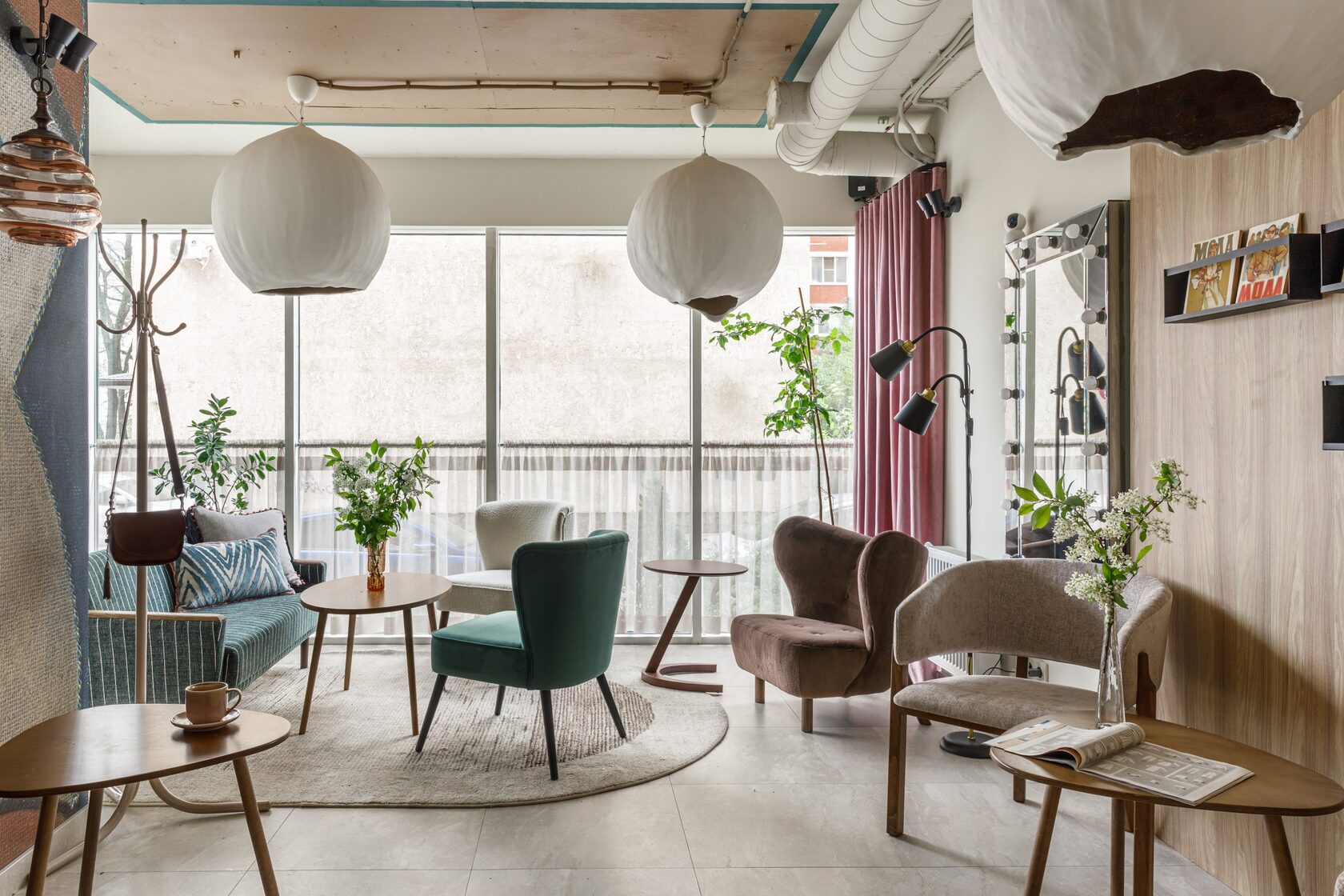 Зона отдыха расположена у панорамных окон, наполняя зал естественным светом;