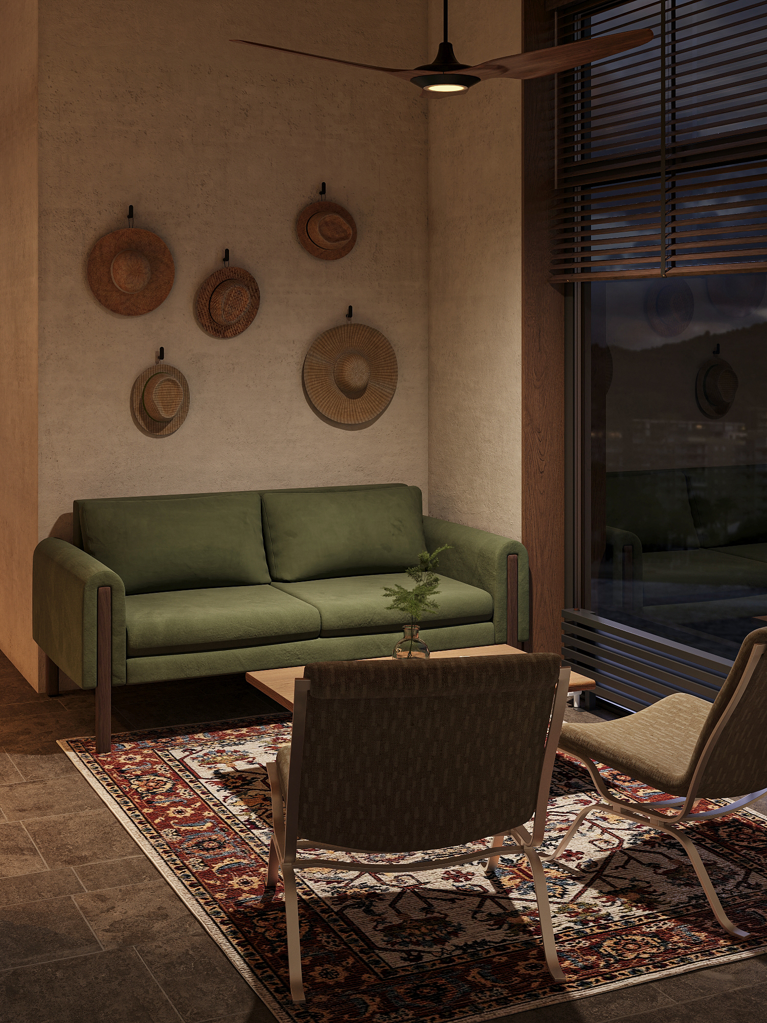Проект разработан как современное и комфортное пространство для семейного отдыха, вдохновлённое русскими культурными мотивами. Он ориентирован на гостей всех возрастов — от детей до пожилых, обеспечивая каждому удобную, тёплую и эстетически насыщенную атмосферу. Пространство общей площадью 179,69 м² включает открытую летнюю террасу (55,2 м²) с высокими потолками (3,4 м), что усиливает ощущение простора и света. Проект стал результатом курсового проектирования и продемонстрировал, как этнический стиль может органично вписываться в современные интерьерные решения.