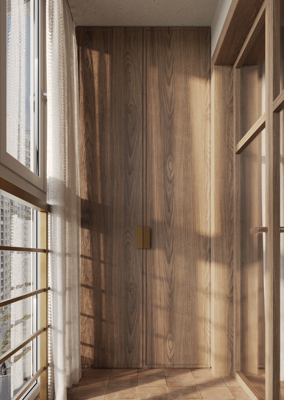 Окно в соседнее помещение частично закрыли рейками — это позволило сохранить свет и не терять полезную площадь