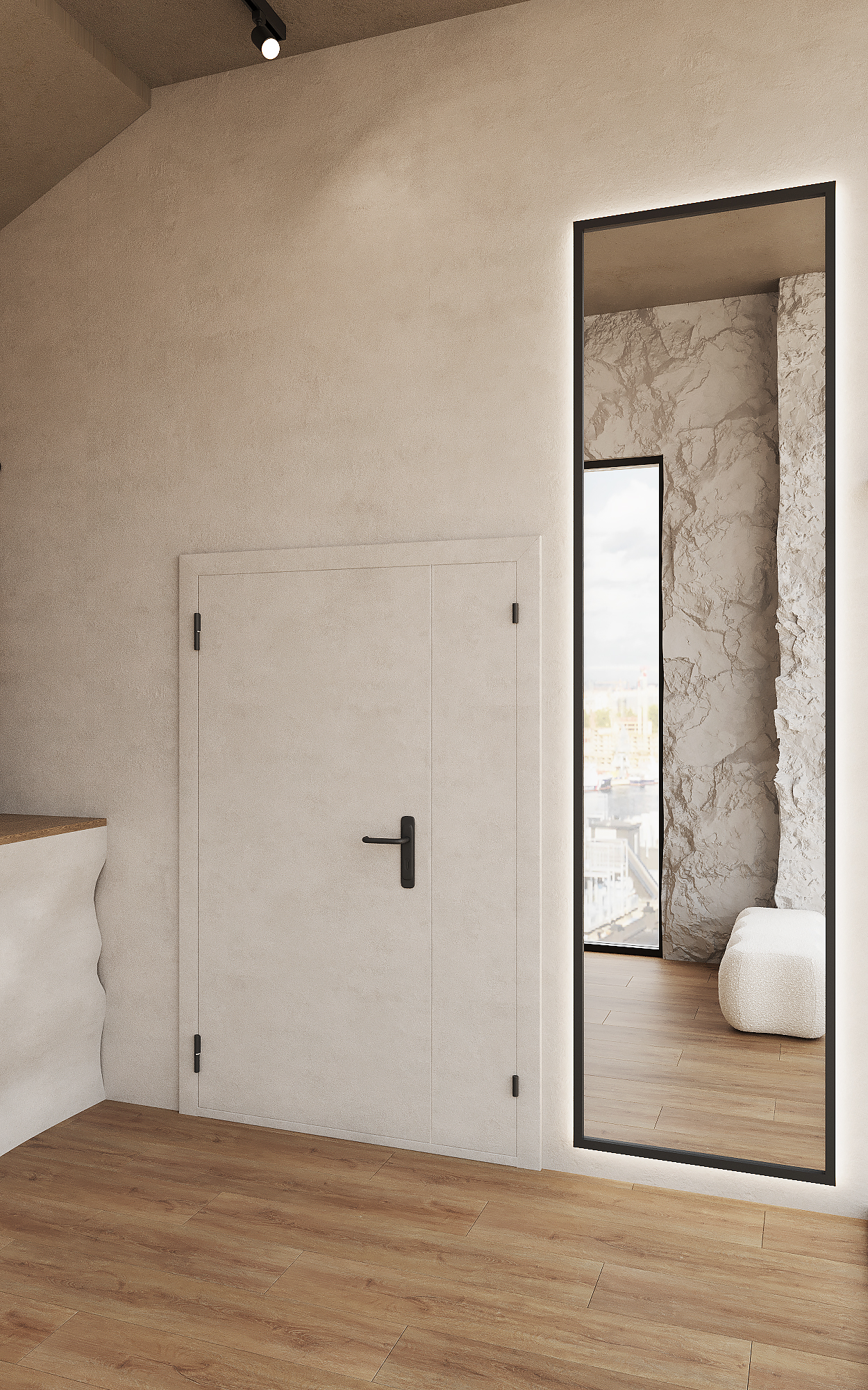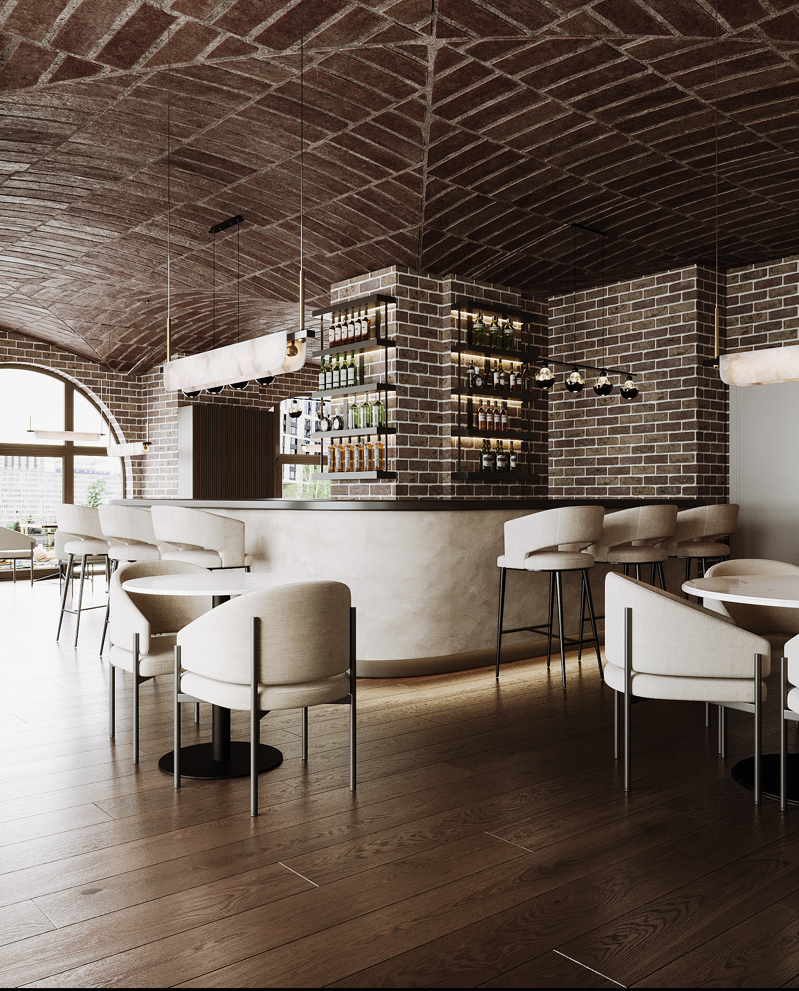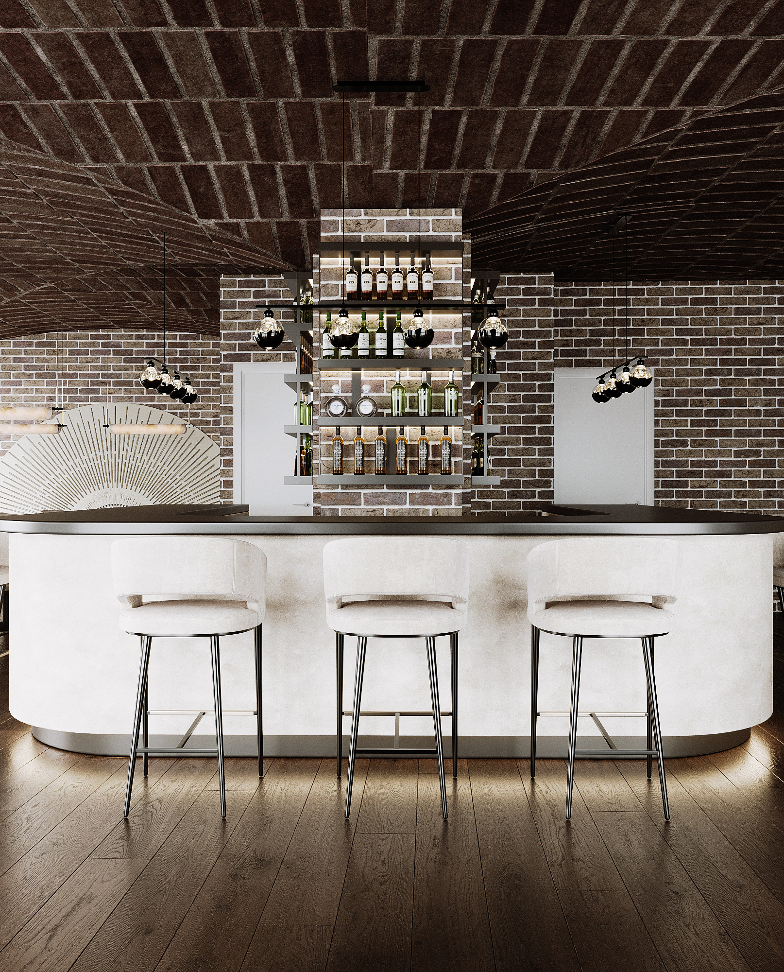 Концепция: Основная концепция проекта базировалась на поиске гармоничного баланса между утонченностью и строгостью, интимностью и динамикой, при этом сохраняя и подчеркивая аутентичность старинных стен с минимальной отделкой. Дизайн представляет собой виртуозное слияние индустриального лофта, элегантной геометрии ар-деко и изысканной неоклассики. В интерьере доминирует спокойная палитра серо-бежево-молочных тонов, создающая эффект «тихой роскоши». Особое внимание уделено плавным, округлым формам мебели и многослойной системе освещения, которая искусно подчеркивает текстуры материалов и создает неповторимое настроение. Центральными акцентами пространства стали два уникальных декоративных панно: одно из дерева и металла, второе — с рукотворным орнаментом в русском стиле на деревянном основании.