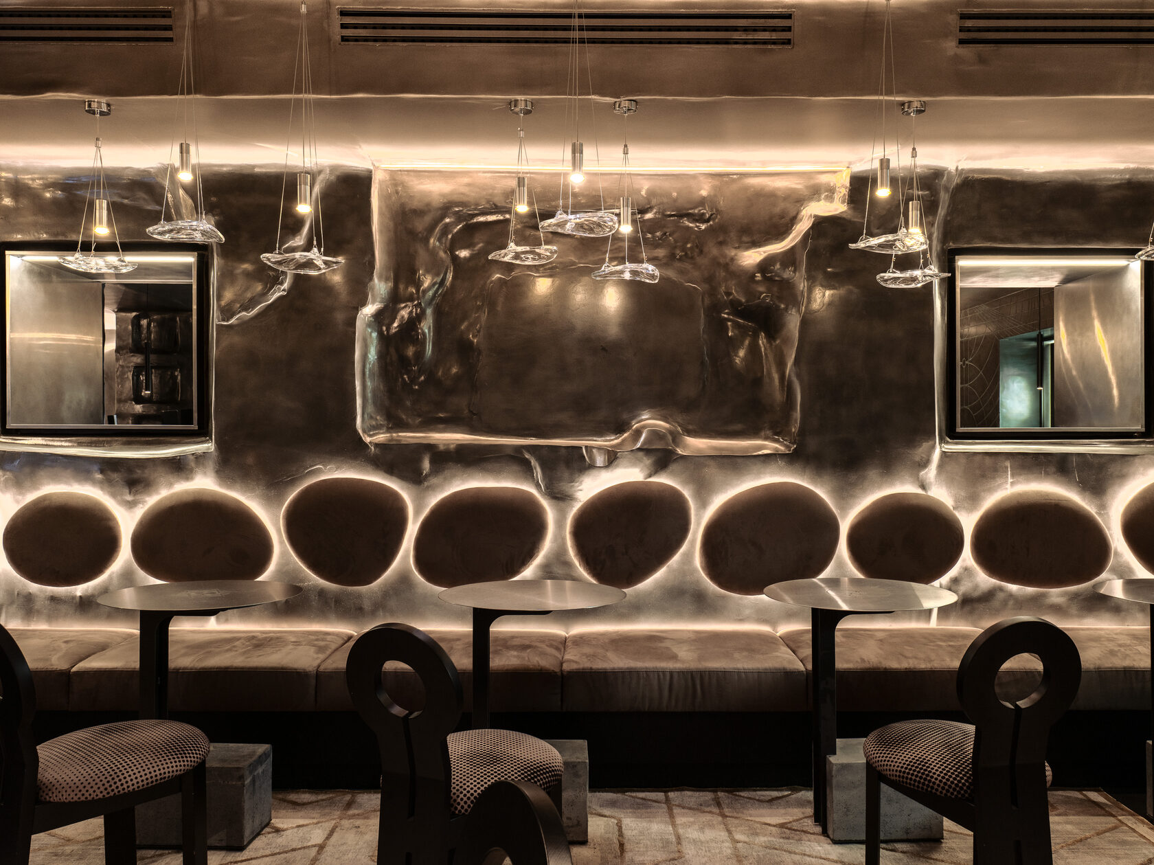 Бар «Морган» — это уникальное пространство, разработанное для искушенной публики, ценящей оригинальность и нестандартные решения. Ключевой особенностью является использование жидкого металла, покрывающего стены и потолок, что создает эффект «текучего» пространства. Атмосферу усиливают тщательно продуманное освещение, неожиданные рефлексы от столешниц из нержавеющей стали и загадочные символы, интегрированные в дизайн.