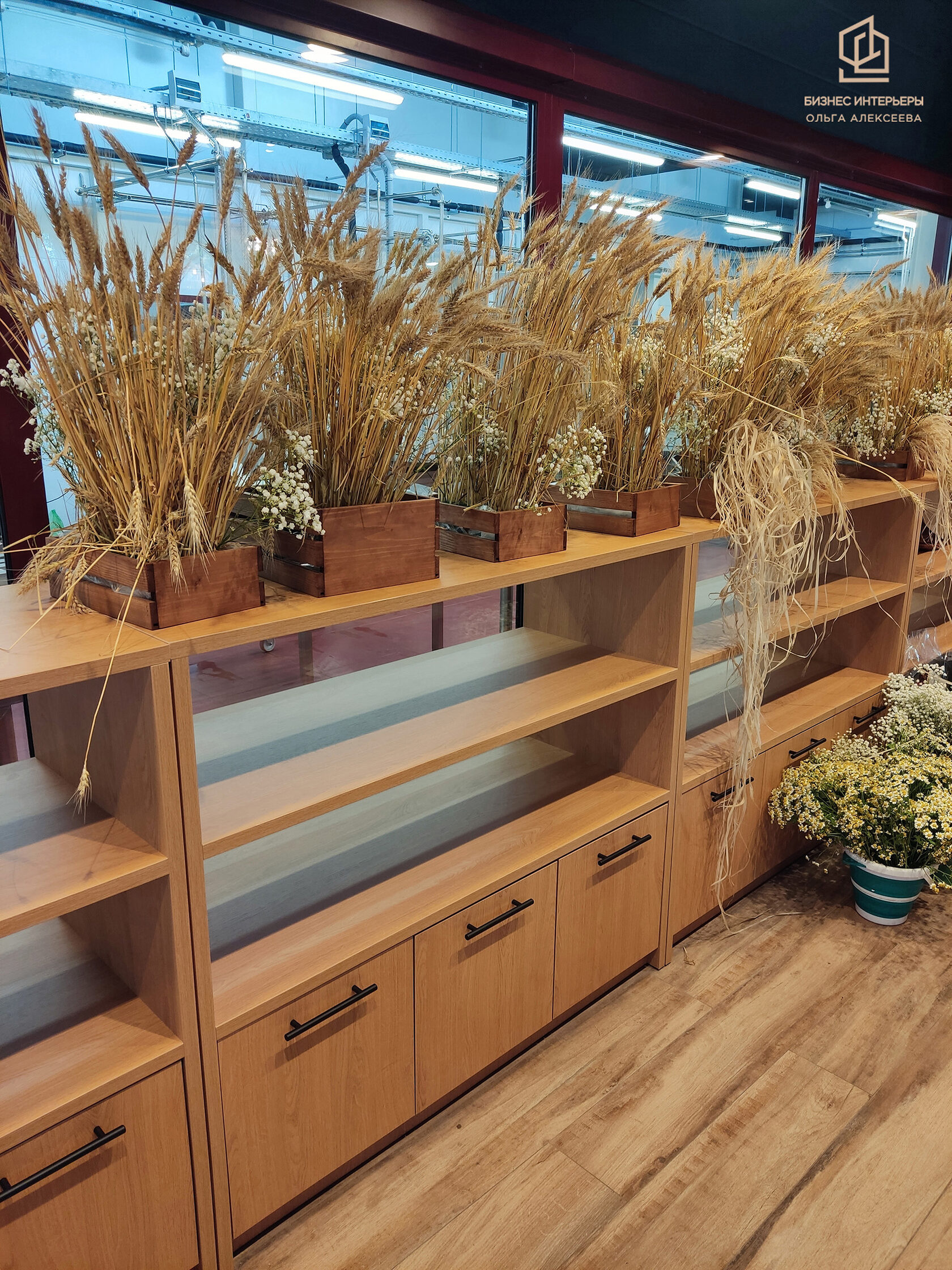 Пришлось немного пожертвовать шириной проходов ради увеличения ассортимента, но на практике это оказалось не минусом, а решением, которое позволяет покупателям быстро ориентироваться и находить нужное. Интерьер выдержан в современном ЭКО-стиле: