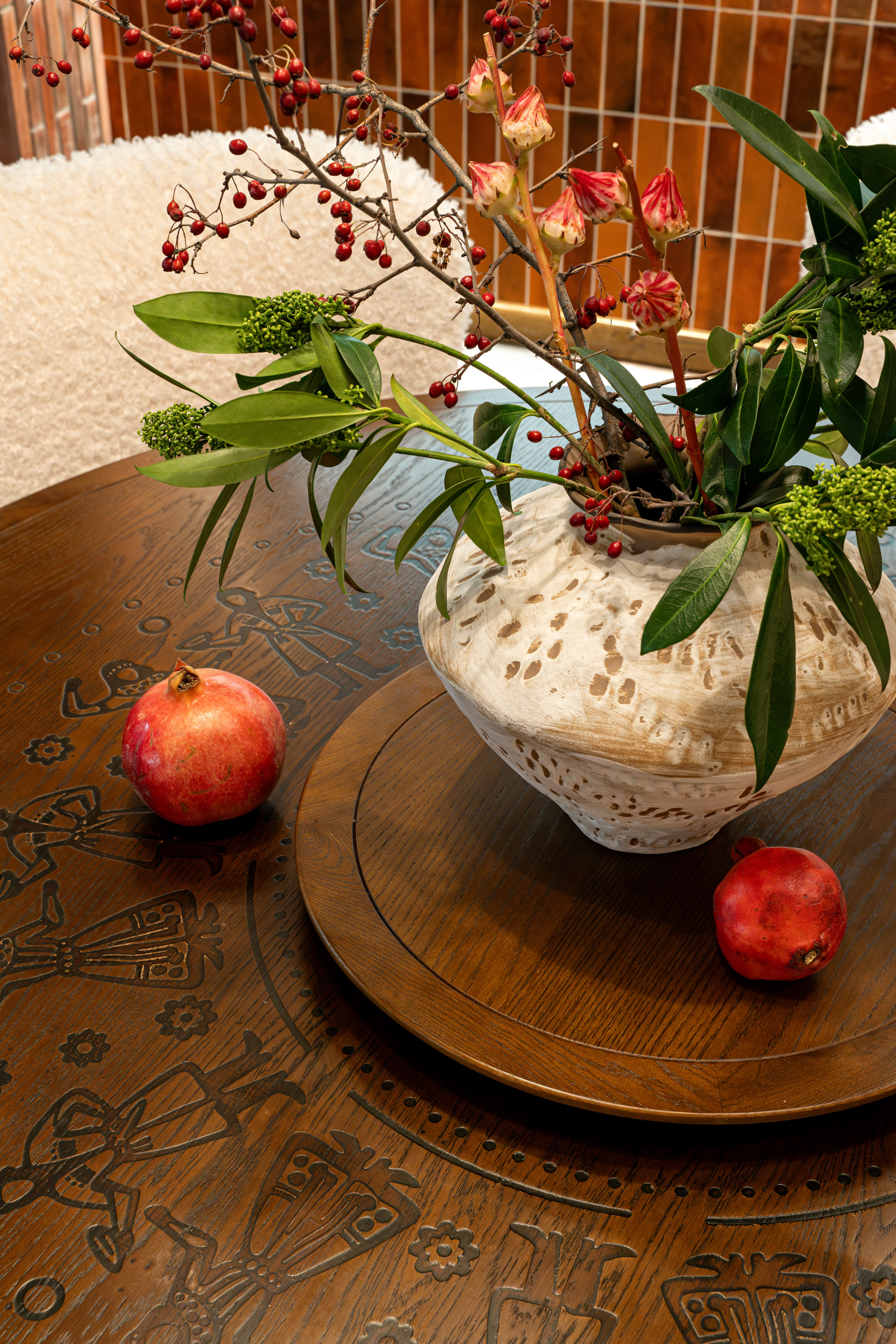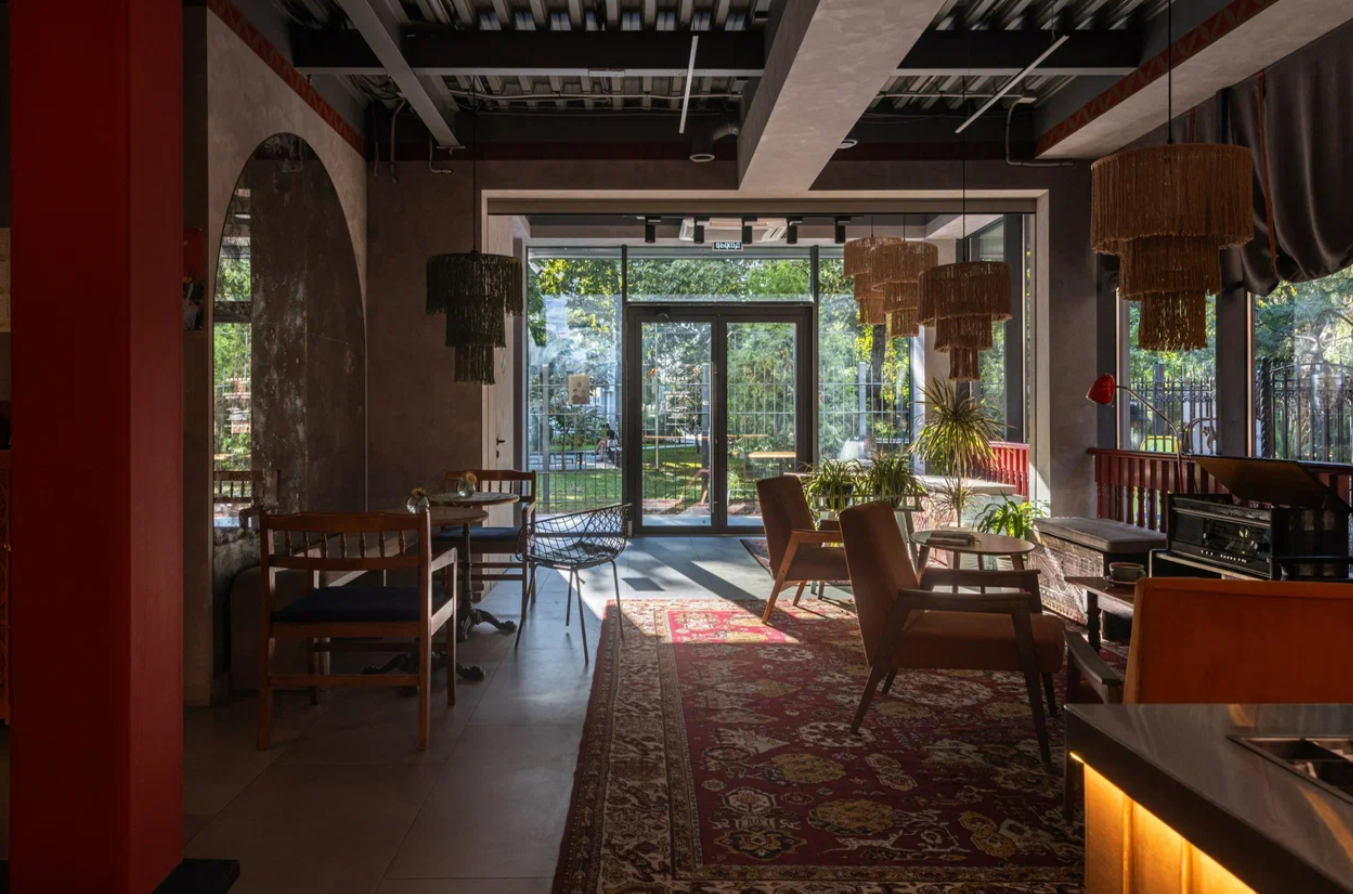 Особую атмосферу задаёт чача-фонтан у входа, отсылающий к традициям гостеприимства. Интерьер насыщен коврами с тбилисских рынков, керамикой ручной работы из Барнаула и элементами современной декоративной скульптуры, выполненными омскими мастерами. Всё это создало гармоничное, этническое, но современное пространство.