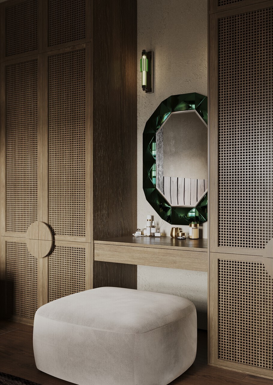 Удобная посадка у зеркальной стены, визуально расширяющей пространство
