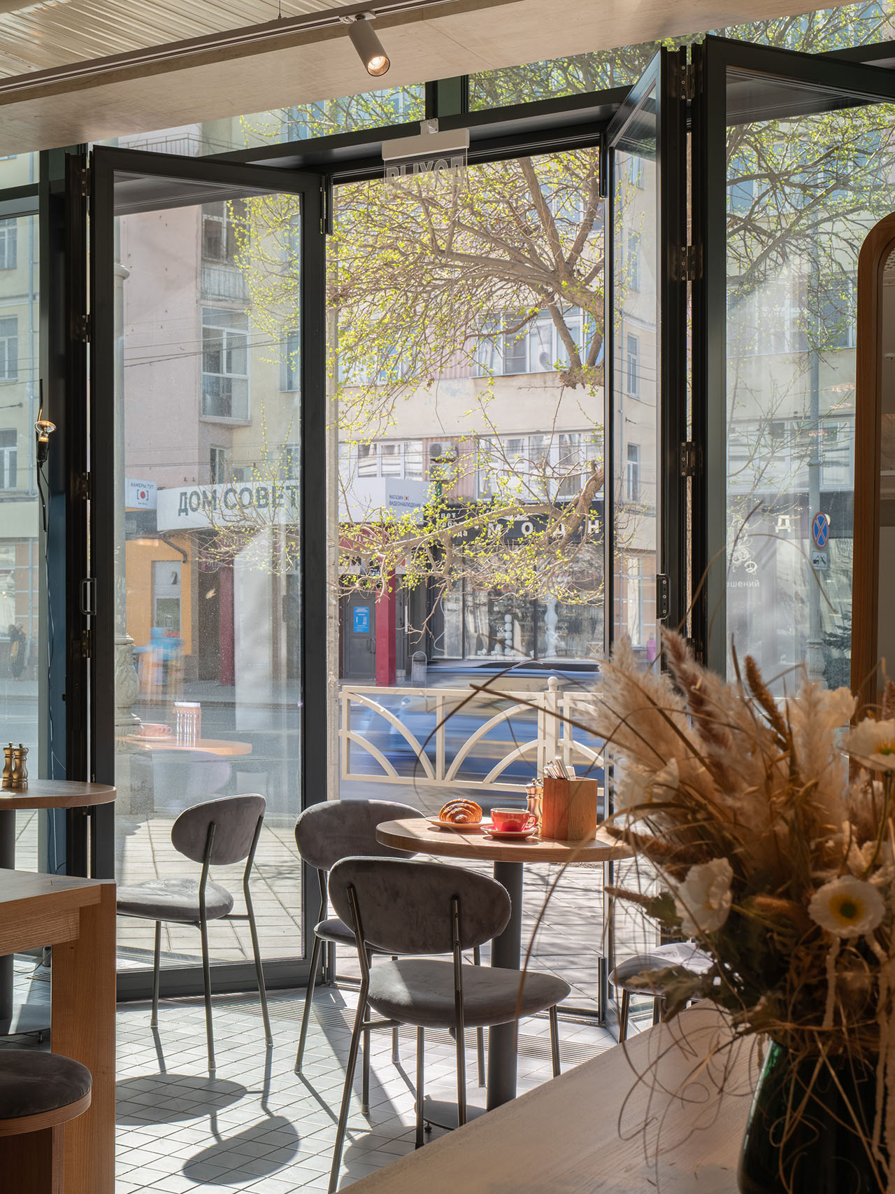 Итог Получилась кофейня-хайку: всего несколько точных штрихов создают законченный образ. Минималистичная сталь бара контрастирует с теплыми деревянными поверхностями, а зеркала и свет играют с восприятием пространства. Это место, где так приятно замедлиться с чашкой кофе, наблюдая за течением реки за стеклом.