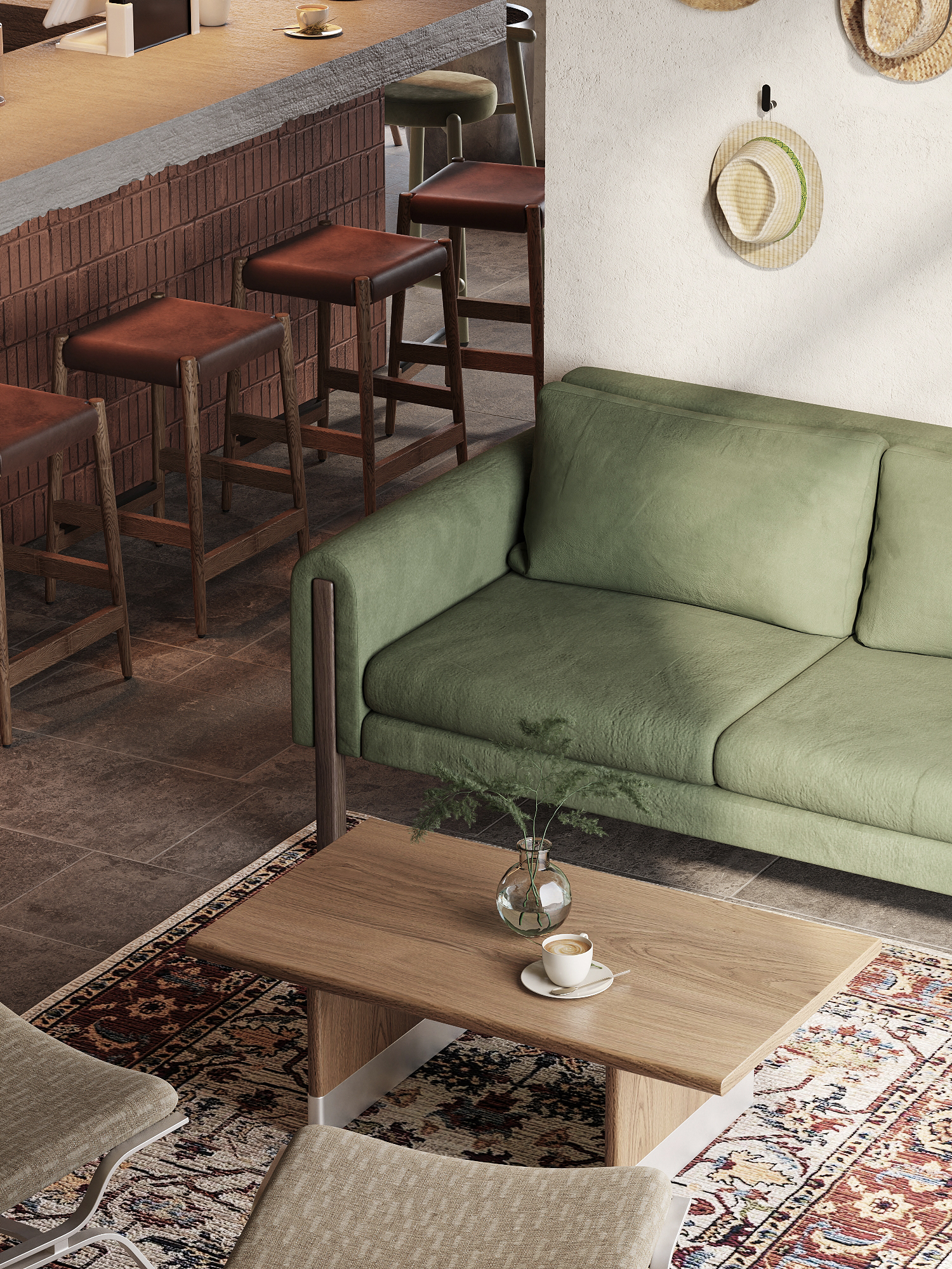 TALK coffee — камерная кофейня площадью 64 м², в которой каждый уголок продуман до мелочей. Планировка включает несколько типов посадки: выразительную барную стойку в центре, уютные диваны у стены, столики вдоль окон для наблюдения за городом и расслабленную лаундж-зону с мягкими креслами. Несмотря на компактный размер, пространство кажется живым, открытым и тёплым — здесь хочется задержаться надолго.
