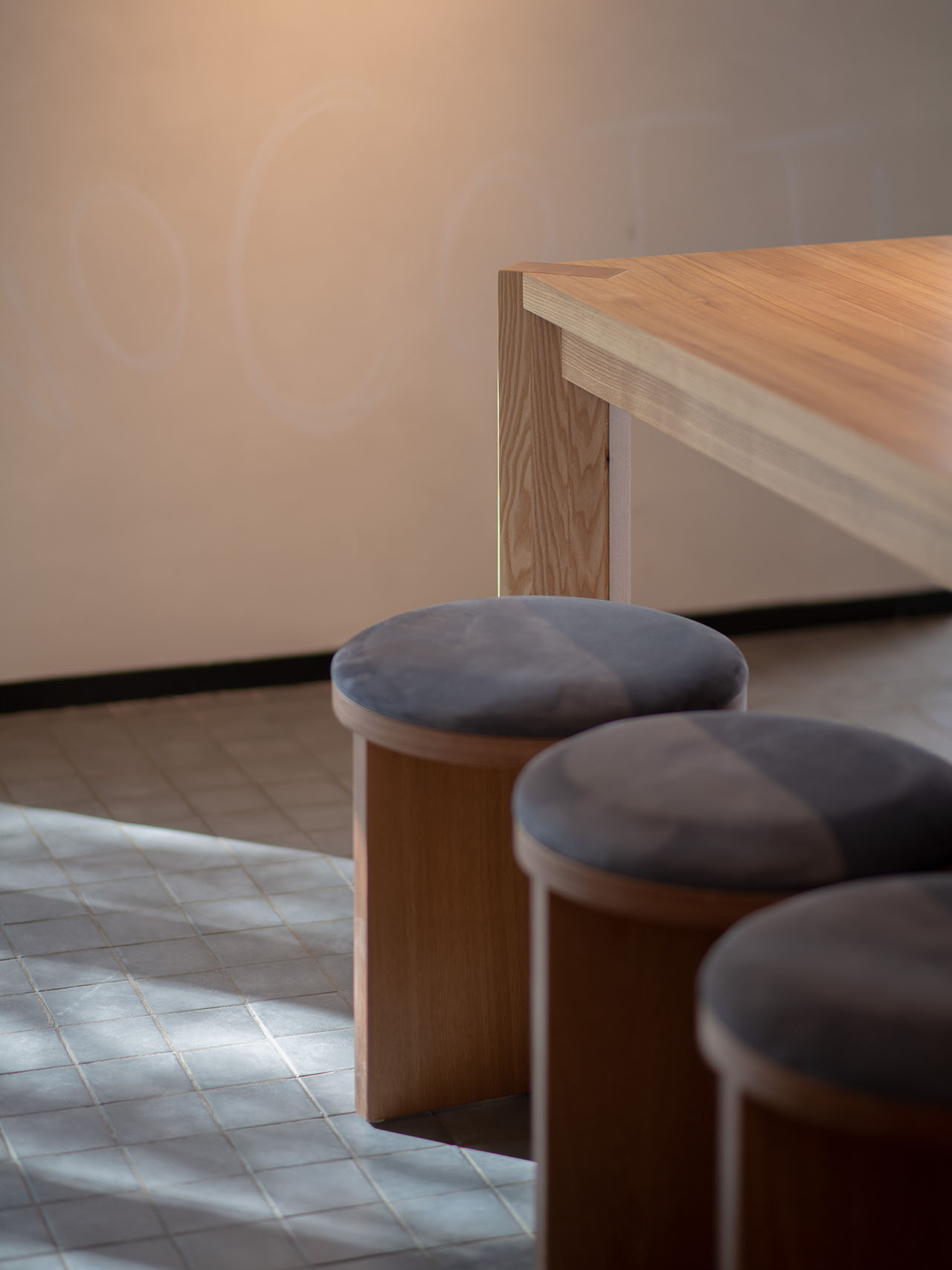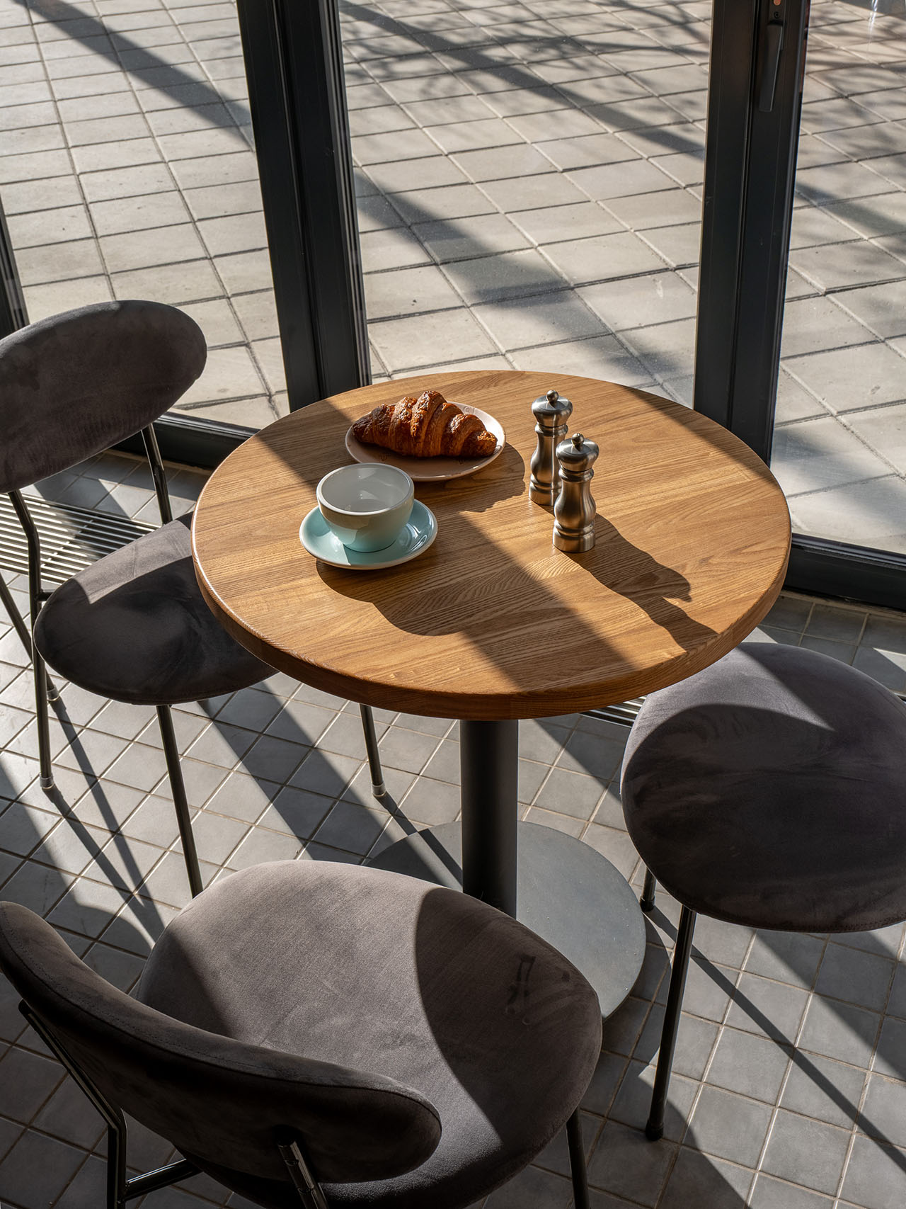 Небольшое помещение со сложной архитектурой — наклонные стены и потолок, низкие балки, металлические конструкции, а также окно в соседнее помещение, — изначально казалось малопригодным для уютной кофейни. Однако задача состояла в том, чтобы максимально эффективно использовать каждый сантиметр пространства и сохранить ощущение уюта. Особенность объекта — высота до балок менее 2,5 м, что исключало традиционные подвесные потолки. Вместо этого архитектурные элементы стали частью дизайна.