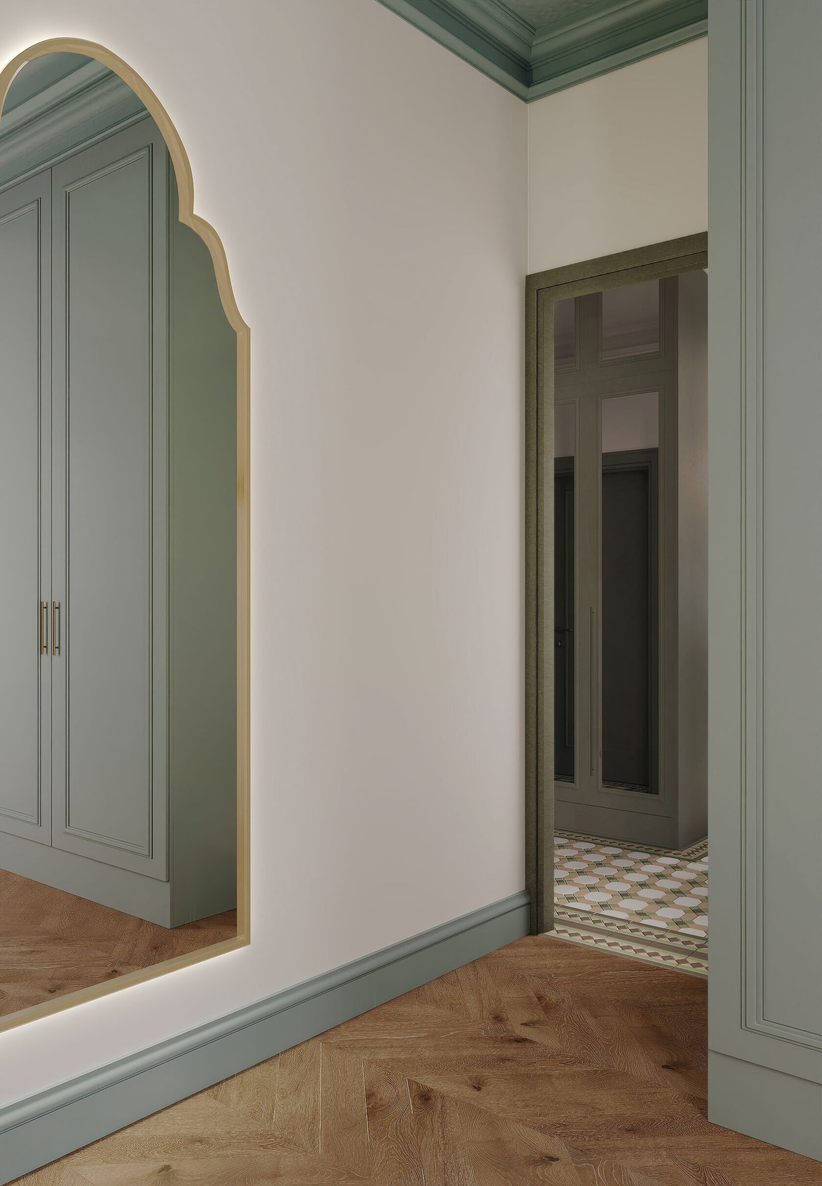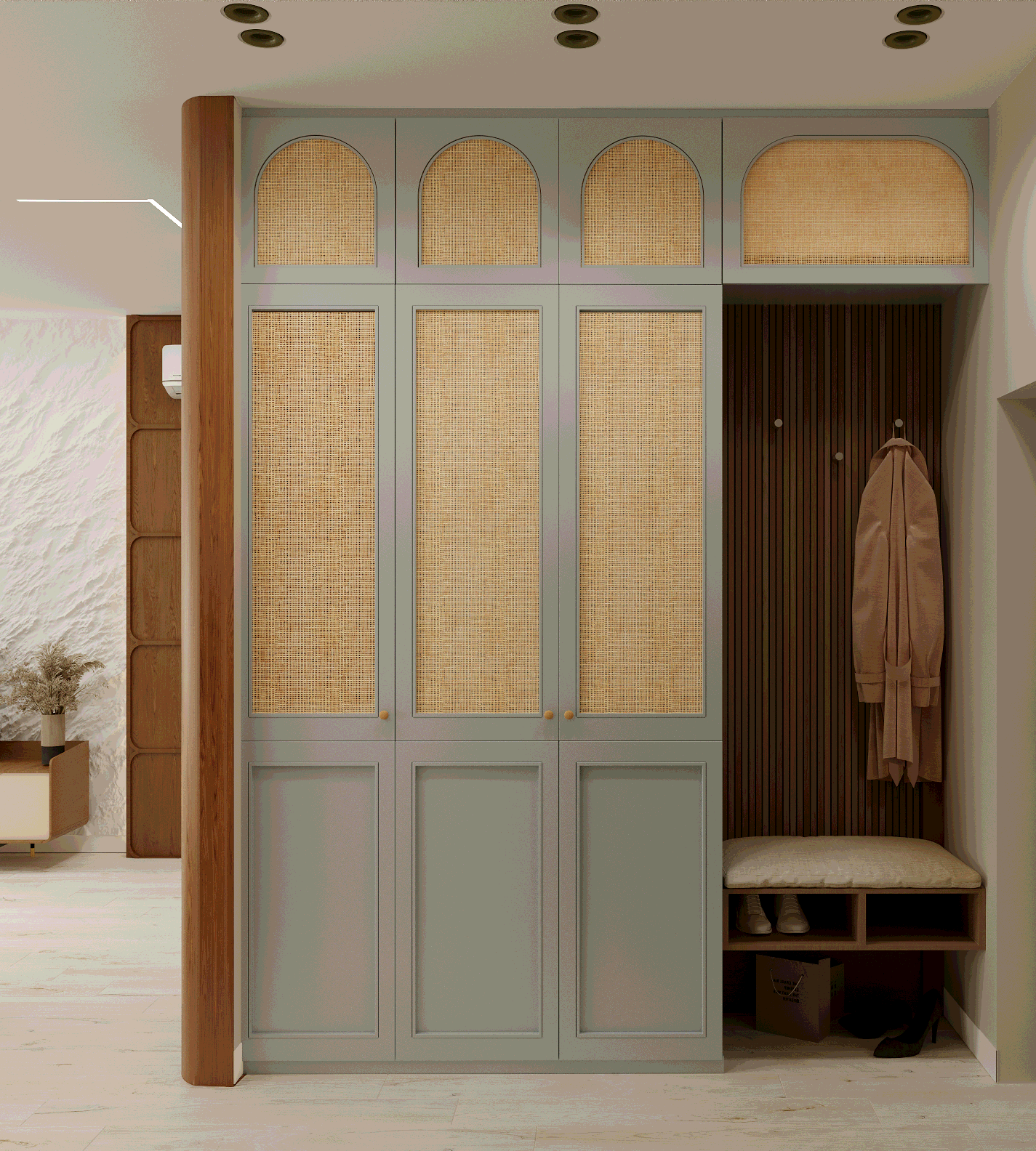 Концепция: В основе проекта лежит идея современной классики, лёгкой, изысканной и комфортной. Достигнуто это благодаря использованию фасадов из дерева с эмалью и потолка, выкрашенных в единый цвет для визуального объединения и целостности. Паркетная доска на полу добавляет тепла, а зеркальные фасады и продуманная подсветка обеспечивают лёгкость и функциональность. Встроенные стеллажи со стеклом позволяют эстетично выставить аксессуары, формируя гармонию между практичностью и дизайном.