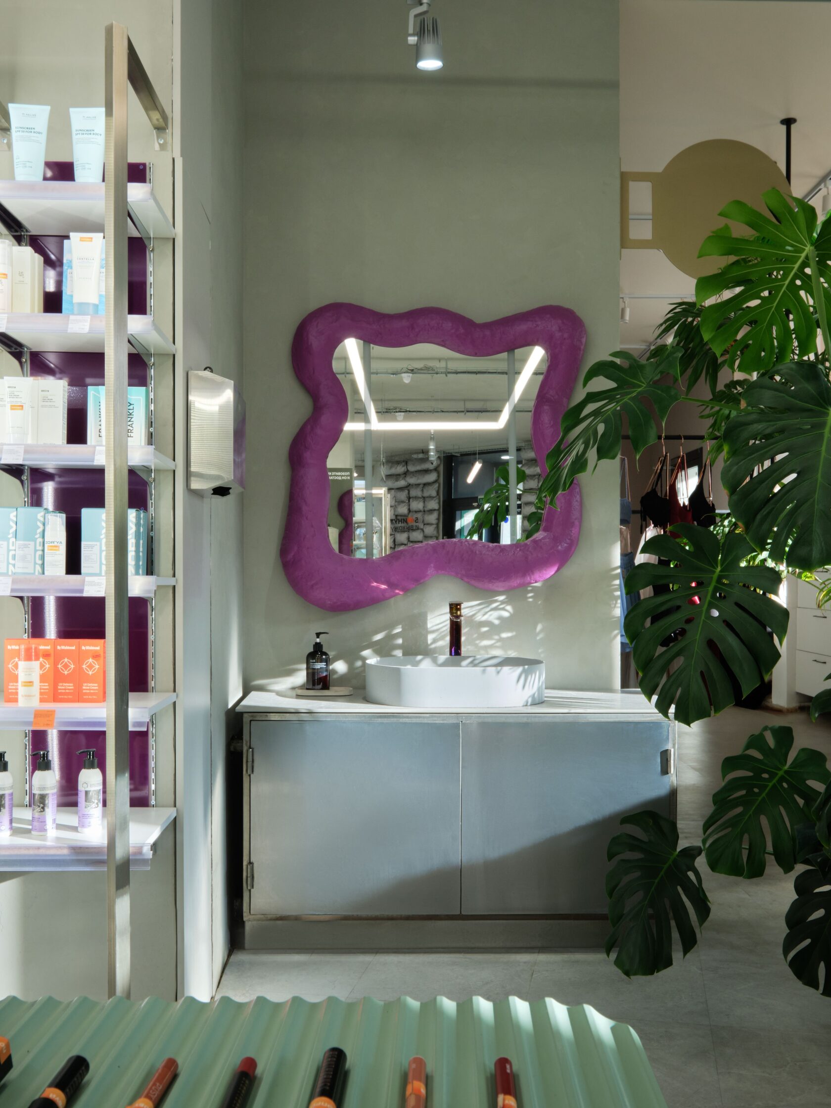 Концепция: Концепция проекта строится на идее создания «капсулы красоты», где каждый продукт представлен максимально выразительно и удобно. Дизайн предусматривает специализированные решения для демонстрации и хранения: металлические стеллажи с подсветкой для акцентного выделения товаров, а также напольные тумбы с рельефными фасадами для мелкой продукции и запасов. Включены функциональные зоны: касса с продуманным хранением, стенд для масок и интерактивная зона для тестирования с раковиной, обеспечивающая полный цикл взаимодействия покупателя с продуктом.