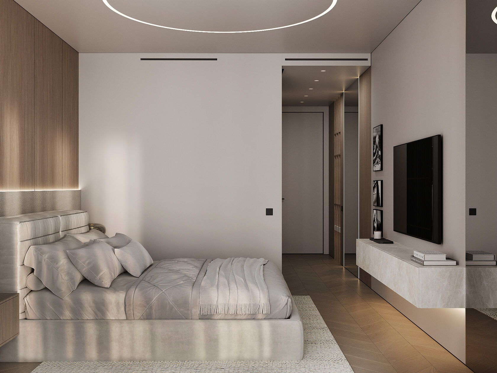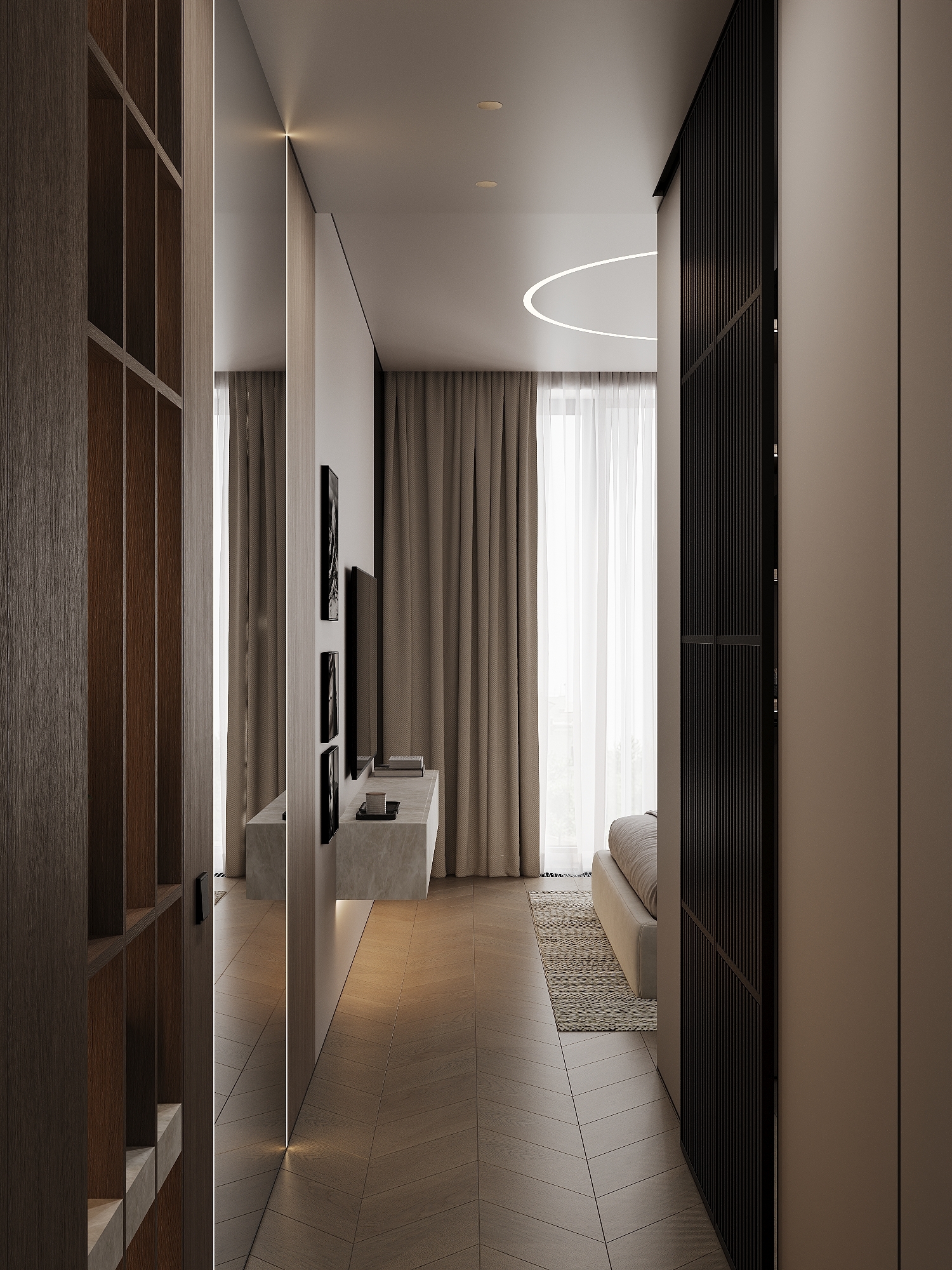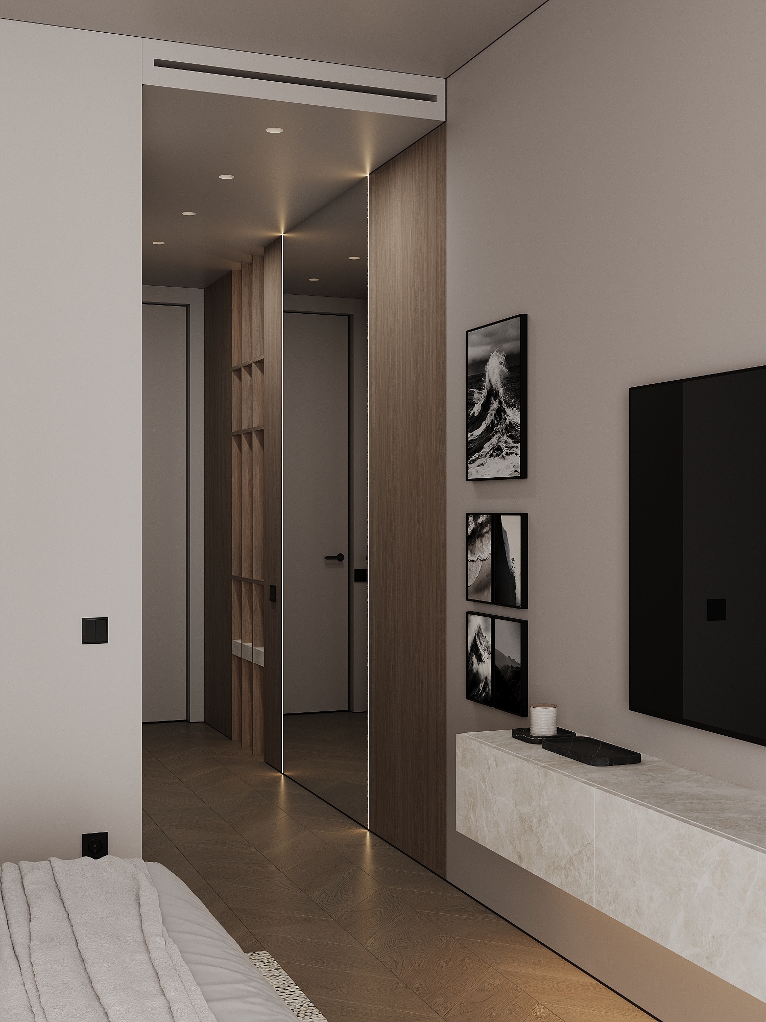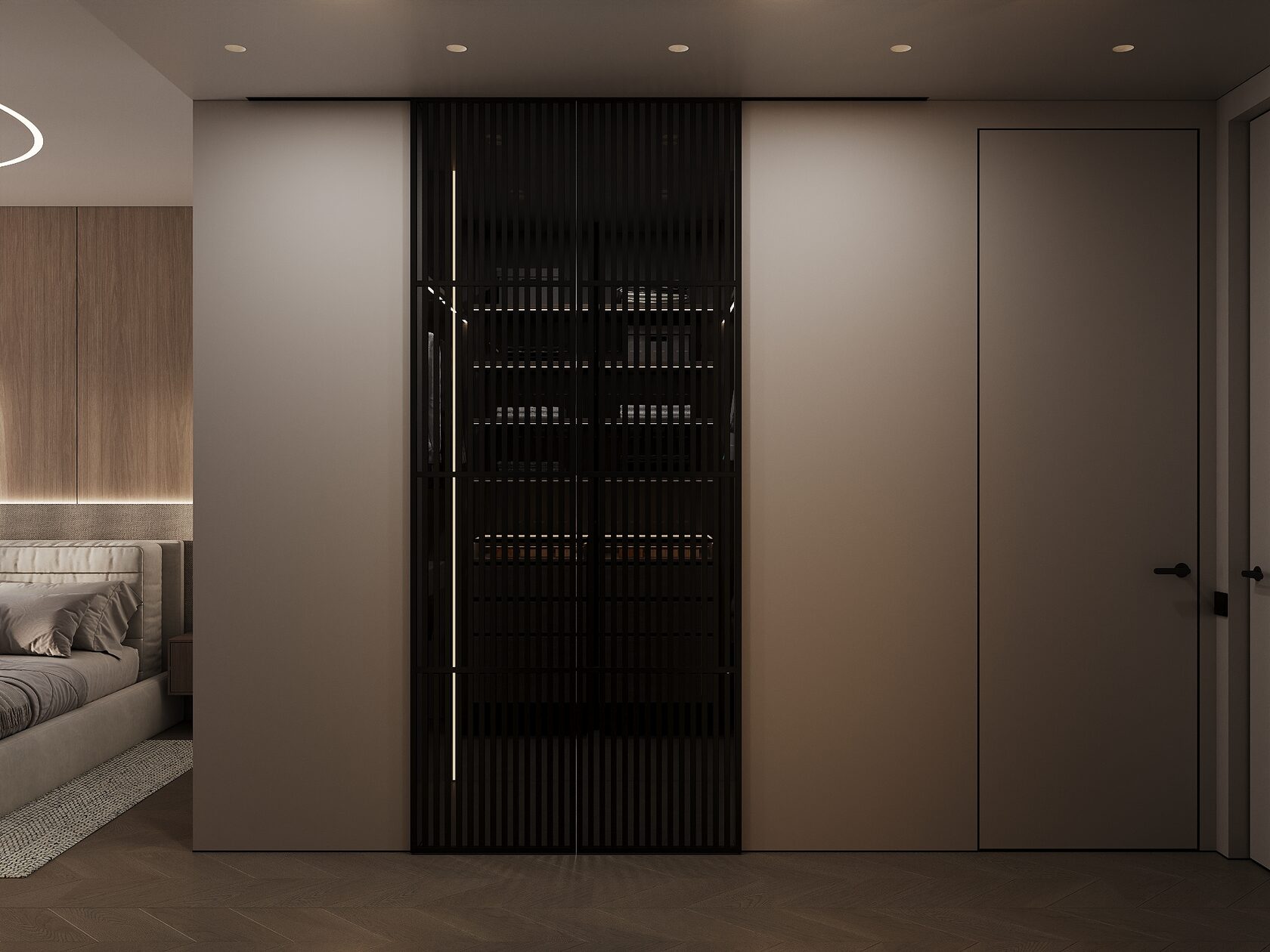 Итог: Результатом стало элегантное и высокофункциональное решение, которое эффективно решает проблему зонирования в компактной спальной зоне. Оно обеспечивает необходимую приватность, сохраняет целостность интерьера, минимизирует количество дверей и предлагает беспрецедентную гибкость в использовании пространства, воплощая принципы современного и продуманного дизайна.