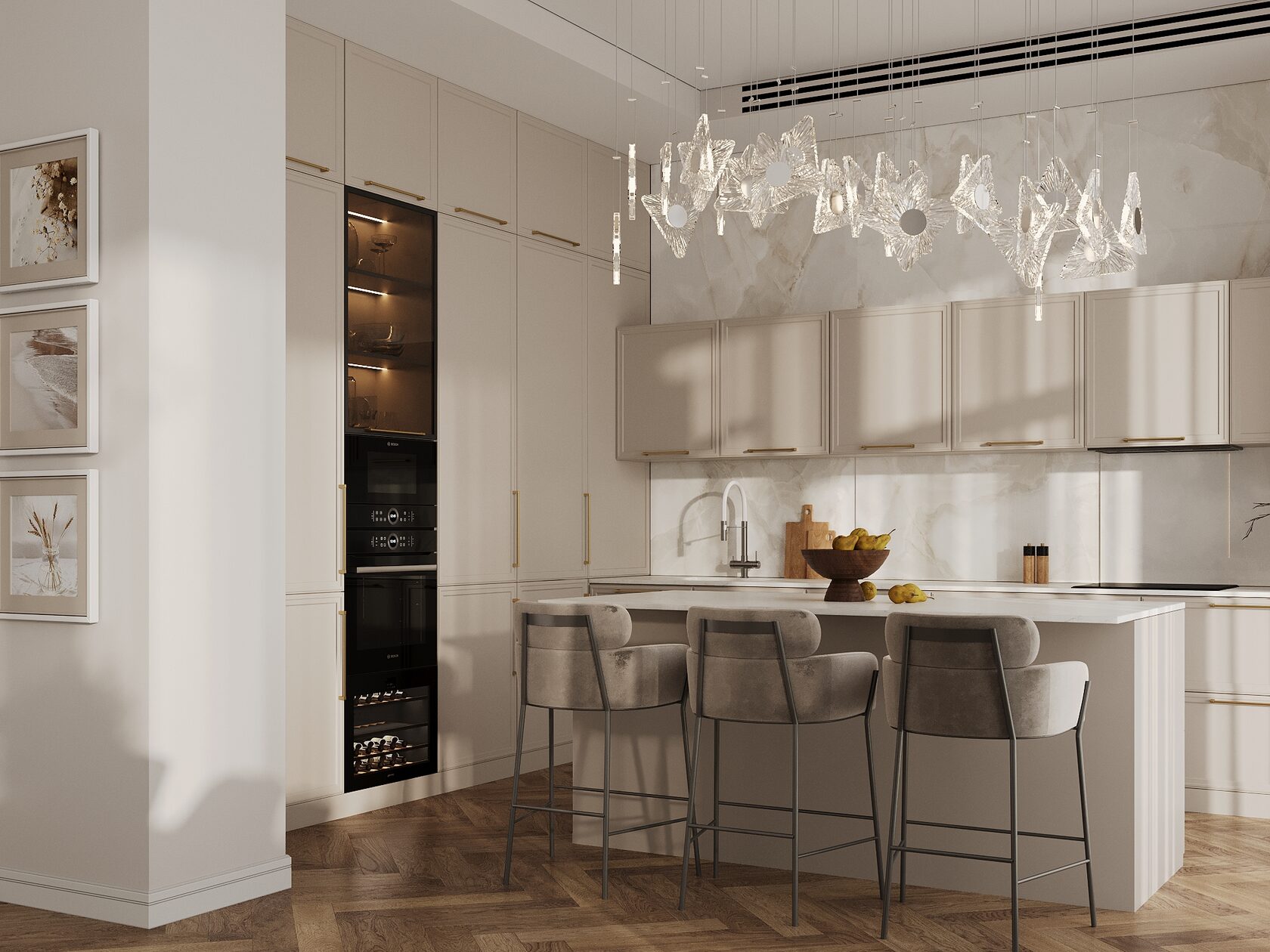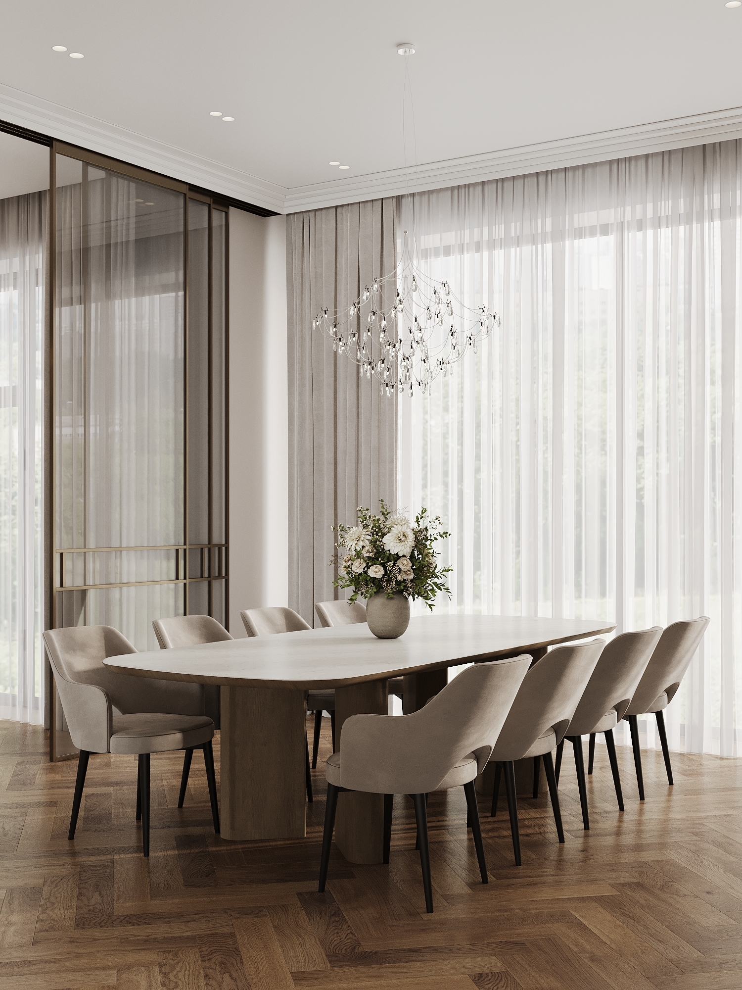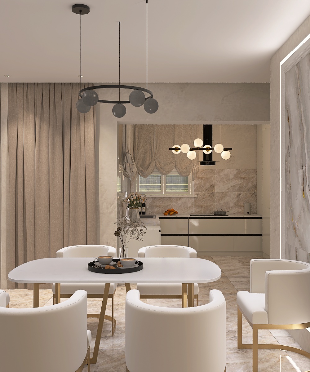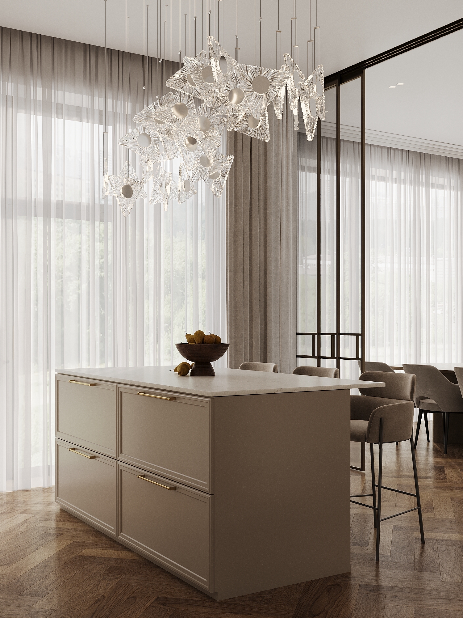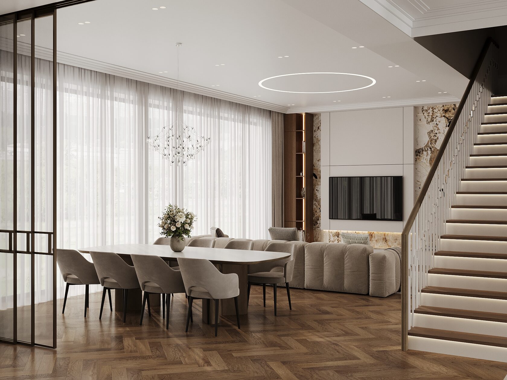 Этот проект — цельный, гармоничный интерьер гостиной-столовой с интегрированной кухней, где основная идея строится вокруг изысканной атмосферы, вдохновлённой природой и классикой, но поданной в современном ключе.