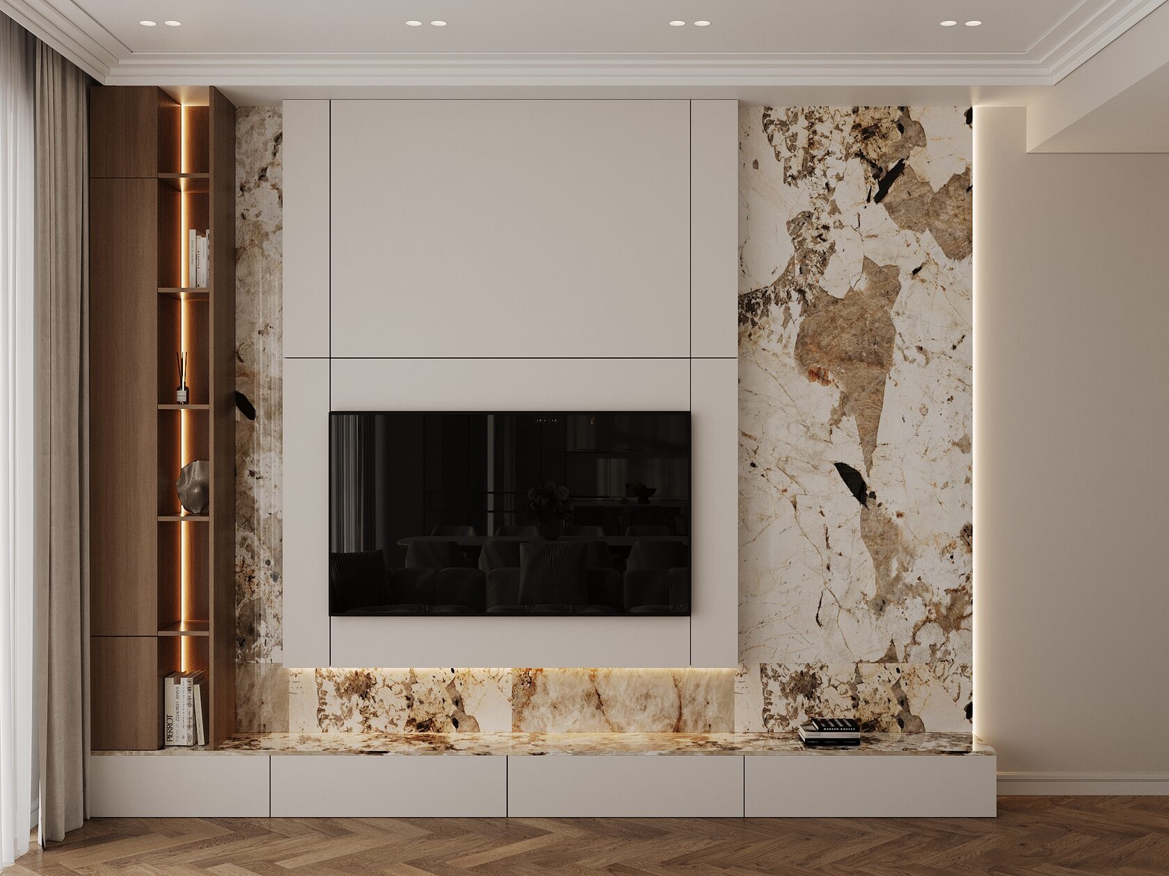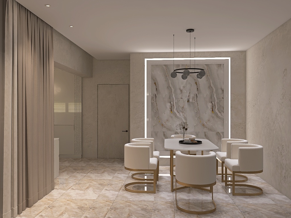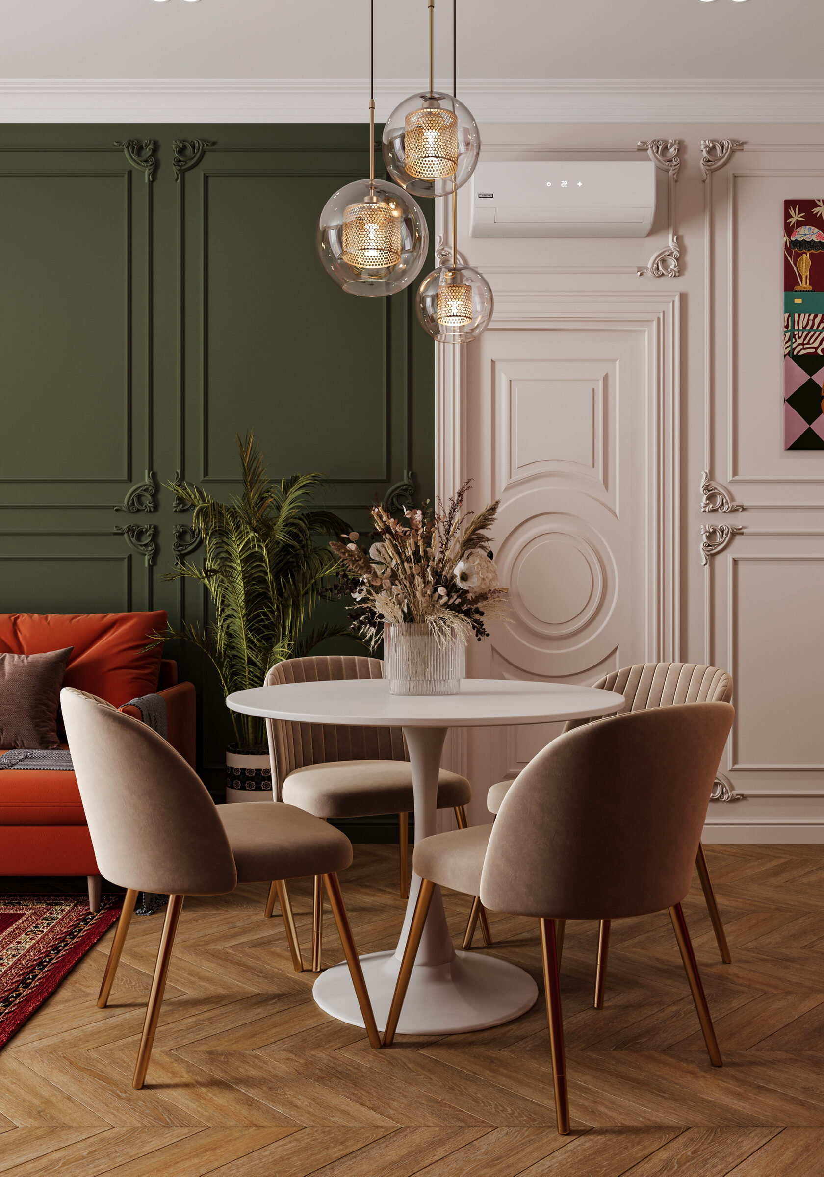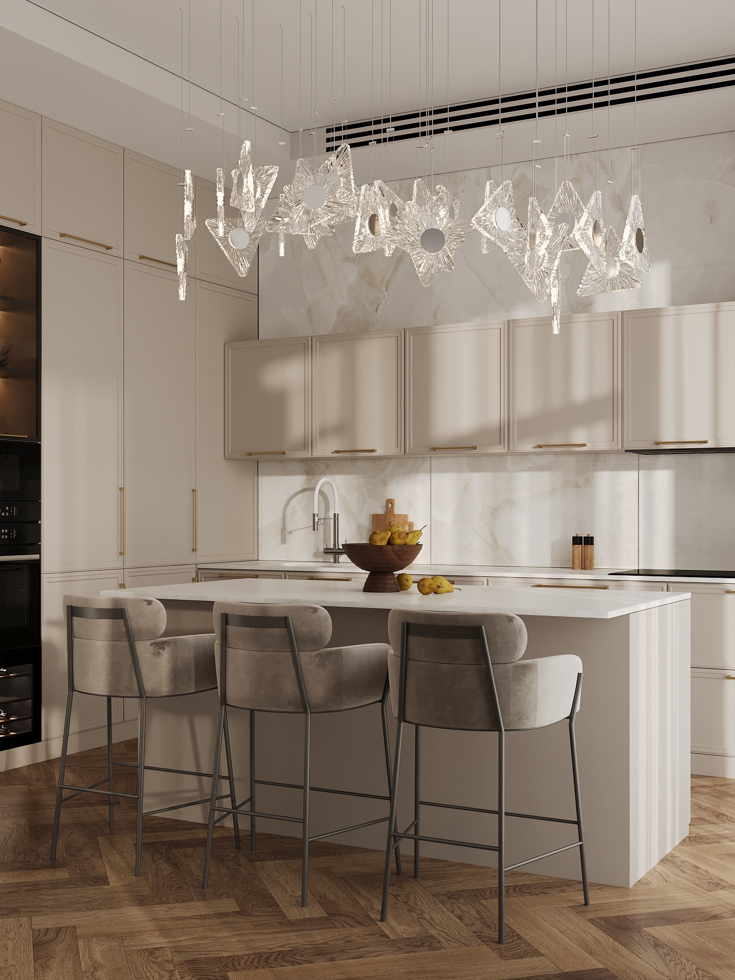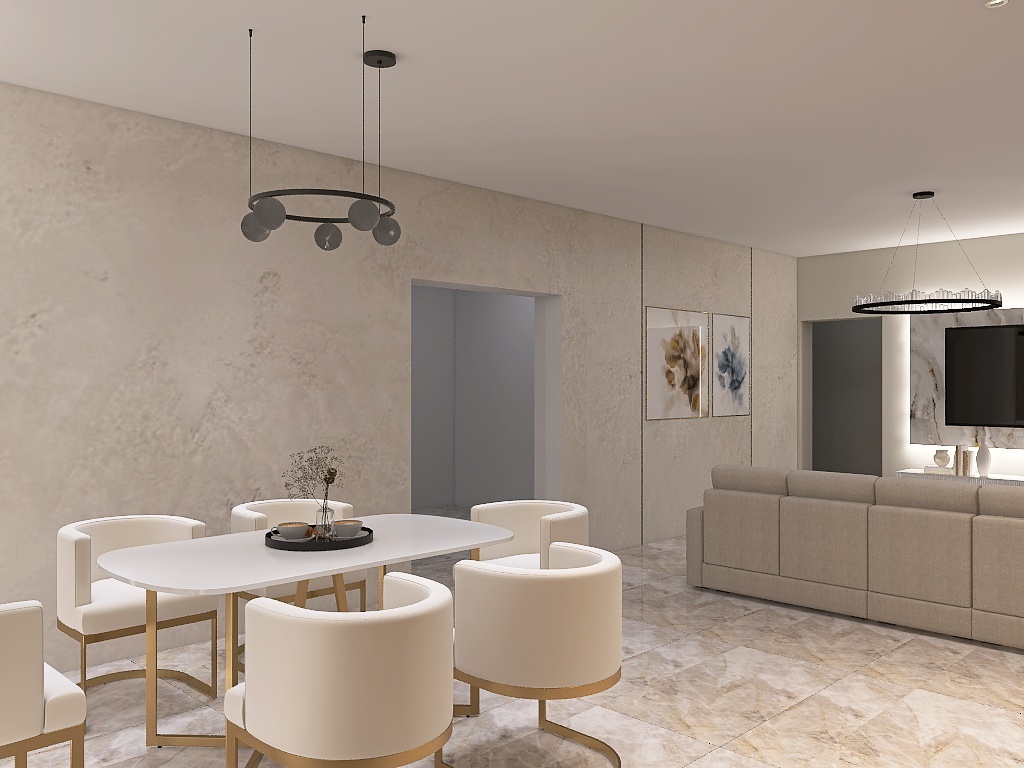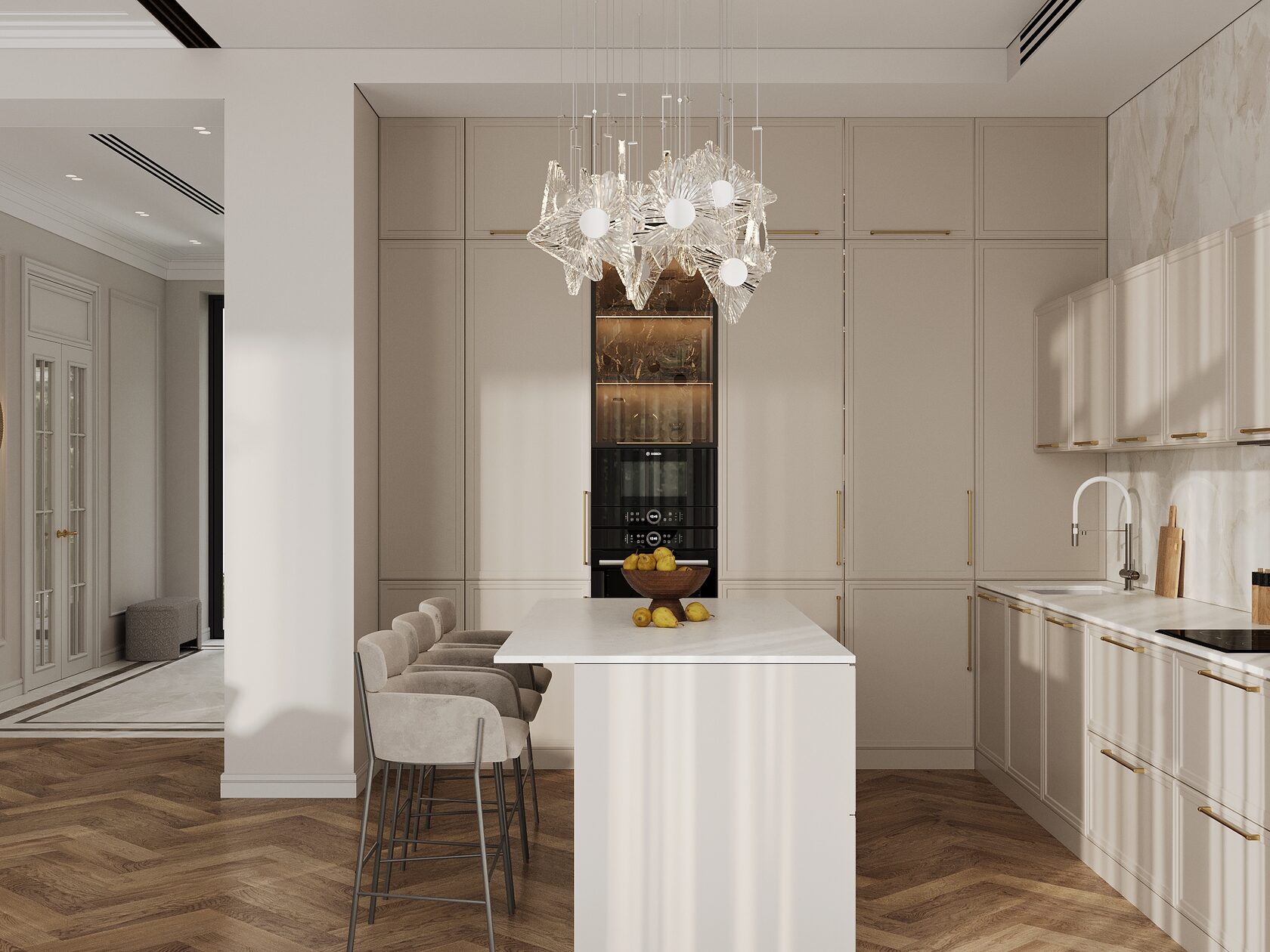 Этот проект — цельный, гармоничный интерьер гостиной-столовой с интегрированной кухней, где основная идея строится вокруг изысканной атмосферы, вдохновлённой природой и классикой, но поданной в современном ключе.