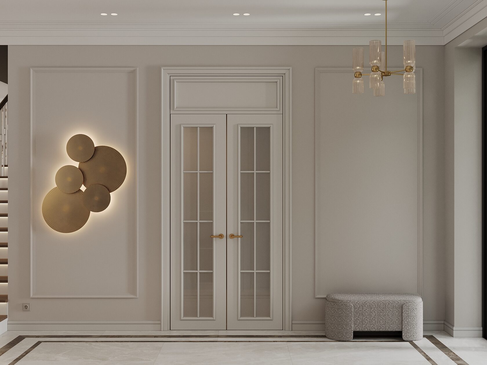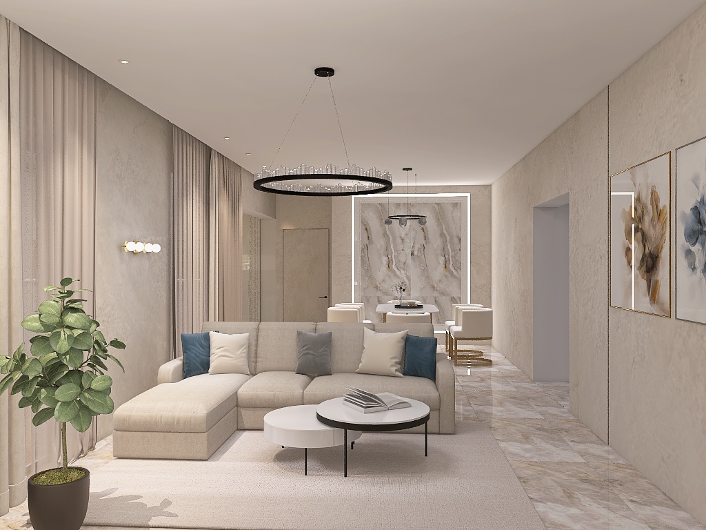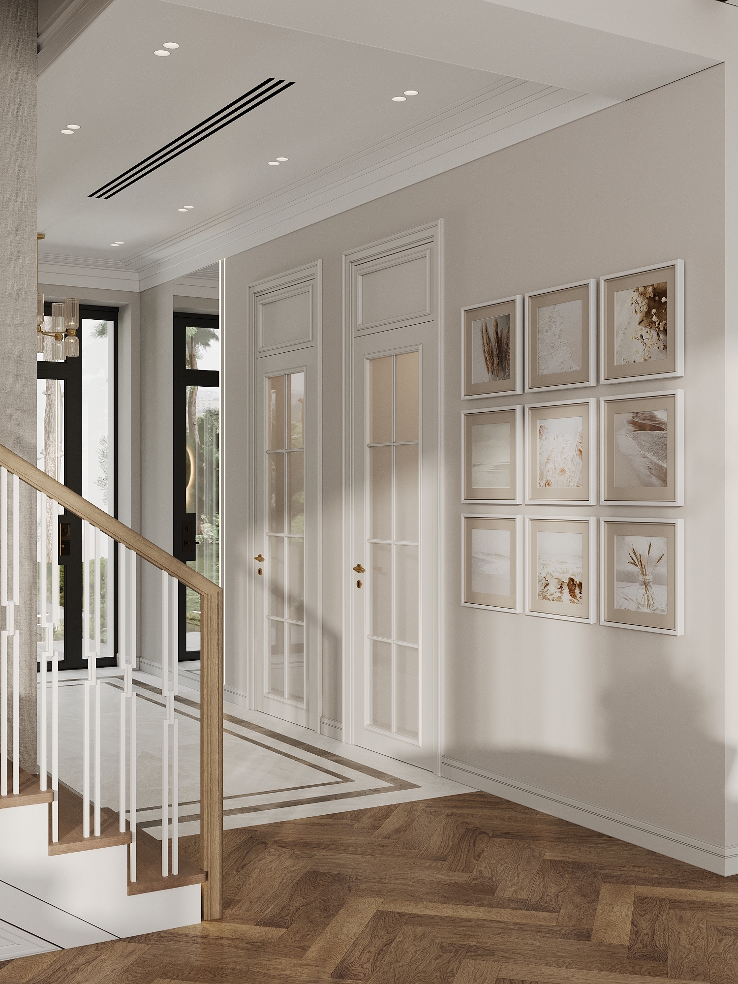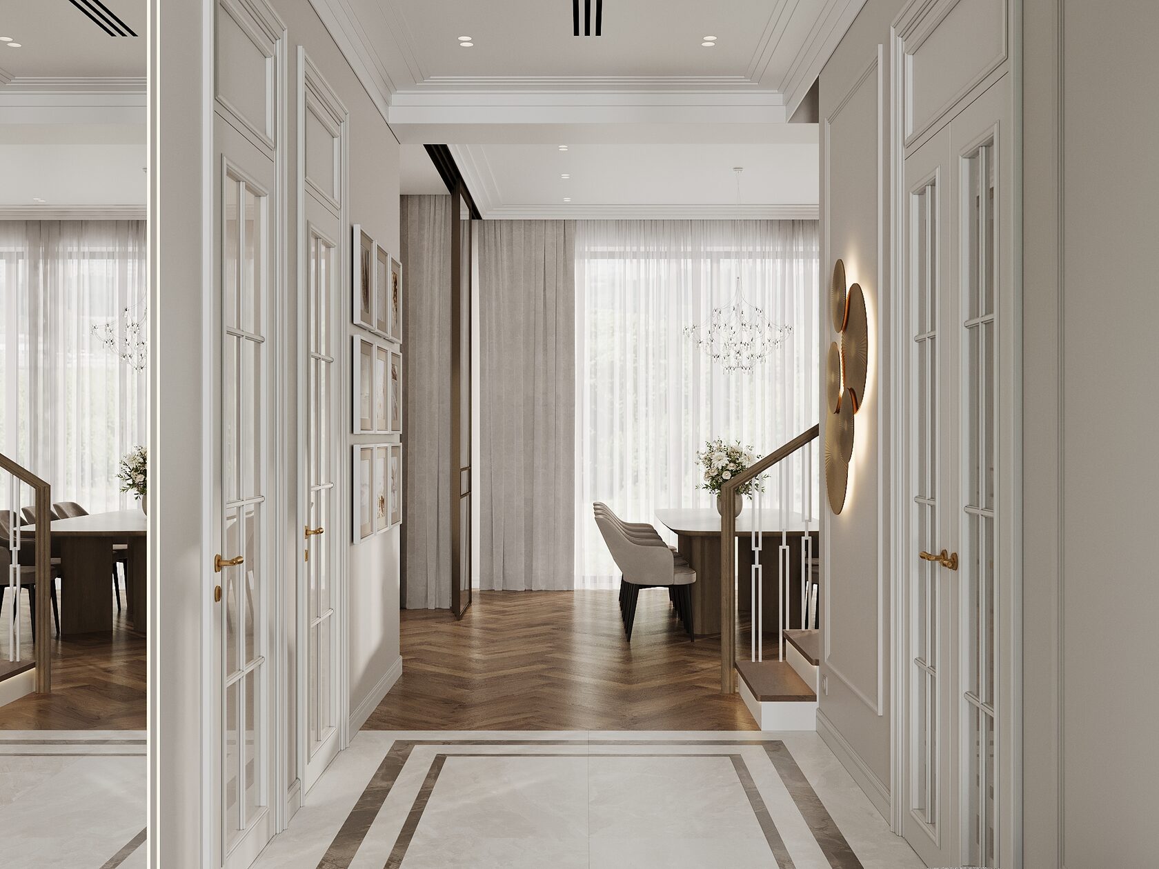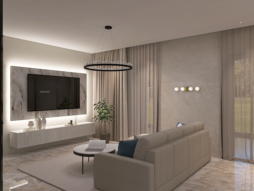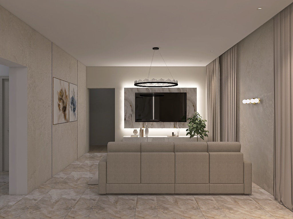 Концепция: Основная идея — воплощение современного стиля через палитру бежевых и нежных тонов, формирующих атмосферу уюта и спокойствия. Дизайн учитывает потребности всех членов семьи, создавая при этом единое, гармоничное пространство, отражающее современный образ жизни его обитателей.