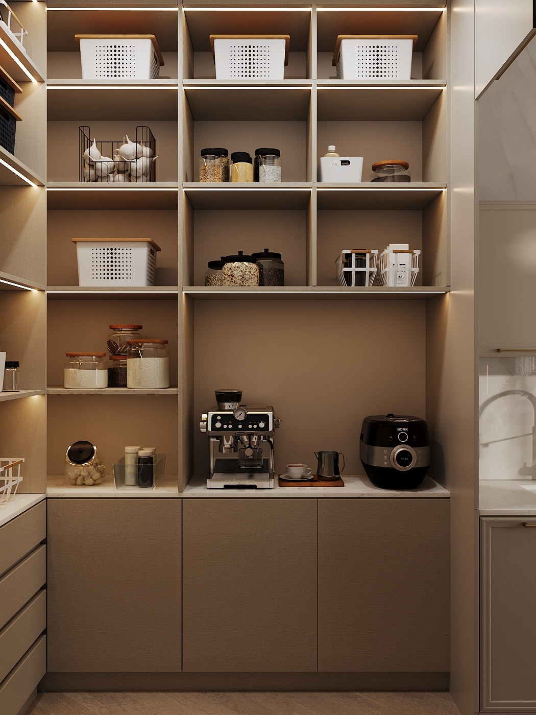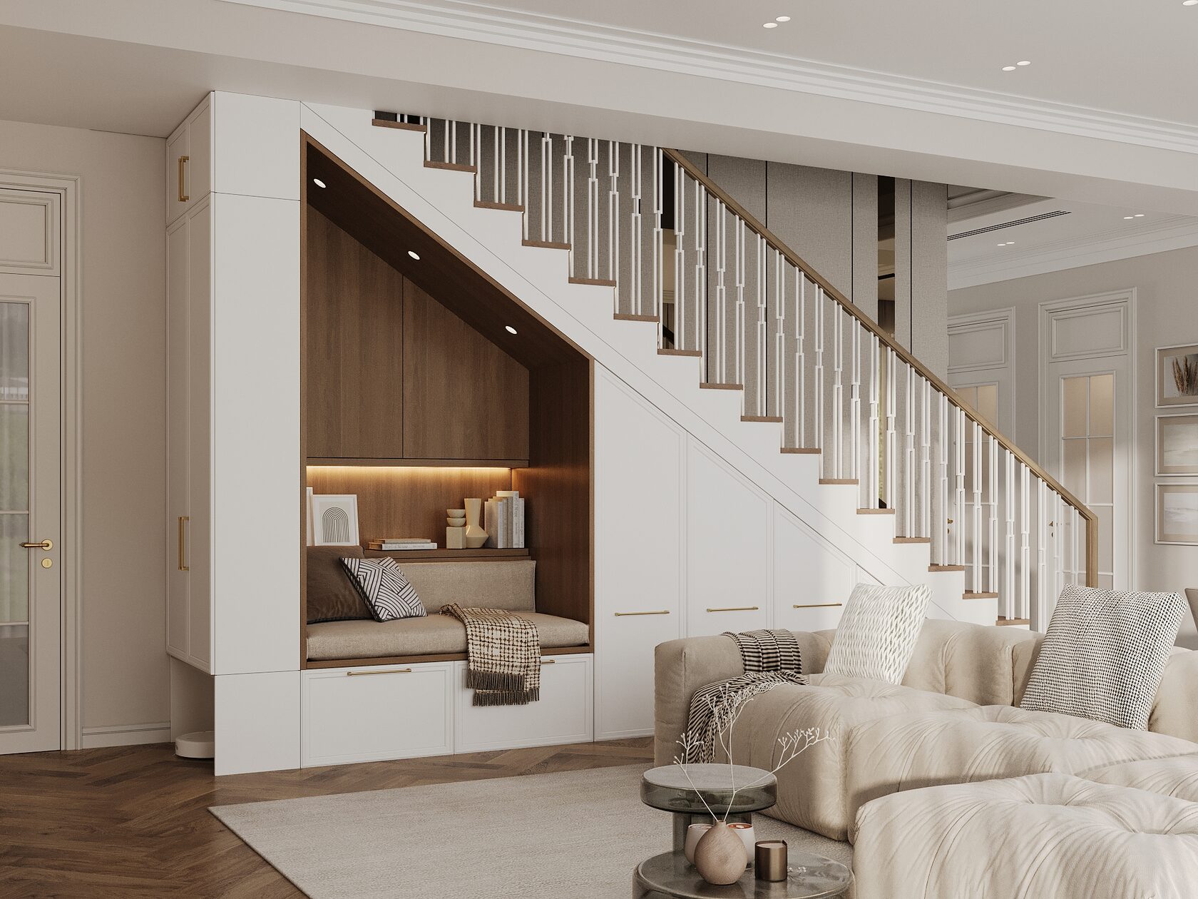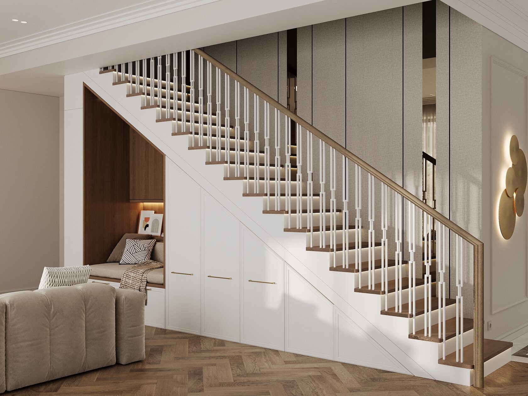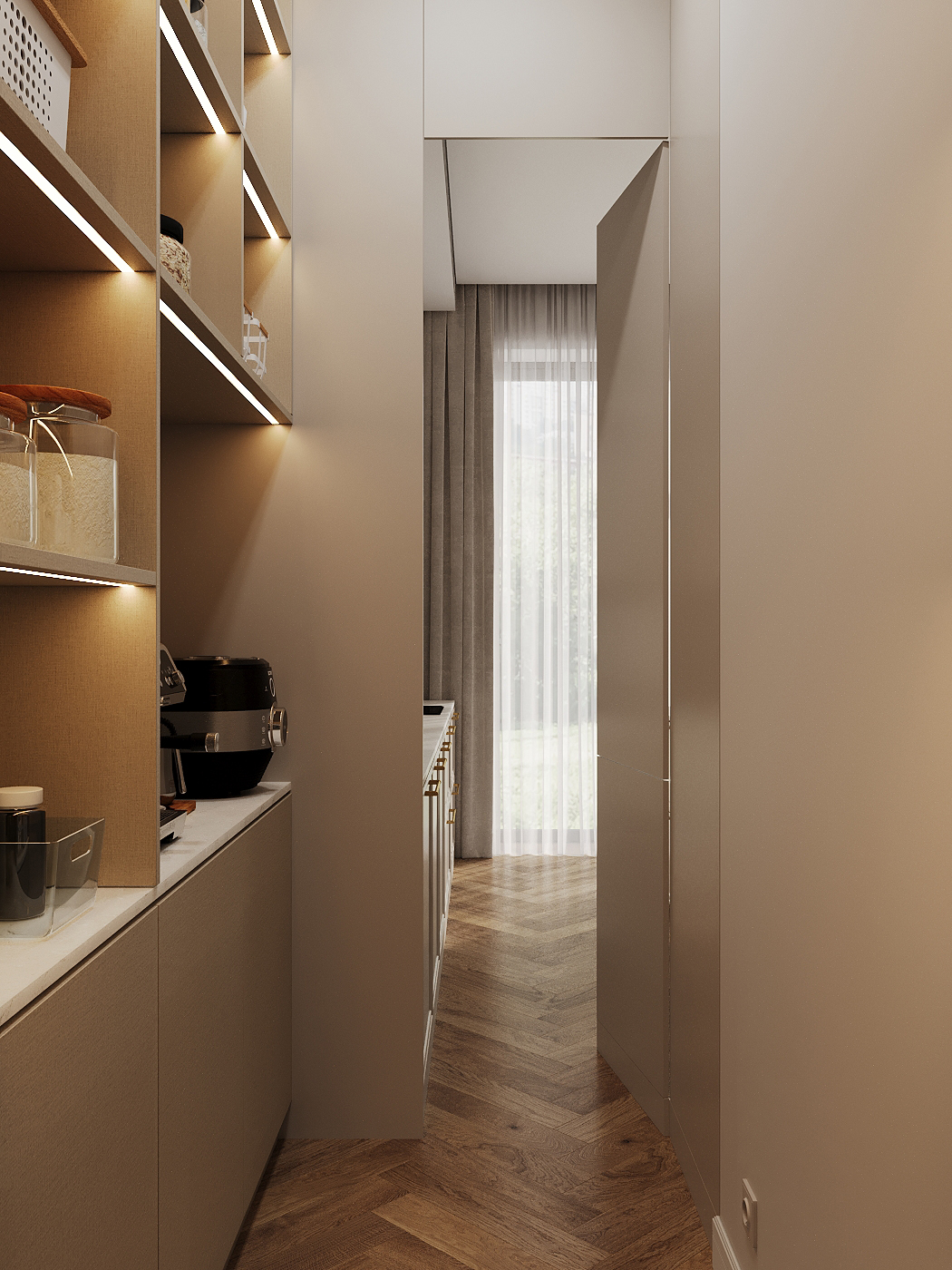Концепция: В основе проекта лежит идея создания сердца дома — просторной кухни-гостиной, предназначенной для душевных встреч и теплых воспоминаний. Зонирование между кухней и гостиной выполнено с помощью изящных перегородок, сохраняющих ощущение простора. Особенное внимание уделено деталям: от использования стильных и практичных фасадов из керамогранита на кухне до уникальной потайной кладовой за кухонным гарнитуром. Акцентная стена в гостиной и лестница с индивидуальной подсветкой каждой ступеньки добавляют интерьеру выразительности и эксклюзивности.