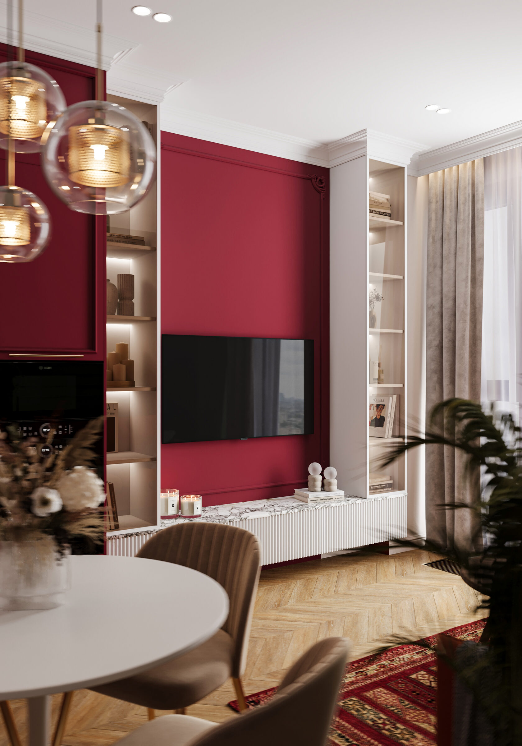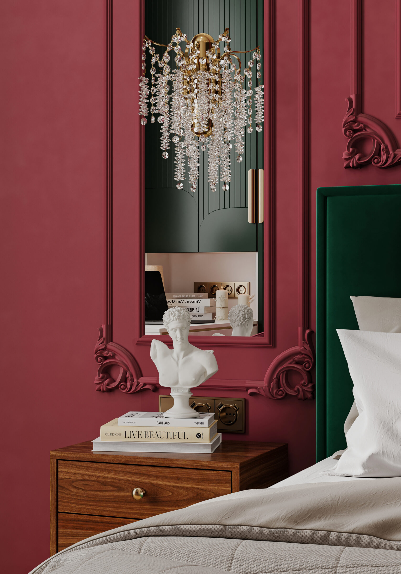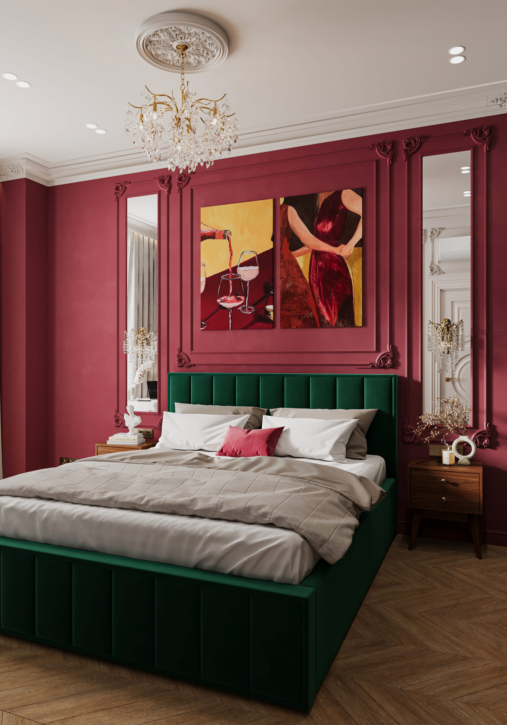 Ее пожелание было четким: интерьер должен быть ярким, подчеркивающим ее индивидуальность, с атмосферой загадочности, роскоши и аристократичности. В качестве отправной точки мы выбрали палитру, основанную на глубоких, насыщенных оттенках: изумрудный и бордовый (цвет бургунди). Изумрудный – цвет жизни, роста и благородства, а бургунди – цвет страсти, уверенности и утонченности. Вместе они создают невероятно эффектный дуэт.