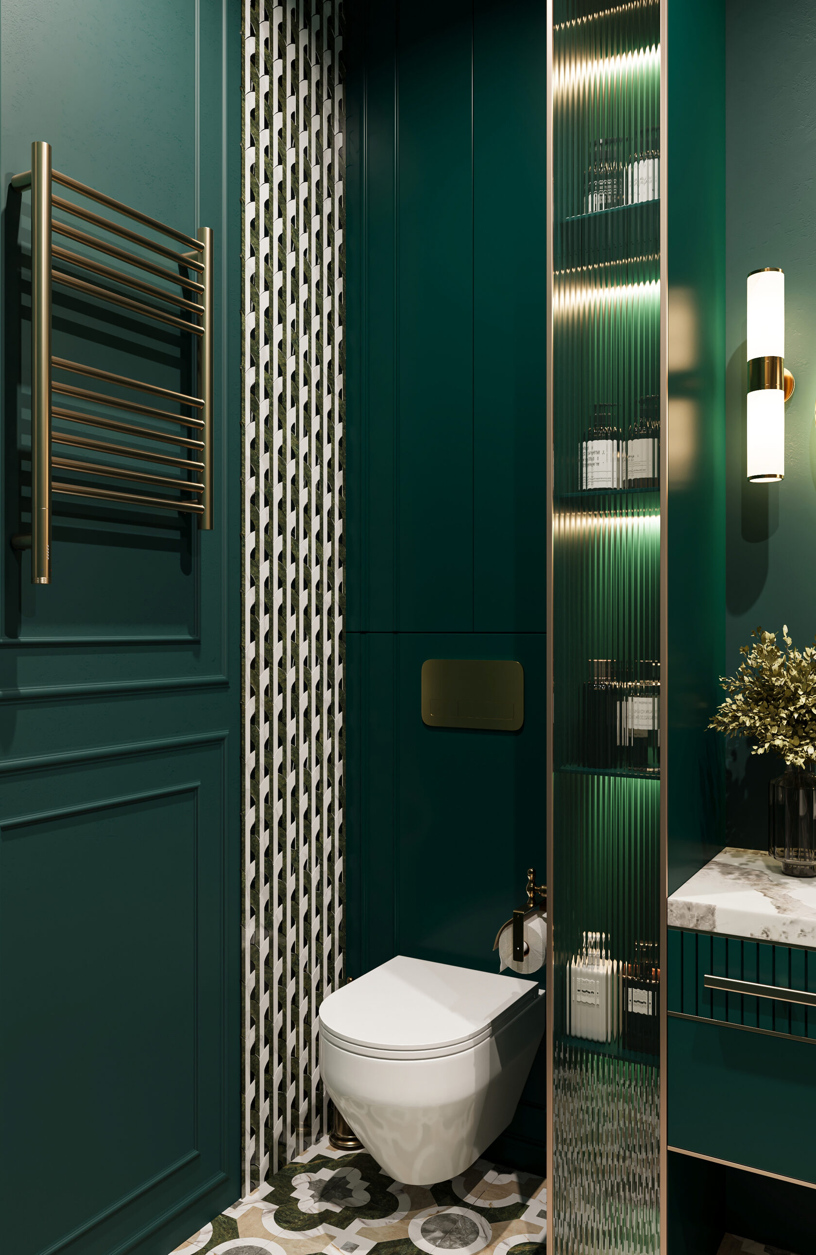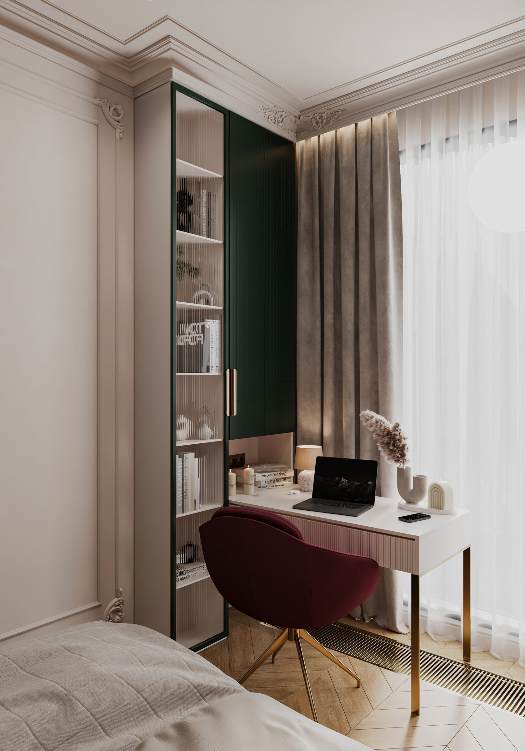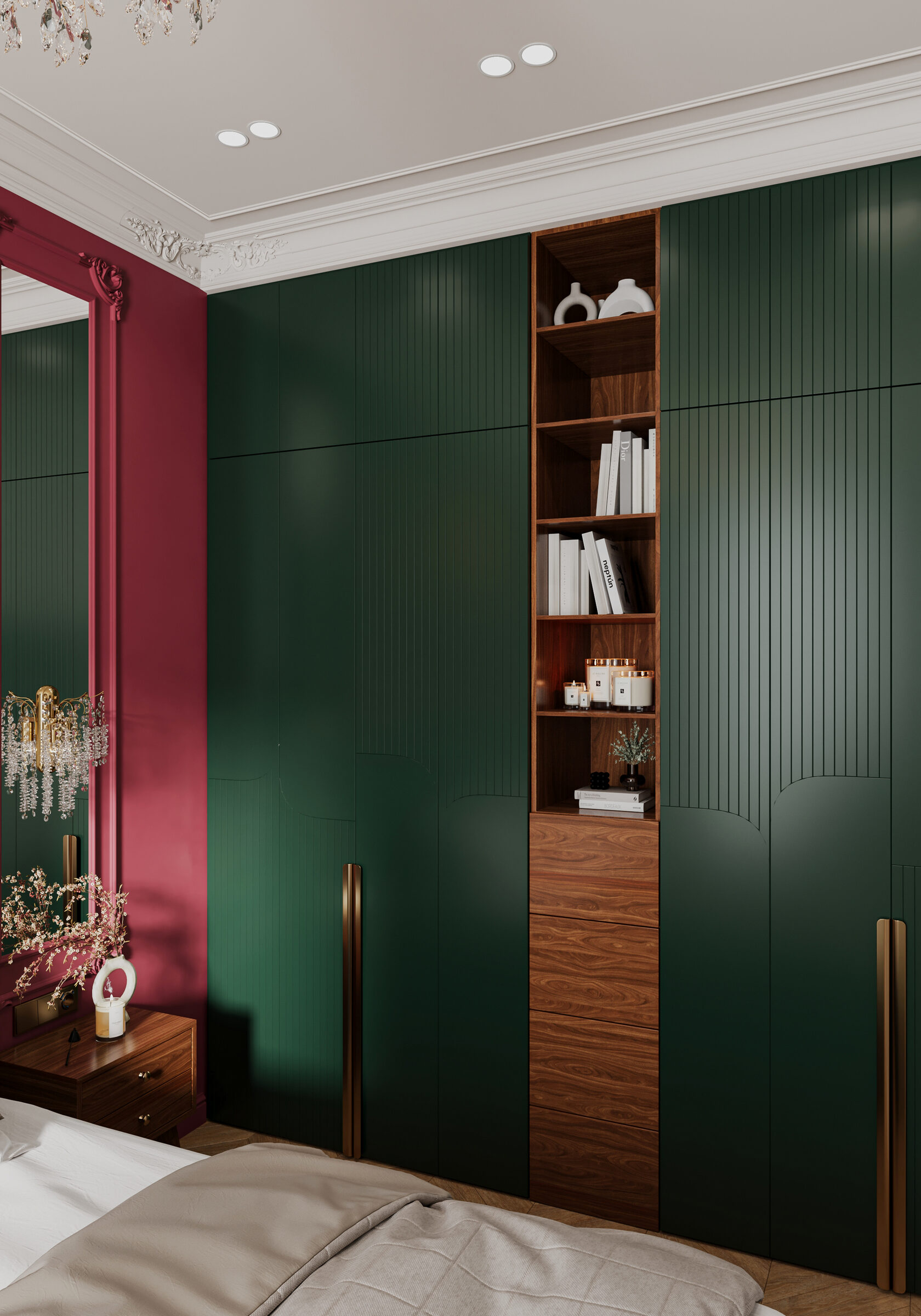 Ее пожелание было четким: интерьер должен быть ярким, подчеркивающим ее индивидуальность, с атмосферой загадочности, роскоши и аристократичности. В качестве отправной точки мы выбрали палитру, основанную на глубоких, насыщенных оттенках: изумрудный и бордовый (цвет бургунди). Изумрудный – цвет жизни, роста и благородства, а бургунди – цвет страсти, уверенности и утонченности. Вместе они создают невероятно эффектный дуэт.