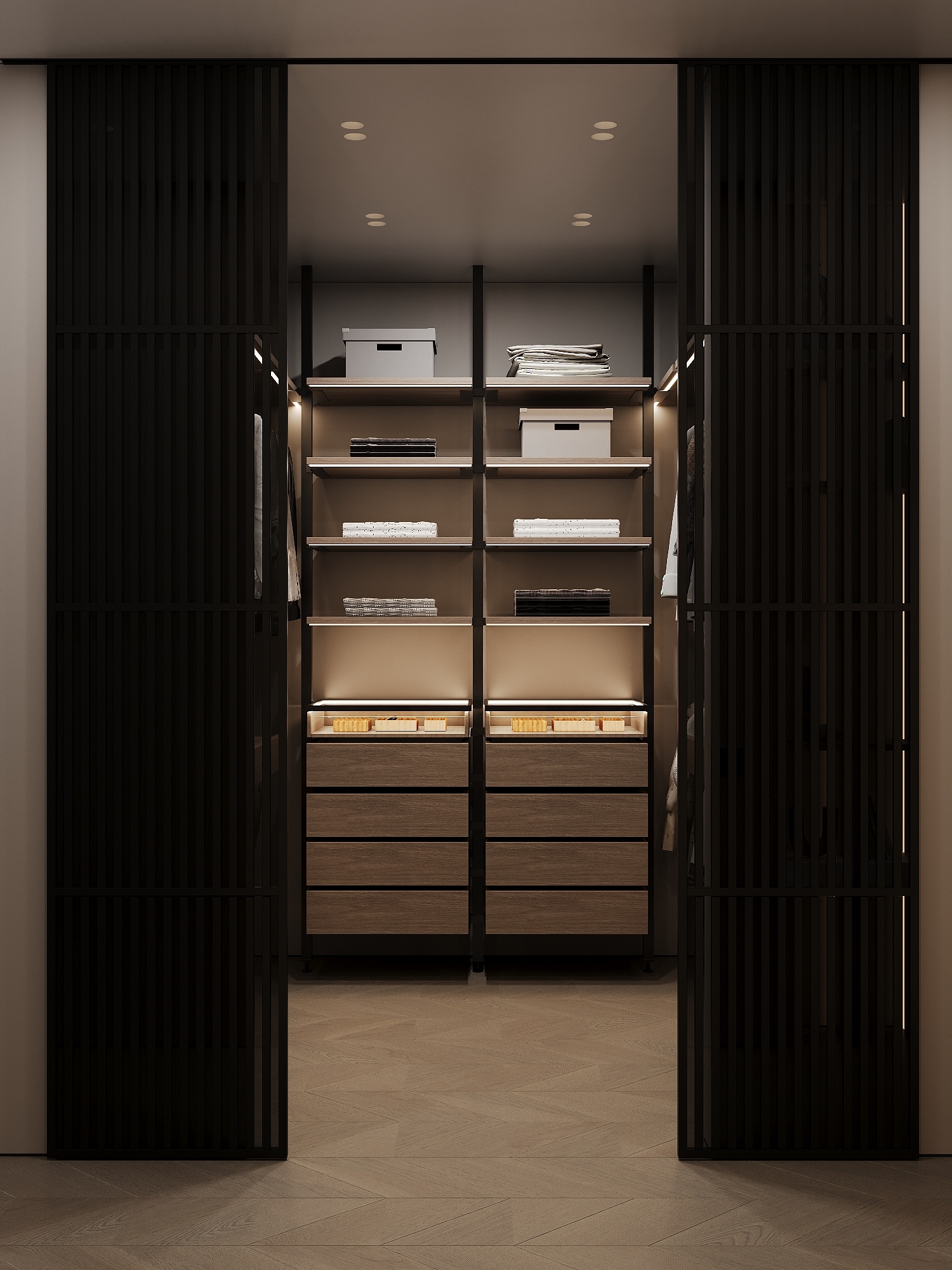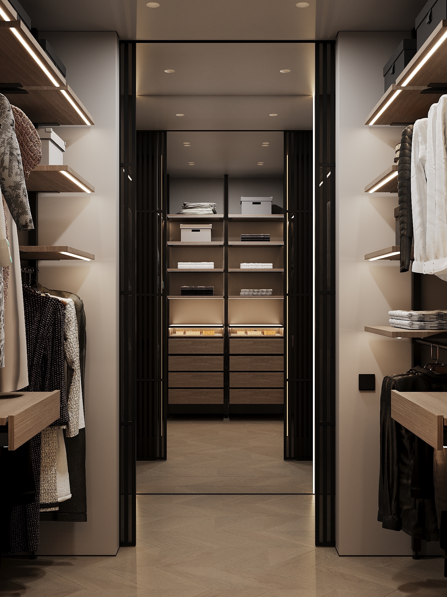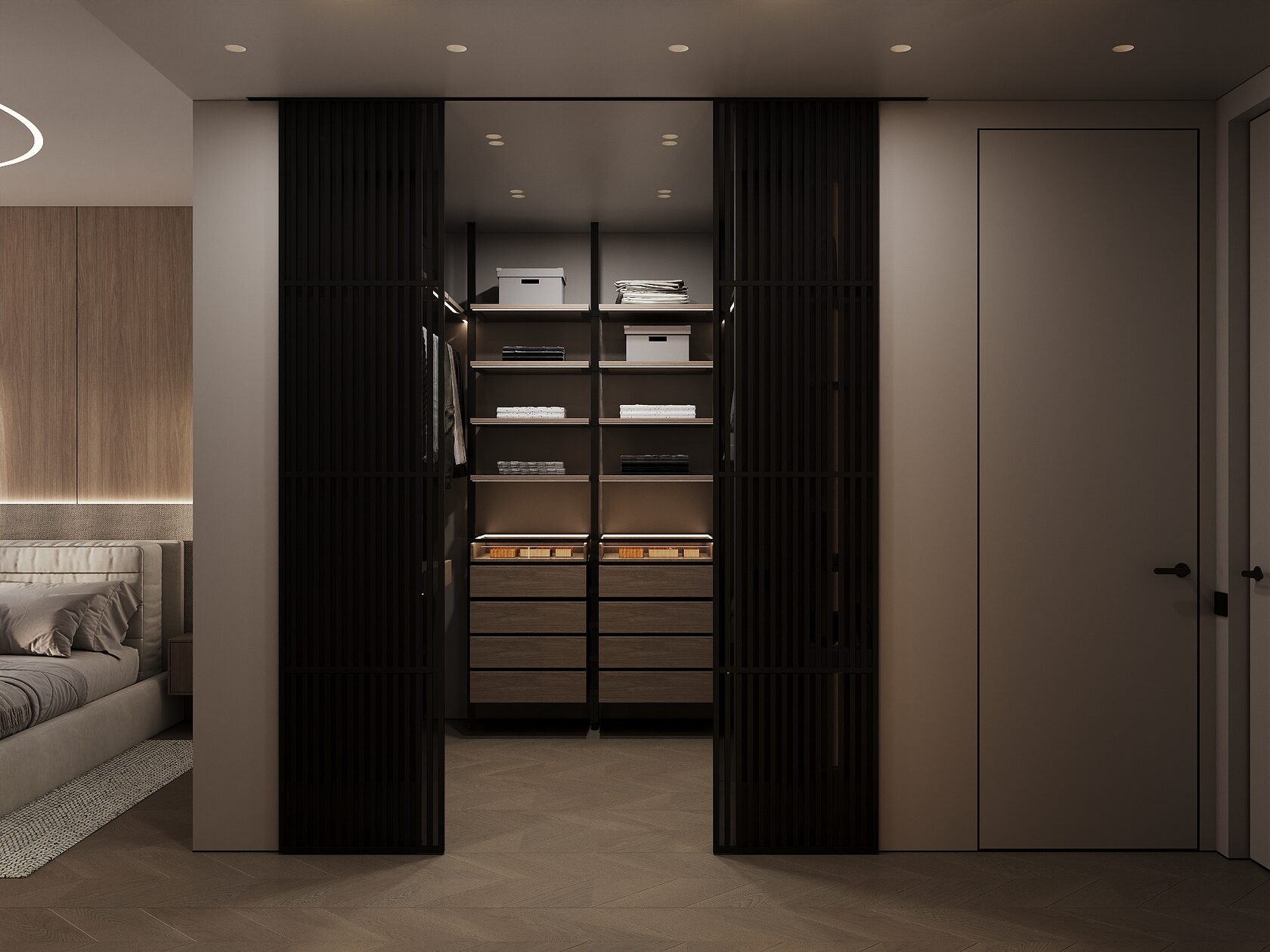 Концепция: В основе концепции лежит идея создания динамичного и адаптируемого пространства. Раздвижные перегородки выступают не просто функциональным элементом, а инструментом трансформации: в закрытом виде они формируют ощущение цельности и порядка, скрывая зоны хранения и даря спальне атмосферу умиротворенного будуара. Легким движением руки гардеробные становятся открытыми и наполненными светом, демонстрируя идеальный порядок.