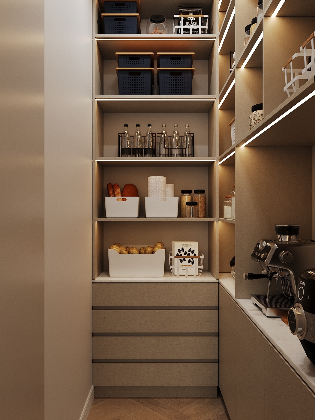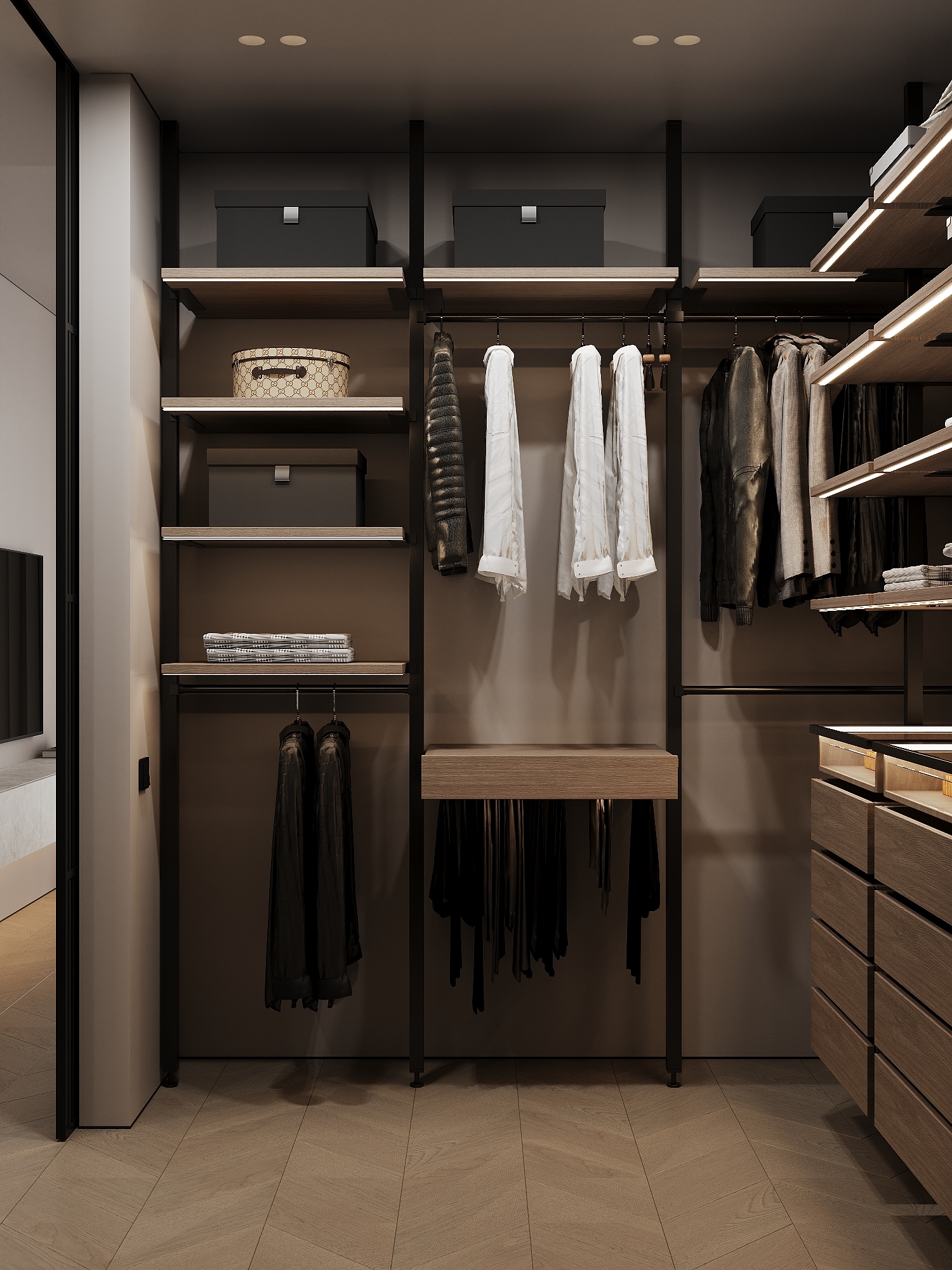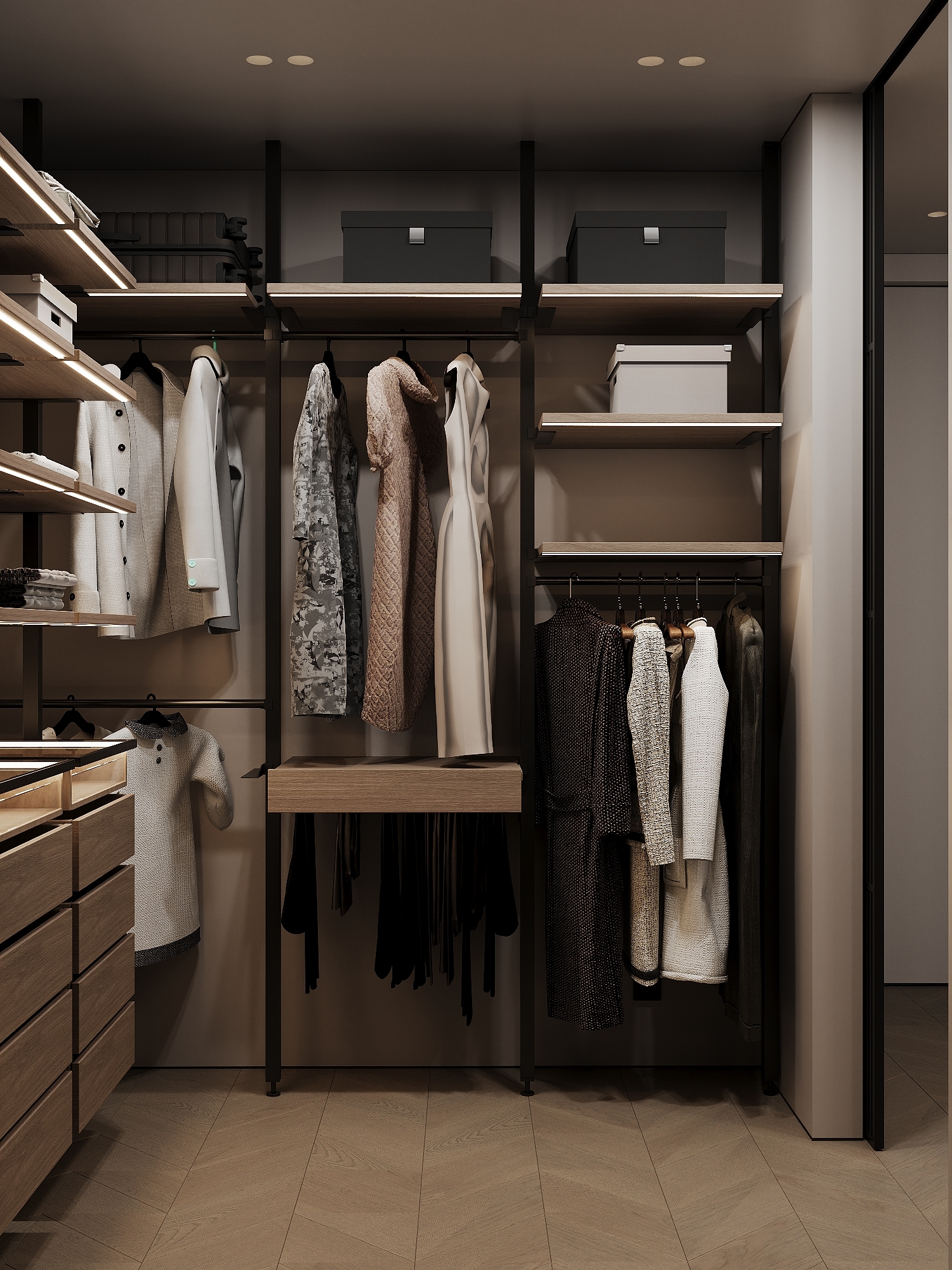Концепция: В основе концепции лежит идея создания динамичного и адаптируемого пространства. Раздвижные перегородки выступают не просто функциональным элементом, а инструментом трансформации: в закрытом виде они формируют ощущение цельности и порядка, скрывая зоны хранения и даря спальне атмосферу умиротворенного будуара. Легким движением руки гардеробные становятся открытыми и наполненными светом, демонстрируя идеальный порядок.