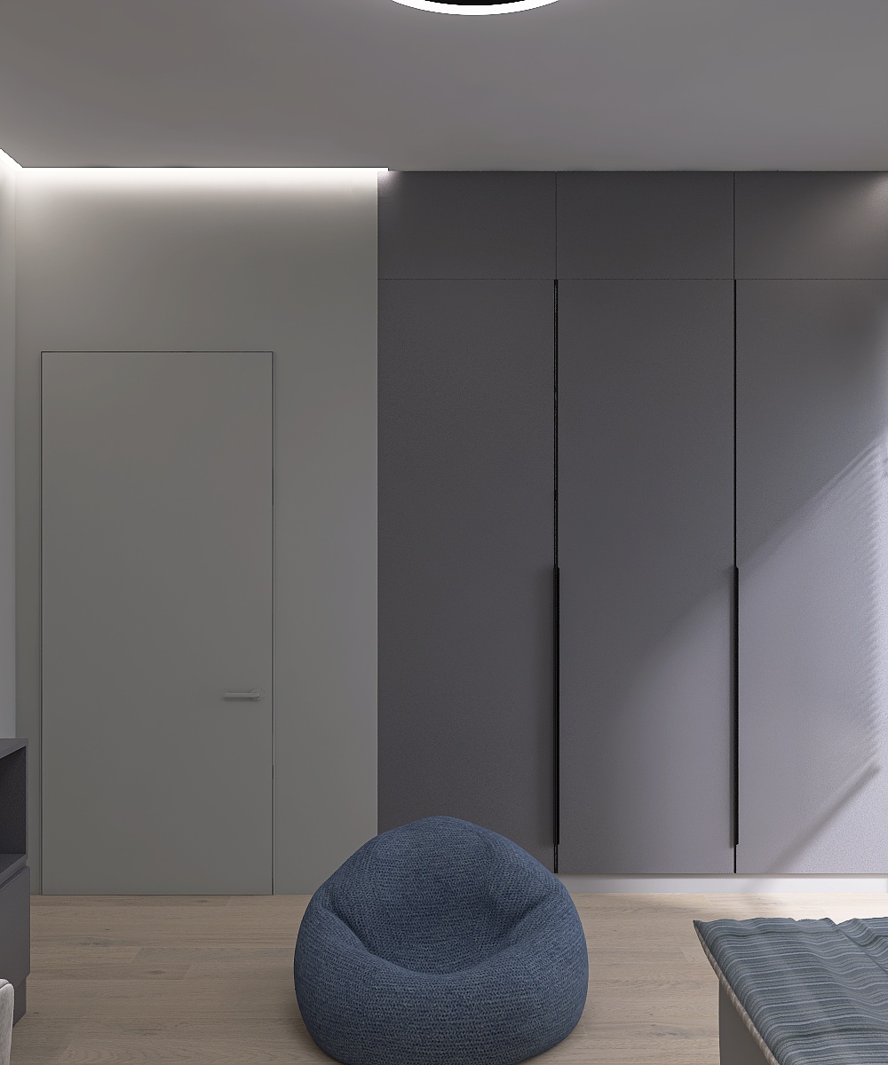 Концепция: Основой концепции является максимальная оптимизация пространства через внедрение гибких и эстетичных решений. Было разработано уникальное сдвижное матовое полотно, которое позволяет функционально зонировать пространство. Это полотно может закрывать либо ванную комнату, либо гардероб, а также располагаться между проемами, обеспечивая одновременный беспрепятственный доступ к обоим помещениям. Такой подход исключает визуальный шум и рационально использует каждый сантиметр.