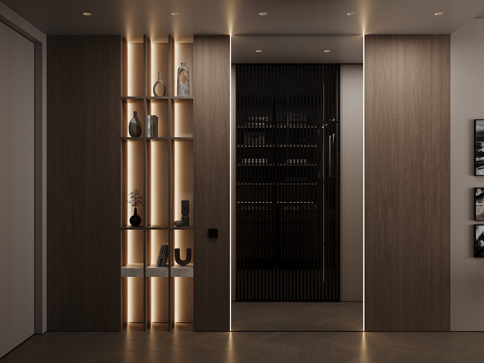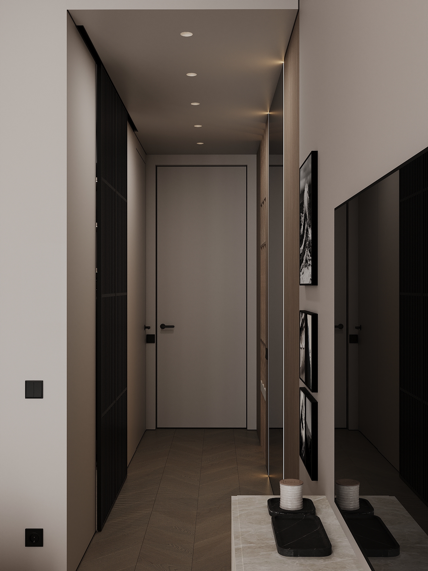 Итог: Результатом стал гармоничный и эргономичный интерьер, где продуманное зонирование с использованием раздвижных систем обеспечивает идеальный баланс между открытостью и приватностью. Квартира предлагает своим владельцам исключительный уровень комфорта, функциональности и эстетической привлекательности.